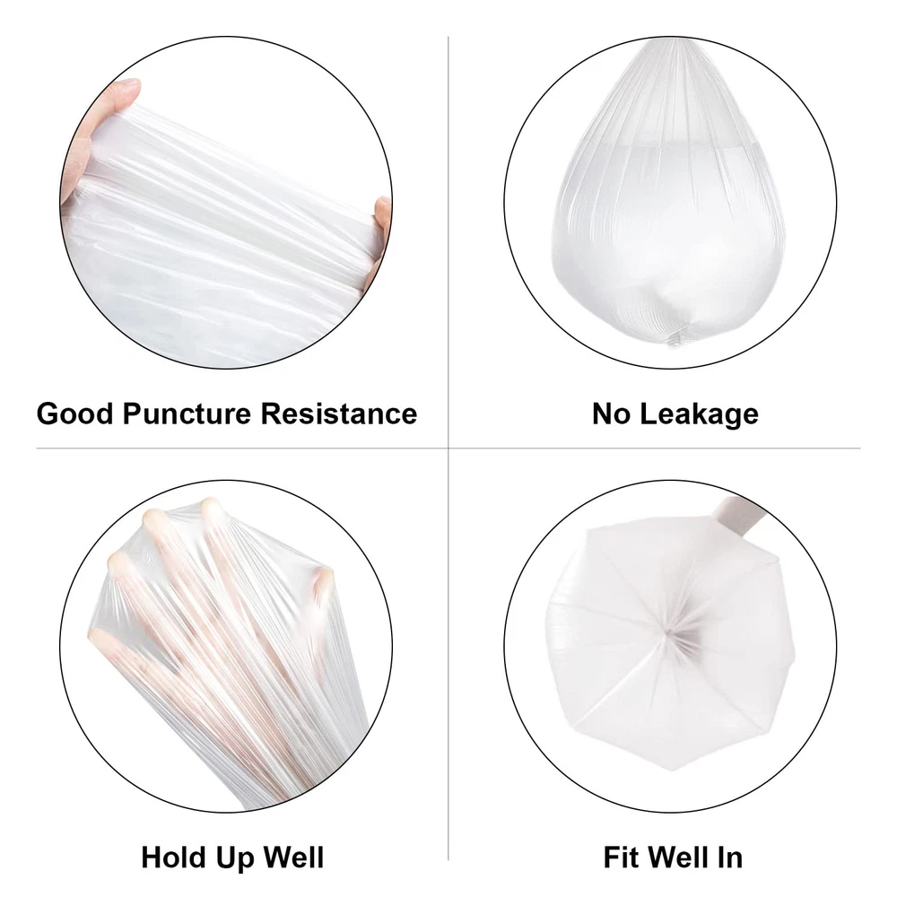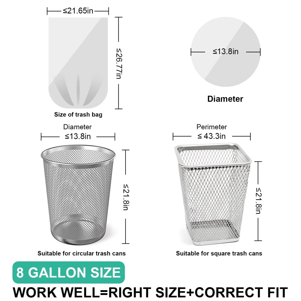 【STRONG & ODORLESS】clear trash bags are sturdy and unscented, making them perfect for storing garments or similar items that won't be affected by odors from other trash can liners. 【 ODOR CONTROL 】clear garbage bags use advanced tech with odor-neutralizing materials to absorb and neutralize unpleasant smells. Confidently tie up your trash without worrying about lingering odors. 【 PERFECT FIT 】 The 8 gallon trash bags are 21.65" x 26.77" x 0.96 mil, perfect for 23 - 30 liter trash bins, including round and rectangular cans. 【VERSATILE USES】 These medium trash bags work well for everyday use in the kitchen, office, car and outdoor. The trash can liners are tear-resistant and won't fall apart. 【CUSTOMER FIRST】 We're here for you. If you have any concerns, our online support team will do whatever it takes to help.