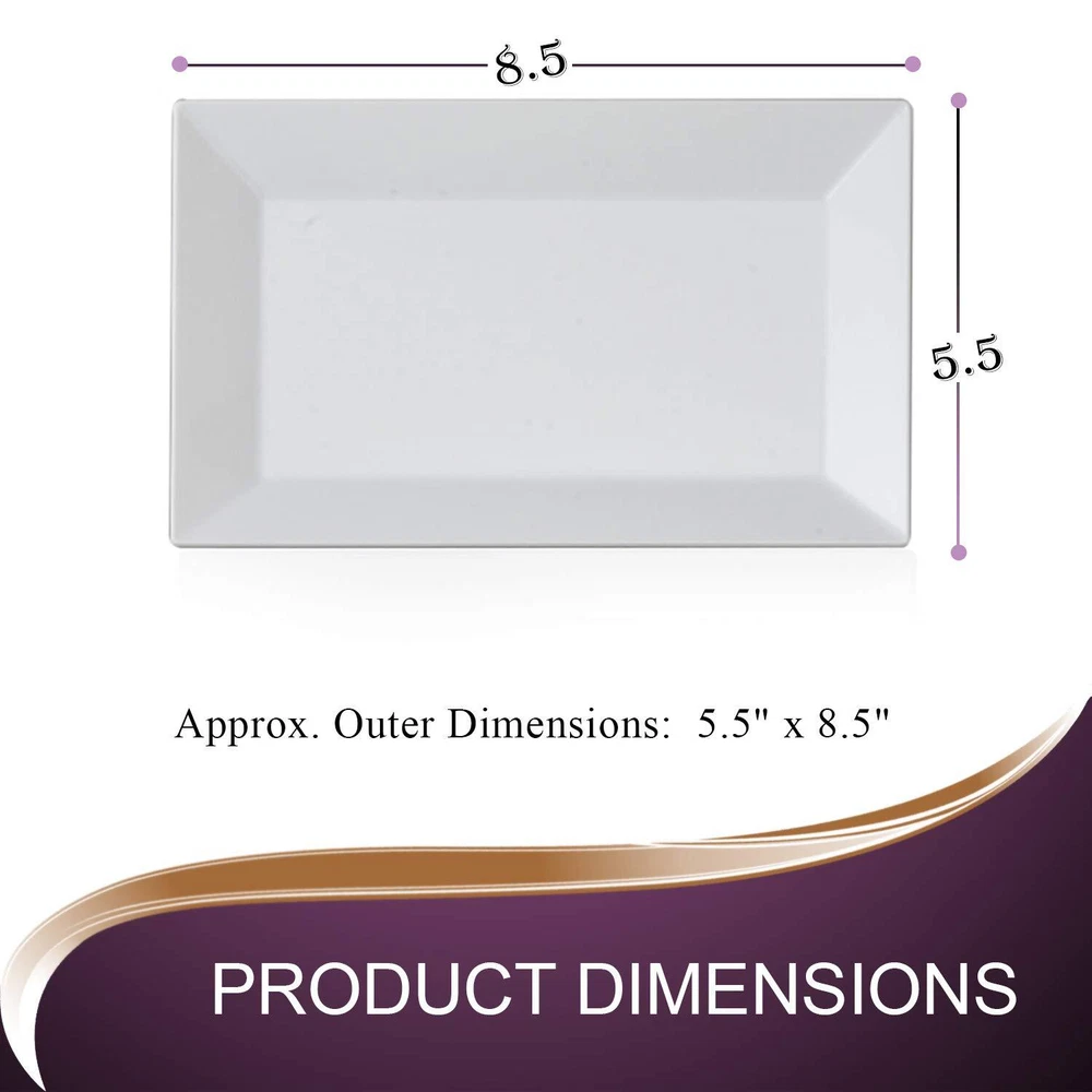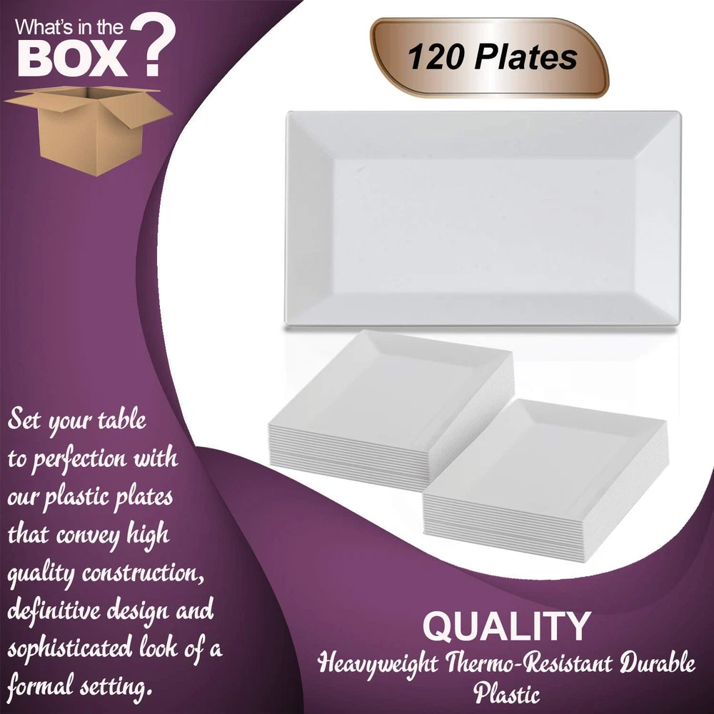 FANCY AND ELEGANT DESIGN – These rectangle white plastic dessert plates add sophistication to weddings, birthdays, and all events. Perfect for serving salads, appetizers, or cakes with style. SERVES 120 GUESTS – This set includes 120 plastic plates, perfect for large gatherings. These party plates make hosting easy with enough dessert plates for every guest. DURABLE AND HEAVY-DUTY – Crafted from premium materials, these plates are disposable yet sturdy enough to handle heavy portions. Say goodbye to flimsy, low-quality plastic plates! CONVENIENT AND DISPOSABLE – Save time and effort with these disposable plates. Enjoy your party without worrying about dishwashing – just toss them after use! PERFECT FOR ALL OCCASIONS – Ideal for weddings, birthdays, and parties, these plastic plates for party settings bring elegance and convenience to your table.