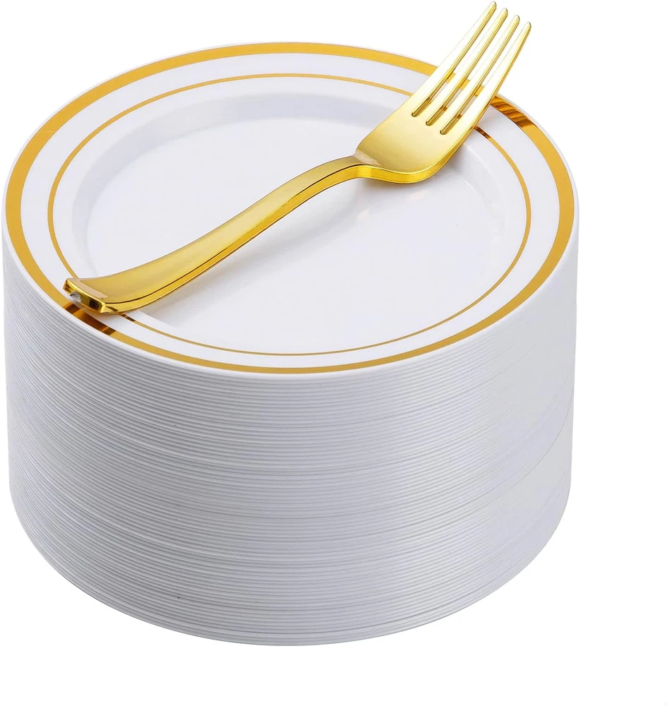 Store New Arrivals Add to Favorite View Feedback Contact 120 Pieces Gold Plates with Plastic Forks, Gold Dessert Plates for 60 Guests, Heavy Duty Disposable Plates for Party, Including 60 7" Plastic Plates and 60 7.4" Plastic Forks Description Item model number 120XYP+DC Style Modern Pattern Solid Embellishment Gold Rim Theme Wedding Number of Pieces 120 Unit Count 60.0 Count Material Plastic Product Name plate set Seasons All Seasons Is Microwaveable No Finish Type Glossy Included Components 60 gold dessert plates and 60 plastic forks Reusability Disposable, Reusable Is Dishwasher Safe No Item Weight 3.1 pounds Material Feature Durable Plastic Occasion Wedding, Christmas, All Occasions, Thanksgiving Special Feature Dairy Use, BPA Free, Durability Color Gold Shape Round Recommended Uses For Product Appetizer, Cake, Desserts, Salad Product Dimensions 10"L x 10"W x 7"Th Product Care Instructions Hand Wash Only Size 60 Guests 100% BPA Free - The disposable plates for party are made of food-grade, reusable plastic that is BPA-free. If you need to reuse the plates, simply wash them with water. NOTE: Plastic plates for party are not recommended for use in the microwave or dishwasher. ELEGANT DESIGN - Gold dessert plates with dessert forks are ideal for serving appetizers, wedding cakes, salads and desserts, snacks, and fruit salads. The gold design of the plates can be matched with a variety of colored dinnerware for all occasions. IDEAL FOR PARTIES - With mini dessert plates, you can easily host a party without worrying about clean-up at the end. You can throw them in the trash after use. These dessert plates are great for weddings, holidays, baby showers, business parties, Thanksgiving, Halloween, and Christmas dining. STURDY & DURABLE - The heavy-duty gold plates are made of hard plastic and are thick enough to hold any food. The gold dinner plates will not scratch easily and can easily handle hot, cold, and wet food without leaks or spills. WHAT'S YOU GET - A convenient 120PCS that includes 60 x 7" round dessert plates and 60 x 7.4" plastic forks. Our disposable plates ensure a hassle-free post-party experience, freeing you to savor moments with family and friends instead of worrying about cleanup. Product Description ABOUT US We offer the best prices around on high quality products. Our E-store includes media such as books, movies, music and games while offering electronics, toys, sporting apparel, clothing, tools, general home, garden items and more. SHIPPING We are always working hard to ensure your package arrives as soon as possible. Please understand that some factors like weather, high postal traffic, and the performance of shipping companies are outside of our control. We offer free shipping to the lower 48 states and ship within 2 business days of payment, usually sooner. We do not accept P.O. Boxes. Please provide a physical address. For shipping outside of the continental USA, we only use eBay's Global Shipping Program.The item is shipped to KY and then sent to the rest of the world. International customers are responsible for all duties and taxes. Continue to check out in order to calculate costs for shipping the item to your country. Messages regarding eBay's Global Shipping Program MUST be directed at eBay EXCLUSIVELY. RETURNS We offer a 30-Day Return Policy on items which you are not completely satisfied with. You have the option for a full-refund or an exchange of the item. No returns are available on items shipped outside of the USA. PAYMENT We accept PayPal. CONTACT US This page content is yet to come Please ad us to your favorite seller and visit again later Thank You CUSTOMER SATISFACTION We try our very best to make sure every customer is completely satisfied. If there's a problem, message us! We're happy to help. WE ACCEPT Copyright © 2021 AutoDS. | All Rights Reserved