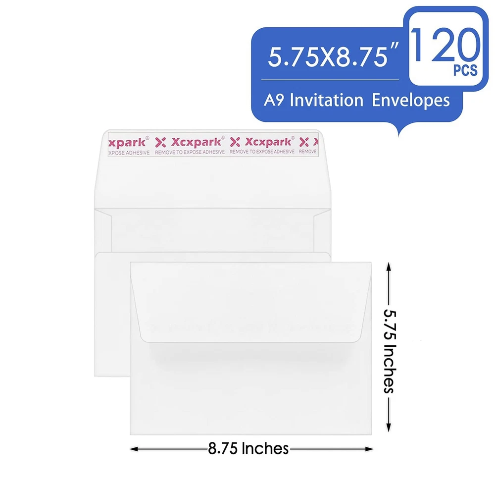 120 Qty Printable A9 Invitation Envelopes for 5.75x 8.75 cards to make your invitation more professional and impressive!You’ll get 100 packs A9 invitation envelopes in dimension of 5.75x 8.75 inches. These invitation envelopes are made of high quality 120GSM white paper with clean look to make your invitation more professional and official.●WIDE APPLICATION - The A9 envelopes are great for invitations, papers, CD, photos, documents, wedding invitation, birthday, baby shower.●EASY TO SEAL AND PEEL - The self seal design offers a strong and convenient sealing without water, glue or licking the envelopes.Why the white envelopes will be a great choice for you?✔Made of high quality 120GSM white paper to stay flat all the time without damage and curl.✔Printable, you can print the content you want to make your invitation more special and impressive.✔Thicken A9 invitation envelopes, totally invisible and never worrying about the contents being exposed.Specification:Material: 120GSM paperDimension: 5.75x 8.75 inchesSealing: Self sealPrintable: YesColor: whitePackage Content:100x Printable A9 Invitation EnvelopesNO RISK PURCHASE - Feel free to us for any issue. 120PACK A9 ENVELOPES BULK - Package includes 120 PCS A9 invitation envelopes in dimension of 5.75x 8.75 inches and it’s with 5.75x 8.75 cards, great A9 envelopes are great for invitations, papers, photos, documents, wedding invitation, birthday, baby shower. HIGH QUALITY MATERIAL - Reject the cheap paper material! All the A9 invitation envelopes are made of high quality 120GSM white paper to keep the cards, papers or documents stay flat all the time, no any damage and curl, the envelopes are made to last. EASY TO SEAL AND PEEL - No water and glue is required, more important, you don’t need to seal the envelopes by licking the envelopes. These A9 envelopes are with self seal design to offer a strong and convenient sealing, while a convenient paper strip for gently to peel. THICK AND INVISIBLE - The invitation envelopes are with thicken design for more wear-resistance to offer a max safety for the inner documents or cards, heavy duty, 120 GSM/32lb BOND/80lb TEXT. Totally invisible to protect your privacy, never worrying about the contents being exposed. WITH PRINTER - Printable A9 invitation paper envelopes, you can print the content you want with your Laser and Inkjet Printers to make the invitation envelopes more professional and delicate, making your invitation more special and impressive.