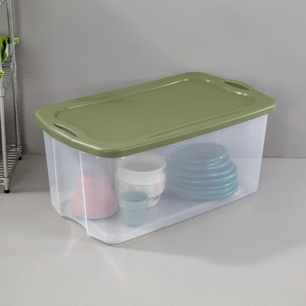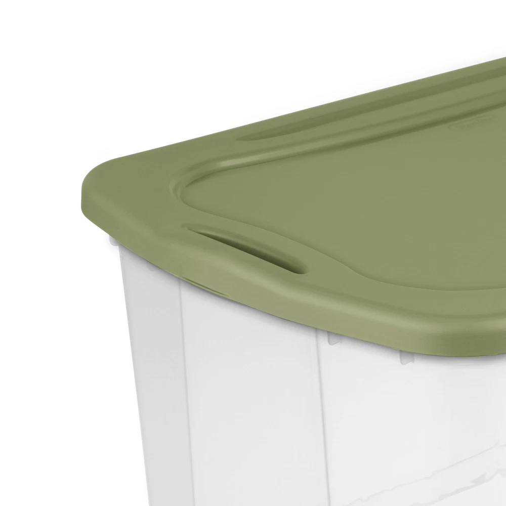 Make moving your storage easier, with innovative line of EZ Carry Storage Boxes and Totes! Unique through handles are designed to provide full grip access for comfortable lifting and carrying, as well as easier maneuvering through doorways, hallways, and up and down stairs. The 120 Quart size is ideal for blankets, sleeping bags, seasonal clothing, sporting gear, and other bigger, bulkier items around the home. The clear base allows for quick viewing of contents, and the recessed lids allow same size storage boxes to stack neatly on top of each other to use vertical storage space efficiently. The 120 Qt EZ Carry Clear Storage Box shares the same lid as the 30 Gallon EZ Carry Tote so the clear and opaque versions can be stacked interchangeably. The overall assembled dimensions of this item are 34" L x 20" W x 15" H. 120 Quart EZ Carry, Clear Plastic Storage Bin, Full-Grip Handles, Green Outside Dimensions: 34" x 20" x 15" Interior Dimensions at bottom: 27 5/8" x 15 7/8" x 14 1/4" Carry through handles allow for full grip access and easier portability Ideal for a variety of household storage needs, with a wide range of sizes The clear base allows for quick viewing of contents Deep recessed lid allows for secure stacking of multiple bases BPA-free and phthalate-free