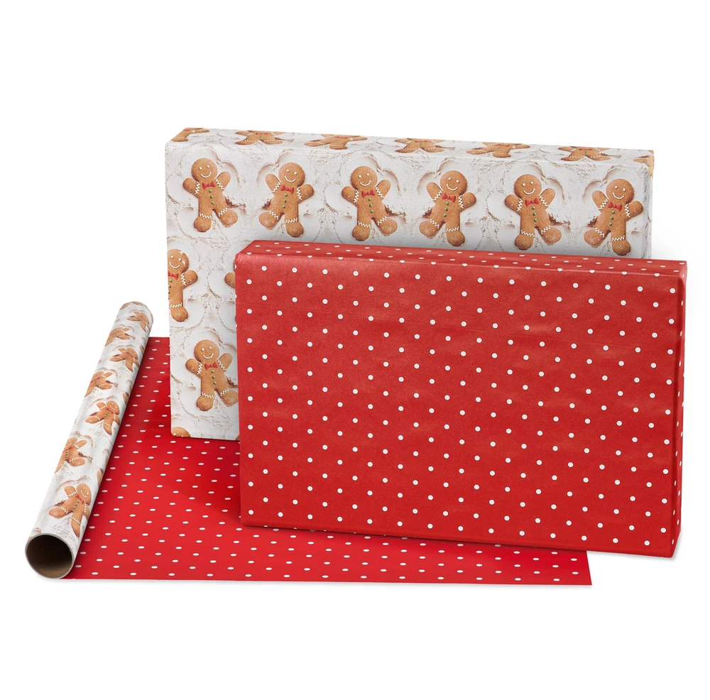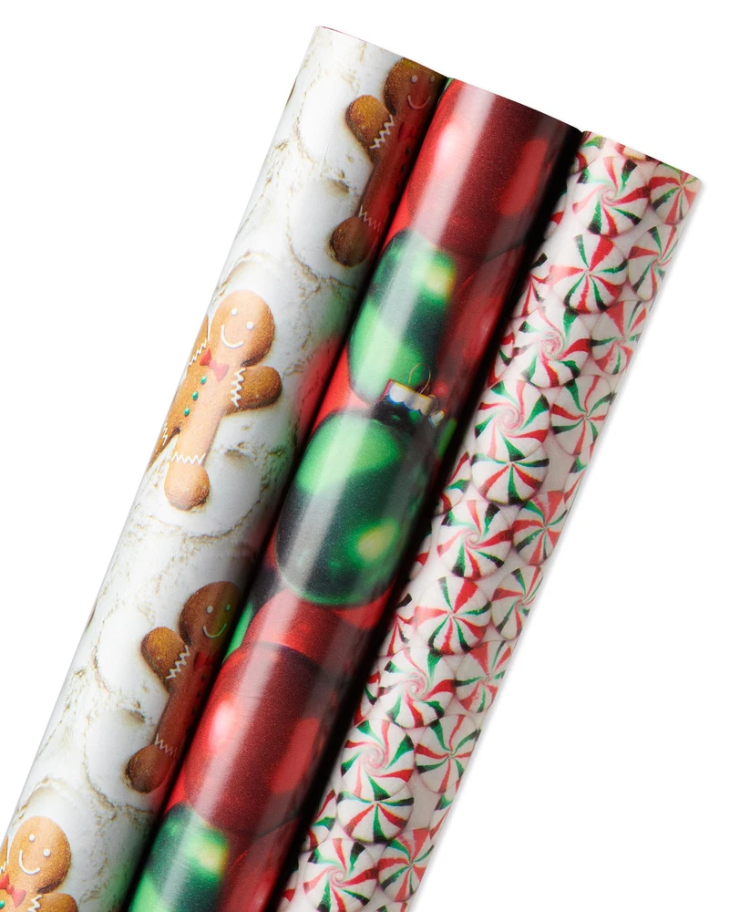 Make holidays ho-ho-ho happy and everyday celebrations extra cheerful with stylish gift wrapping paper! Use the wrapping paper on its own for a clean look or get fancy with gift-wrapping ideas—add a gift tag, tissue paper shapes, ribbons and bows (all sold separately). Or use multiple patterns on one package by creating unique paper folds and pockets that add dimension and offer fun ways to attach a card or small gift. Recyclable wrapping paper is great for crafts, too! With both holiday and winter looks, this two-sided paper design is perfect for Christmas wrap, winter birthdays and any occasion! offers exceptional greeting cards, gift wrap and celebration products so you can connect in ways that fit your personality and authentic style! Includes 3 extra wide rolls of reversible wrapping paper Each wrapping paper roll measures 40 inches wide by 12 feet, 40 total square feet. 3 rolls measure 120 total square feet. Each roll can wrap approximately 8 shirt boxes that measure 14.75 x 9.5 inches x 1.88 inches. Made with heavyweight paper that’s recyclable and assembled in the USA These vintage Christmas wrapping paper rolls feature festive and traditional holiday designs including gingerbread men, ornaments, peppermint candies, candy cane stripes polka dots and lettering. These wrapping paper rolls are the perfect gift packaging option with coordinating designs will add variety and style to your holiday Christmas gift wrapping. Perfect for wrapping kids Christmas gifts, Christmas gifts for family and more!