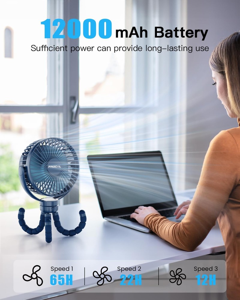 INCREDIBLE 65-HOUR BATTERY LIFE, USB RECHARGEABLE FAN: Our battery powered fan built-in 12000mAh rechargeable battery, its battery will last anywhere from 12 to 65 hours depending on the fan speed setting. Simply charge it through a USB port from a power bank, pc, hub, outlet, etc. This flexible tripod fan is compact, lightweight, and gives an impressive cooling effect. USE AS BACKUP POWER BANK, POWERFUL&PRACTICAL: Are you worry that your phone is going to run out of power while you are outside? Don't worry about it anymore! Our small fan could use as a backup power bank for your electronic devices, such as smartphones, laptops. This mini fan is compact&lightweight, take it on the go, perfect for the car seat, baby stroller, golf cart, beach, camping, gym, travel, and other outdoor activities. Our battery powered fan is your must-have summer gadget! IMPROVED COOL AIRFLOW, MIGHTY YET QUIET BRUSHLESS MOTOR: Small but sturdy, this small portable baby fan has three different speeds, designed to keep your baby cool without an irritating noise. Its powerful 5000RPM turbo motor, giving you an instant breeze of up to three meters. Mighty yet quiet fan for baby stroller, bed, office, home. Now is the time to invest in a decent portable fan that will keep you cool all summer long. THREE ADJUSTABLE SPEED, 360° ROTATION, COMPACT, AND LIGHTWEIGHT FAN, FRIENDLY TO MOMMIES AND BABIES: This flexible tripod fan offers complete 360 vertical and horizontal rotations so you can direct the wind at an appropriate speed to any direction you need. The grid openings on the back and front are smaller than others, no need for concerns of little fingers making their way through the back of the fan to touch the blades. HIGH-END QUALITY, 300 DAYS WARRANTY, BUY WITH HASSLE-FREE: This is a multi-purpose USB rechargeable fan that combines clip on fan, handheld fan, small desk fan, and stroller fan in one. Its bendable legs give the option to attach this small fan wherever is available - Hold it, fix it, hang it, and fold it. No doubt this is the best all-rounder battery-operated colling fan. We also provide you with the finest customer service.
