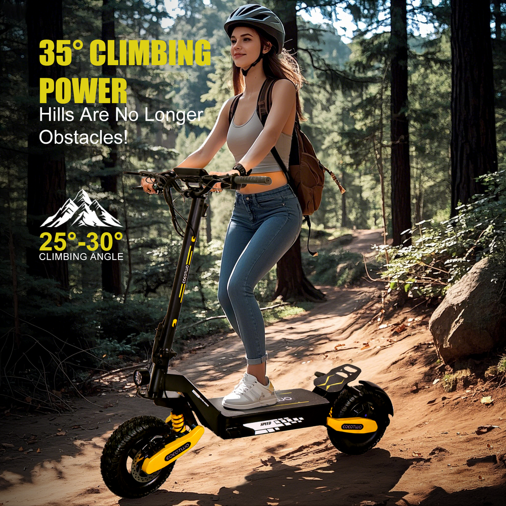 ⚡.POWERFUL PERFORMANCE ・1200W High-Torque Motor: Tackles 25-35° inclines effortlessly. ・3-Speed Modes: Eco (15.5 MPH), Comfort (21.7 MPH), Sport (28.6 MPH). ・Extended 20-Mile Range: Powered by a 48V13AH battery (4-5 hr charge time). 🛡️ PREMIUM SAFETY & CONTROL ・Dual Disc Brakes: Responsive front/rear braking for all-weather reliability. ・6eyes-LED Headlight + Eagle Eye Taillight: Enhanced visibility with brake-responsive lighting & sequential turn signals. ・Wide 11" Off-Road Tires: Vacuum tubeless tires absorb shocks on rough surfaces. 🚜.COMFORT ENGINEERED DESIGN ・Dual Spring Suspension: Smoothes out bumps on roads or trails. ・Ergonomic Bike Handlebars: 39.76" adjustable height fits all riders. ・Anti-Slip Deck: 19.68" x 9.05" aluminum platform with grip tape. 🔒. SMART PORTABILITY ・One-Second Folding: Locks into compact 48"L x 26.3"W x 22"H for storage. ・Lightweight Yet Sturdy: Aircraft-grade aluminum frame (Net: 68.2 lbs; Max Load: 330 lbs). 👧👨USER-FOCUSED EXTRAS ・Upgraded LED Dashboard: Real-time speed, battery, and mode tracking. ・Stealth Horn & Key Lock: Anti-theft security ・Weather-Resistant Build: IP54-rated components (avoid heavy rain). 🛠️Included Accessories: 2x Brake Pads, Toolkit, Moisture Proof Bag, US 3A Charger, Manual. 📦 Box Dimensions: 49.6” x 10.23” x 21.25” (Reinforced Carton + Wooden Frame). Compliance Notes for Walmart Speed/Range Claims: Clearly state test conditions: "Range/Speed may vary based on rider weight, terrain, and temperature." Safety Warnings: Include: "Always wear a helmet. Check local laws for e-scooter usage." Battery Compliance: Specify: "Certified UL/CE battery included. Do not disassemble." 🏋️♂️ Weight Limits: Emphasize: "Max load capacity: 330 lbs. 🎁Unlock Freedom: GT06 Electric Scooter - The Ultimate 18th Birthday Gift!" More Than a Gift:✓ First taste of responsibility (Key-lock security)✓ Campus commute revolution (20-mile range)✓ Adulthood’s first epic ride (0-28MPH in 3 speeds) UL 2849 certified for all items in our store. On Jul 8, 2025 at 05:23:40 PDT, seller added the following information: