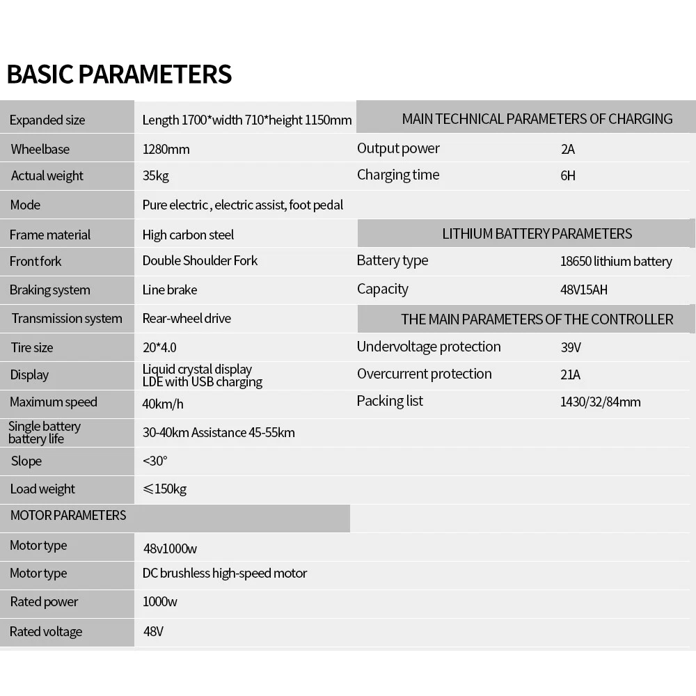 Unboxing Installation Video: Q20MINI 1000W-15Ah: https://www.youtube.com/watch?v=ajsd4_F8BNQ 【Conquer Mountains】 - The Risdtar q20 Lite electric bike features a powerful 1000W motor , allowing you to effortlessly reach a top speed of 28 MPH and climb slopes up to 30°. This brushless motor provides high torque while maintaining low power consumption and quiet operation. The professional 7-speed transmission system instills confidence as you cross mountains, rocks, rivers, and deserts. 【Long-Lasting Battery Life】 - Equipped with UL-certified 48V 15Ah capacity removable battery, the q20 Lite can travel up to 50 miles with pedal assist or up to 30 miles with electric power alone. You have the option to charge the ebike directly or remove the battery to charge at home. The battery can be fully charged in just 4-6 hours, ensuring you spend more time on the road and less time waiting to ride. 【Ideal for Daily Commuting】 - The q20 Lite e-bike has 20" shock-absorbing pneumatic tires, front and rear suspension fork, 5-level LCD display, ergonomic sport seat, front and rear disc brakes, and ultra-bright LED headlight. With these features, it's perfect for daily commuting, conquering any terrain and carrying a maximum load of 300 lbs. Suitable for riders 5.4-6.4 ft tall. 【All-Weather & All-Terrain Performance】 - Say goodbye to heavy traffic and crowded buses or subways during workdays. Save time and money as you cycle across bike lanes. On weekends, this e-bike can take you away from the chaos of the city. You can enjoy the natural beauty and conquer less-traveled roads in any weather and on any terrain. This ebike is built to handle any challenge. Basic parameters (MINI Version) Expanded size: length 1710*width 850*height 1080mm Wheelbase: 1180mm Actual weight: 42kg Mode: pure electric, electric assist, pedal Front fork: hydraulic front fork Braking system:Front and rear mechanical disc brakes Transmission system: rear drive Tire size: 20*4.0 Maximum speed ≤40km/h Endurance 55km Slope <30° Load weight≤150kg Motor parameters: 48v1000W Motor type: DC brushless high-speed motor Rated voltage 48V Main technical parameters of charging Output power 2A Charging time 4-6H Lithium battery parameters Battery type: 18650 lithium battery Capacity 15AH The main parameters of the controller Undervoltage protection: 39V Overcurrent protection: 28A Packing list Electric bicycle*1 Battery *1 Bicycle bags*1 Fenders*2 Multi-function tool*1 round headlight*1 Charger*1 Pedal*1 The item is UL 2849 certified with a link to the UL Product iQ < https://productiq.ulprospector.com/en >