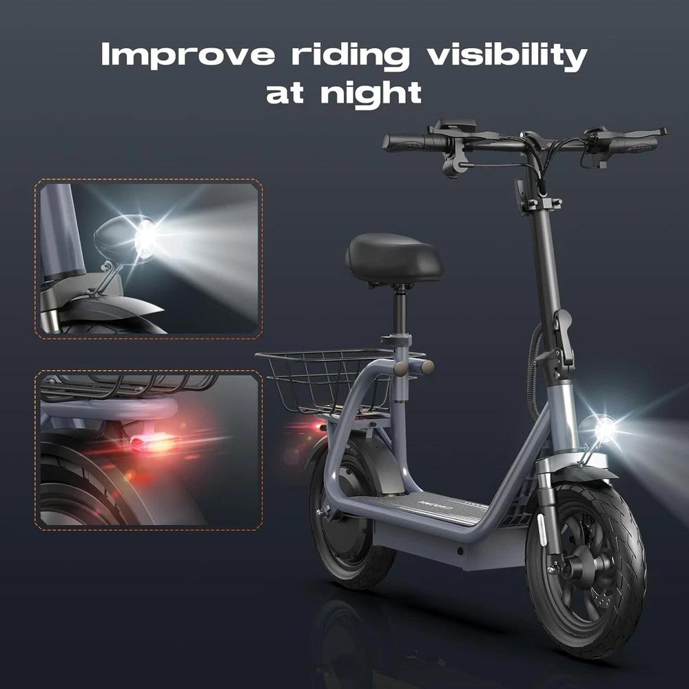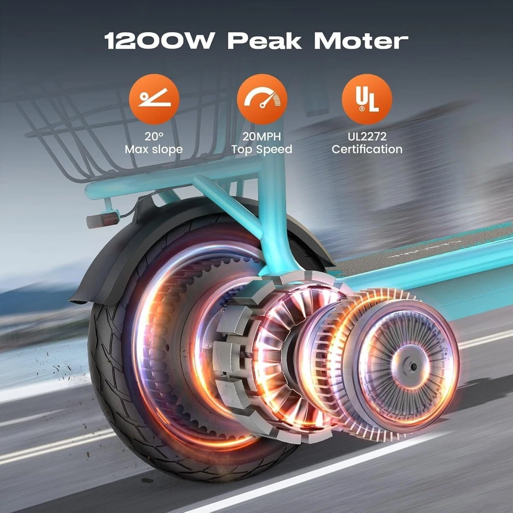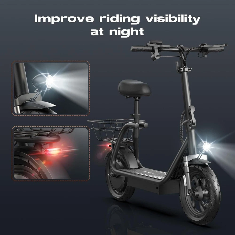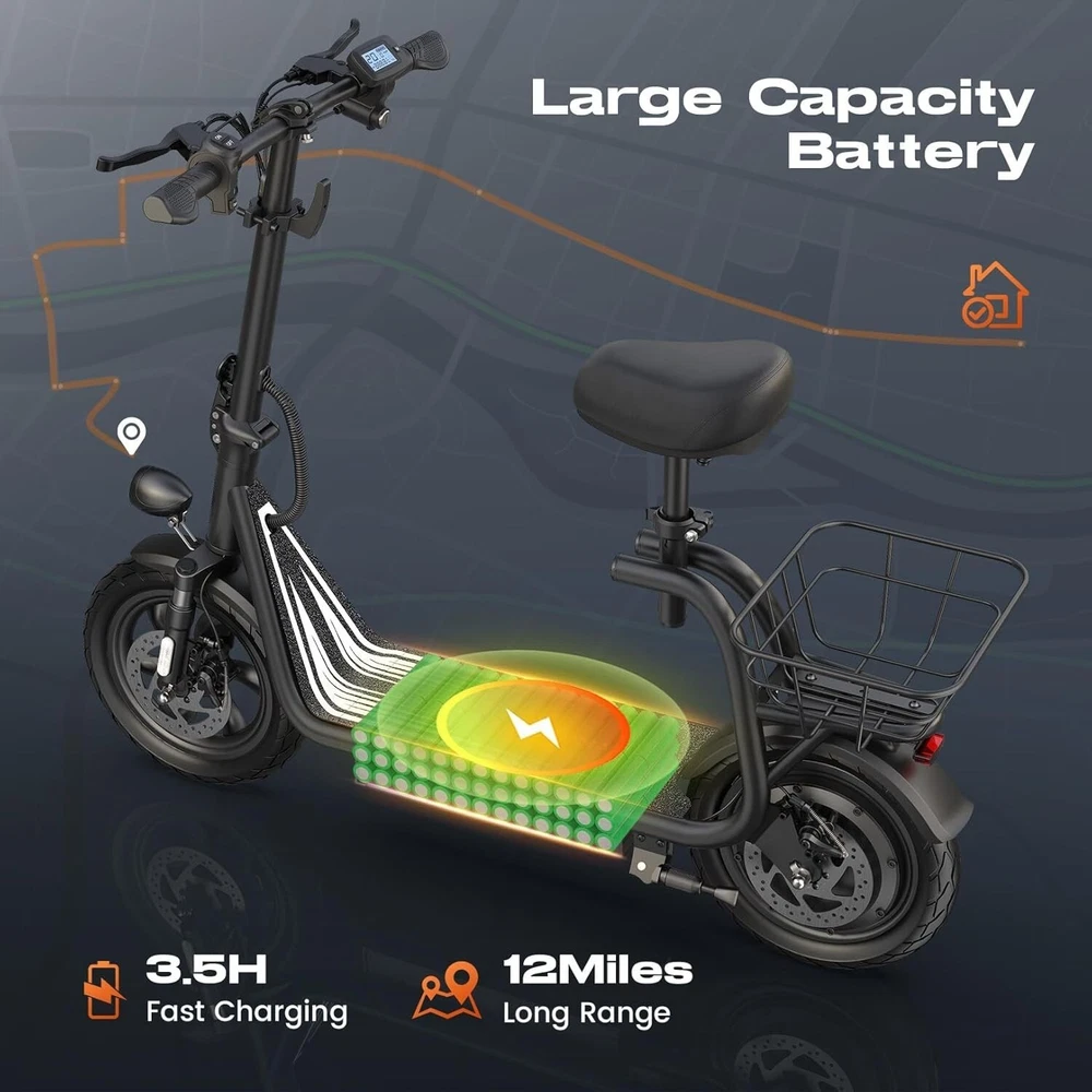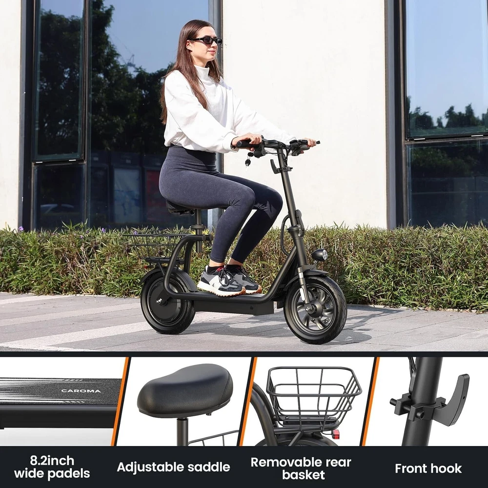 Product Description About this item 【48V Battery and Peak 1200W Powerful Motor】The electric scooter for adults is equipped with a 48V/10.4Ah battery, which can last for a long time without frequent charging, with a maximum range of up to 30 miles and a maximum speed of 20mph, and it only takes 7 hours to fully charge. The motor has a peak power of up to 1200W and can easily climb a 30-degree slope, making it very suitable for short-distance commuting 【LED Display and 3 Speed Modes】The electric scooter adults is equipped with an LED high-definition display, which can clearly display: speed mode, battery power, current speed, and mileage during the day and at night. The caroma scooter uses a half-turn handlebar design, getting rid of the traditional full-grip speed control mode to ensure riding safety; the scooter has 3 different speeds for you to choose, giving you a better riding experience 【Excellent shock-proof suspension and brake system】This electric scooter with seat for adults has an excellent shock absorption system composed of headlights and taillights, electronic horns, front forks and sensitive double disc brakes, which can brake quickly, safely and stably; durable one-piece wheels and thick steel frame can withstand high-intensity pressure, with a maximum load-bearing weight of 265 pounds, suitable for heights of 3'11"-5'11" 【 Foldable Electric Scooter with Seat】Caroma electric scooter is equipped with an 8.27-inch wide deck, a soft seat that can be adjusted according to different heights, and a storage basket on the back seat; the front of the vehicle is compact and foldable, making it easy to store in a car trunk or other small space 【Caroma Electric Scooter After-Sales Support】Caroma electric scooter with Seat is UL 2272 certified. This detachable electric scooter is 90% assembled and comes with instructions and installation tools, making installation very easy. If you encounter any problems, such as motor failure, charging problems, or missing accessories, please contact us in time