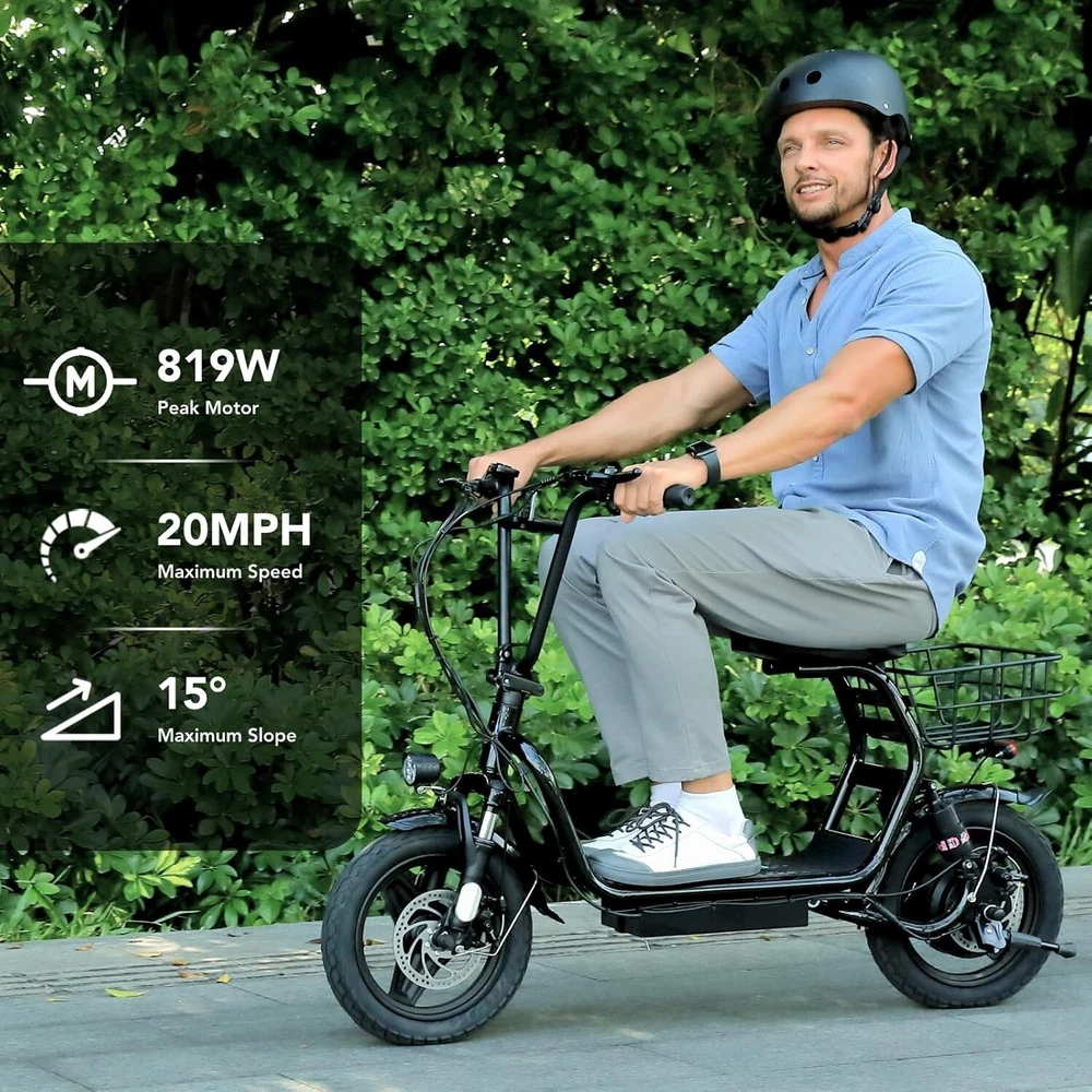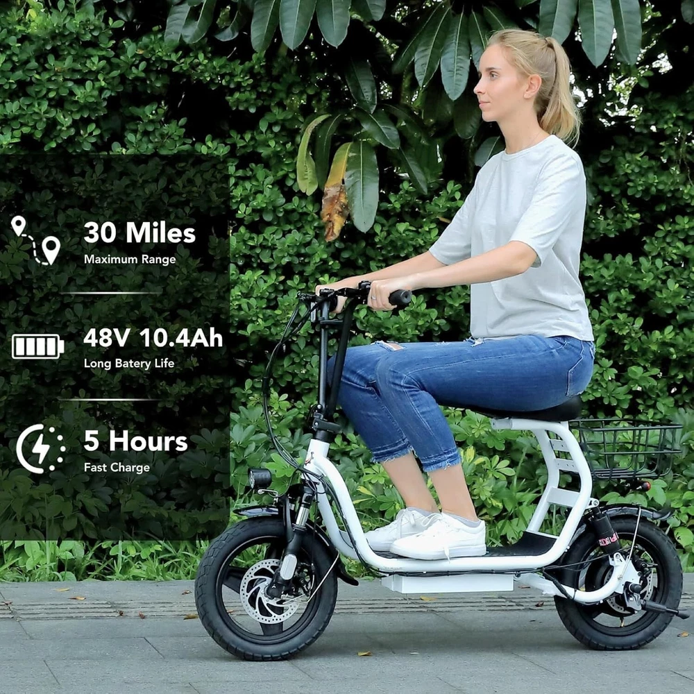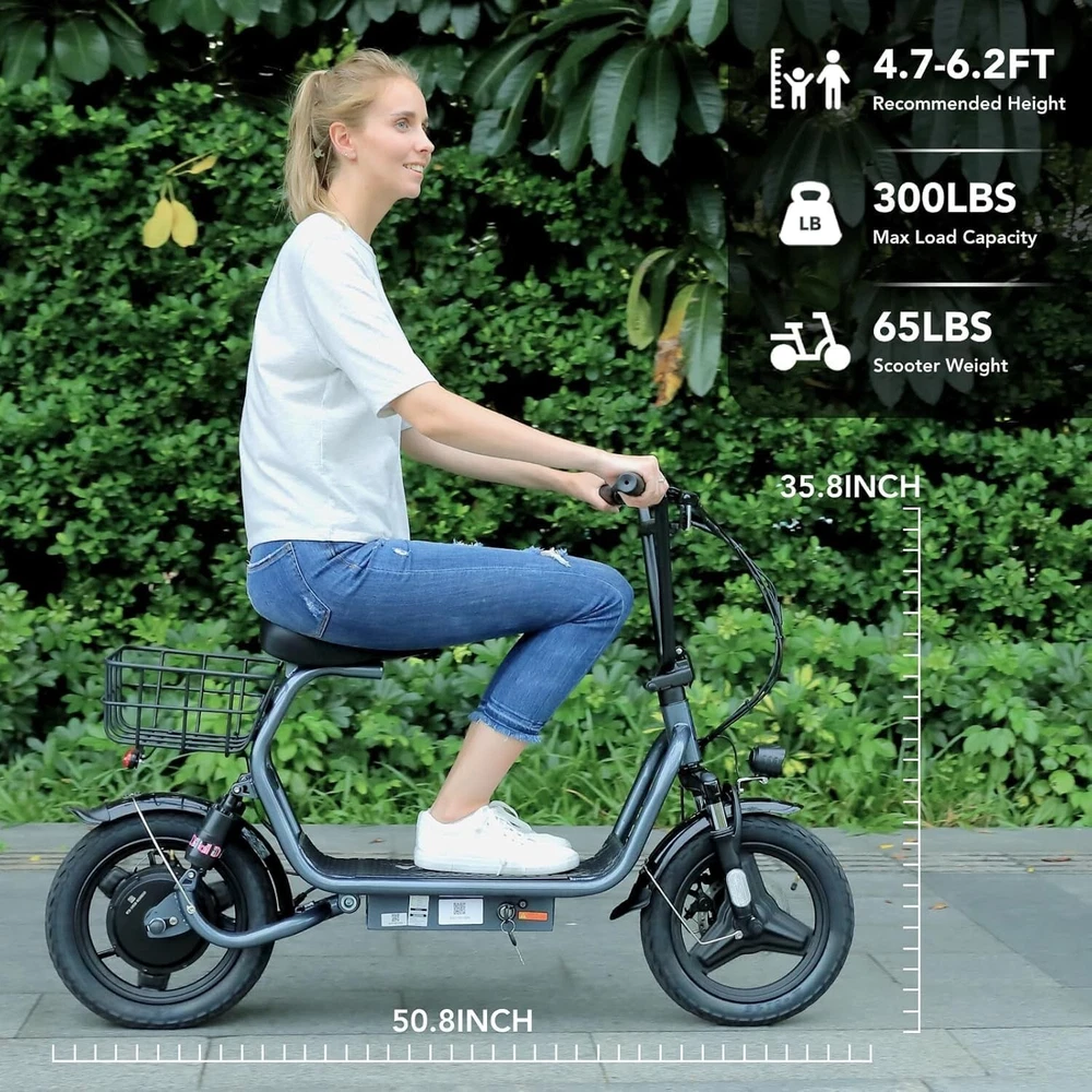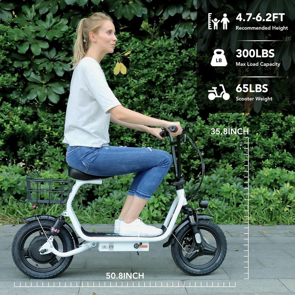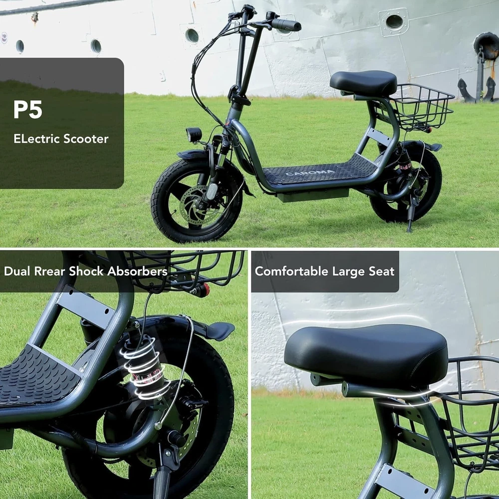 Product Description About this item 【1200W Electric Scooter & 48V 10Ah Battery】adult electric scooter comes with a 750W powerful motor(peak to 1200W) that delivers max speeds of up to 20 mph and a 20% hill grade climbing ability. The large capacity 48V lithium battery with regenerative braking gives you a range of up to 30 miles, which is ideal for anyone who wants to commute short distance for school or office and give the adults an active lifestyle. 【Multiple Suspension and 14" Fat Tires】The e scooter comes with multiple shock absorptions (front, rear suspension, and seat shock) that significantly reduce shock, making your ride more comfortable and stable. The 14" large pneumatic tires have excellent grip, high elasticity, and wear resistance. Meanwhile, this adult scooter comes with a large, soft seat and an extra-wide non-slip deck to make long rides a breeze. 【Foldable & Safe Electric Scooter Adults】This motorized scooter has folding design for increased portability and safety features like responsive and effective dual drum braking systems, bell, headlight and red tail-light, making it a portable electric scooter for commuting. It also has durable one-piece wheel hubs and a high-strength steel frame with a good weight capacity. The compact folded size makes it easy to store in car trunks and other tight spaces. (NOTE: Max load 300lbs) 【Smart Electric Scooter with Seat】 The P5 is an electric commuter scooter designed for adults. It has a basket above the rear wheels and can carry up to 30 pounds, making it ideal for quick errands and shopping. This electric scooter also features an LCD display that clearly shows the real-time power level of the ride. Meanwhile, the handle-mounted throttle allows you to control your riding speed easily and precisely. Electric Scooter with Seat & Basket The adult electric scooter is versatile and convenient, making it suitable for riders of different ages and experience levels.