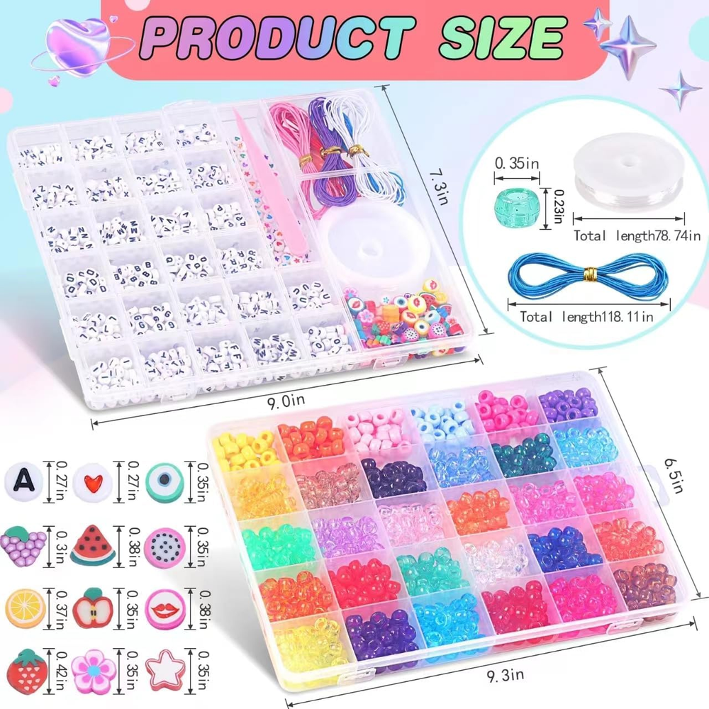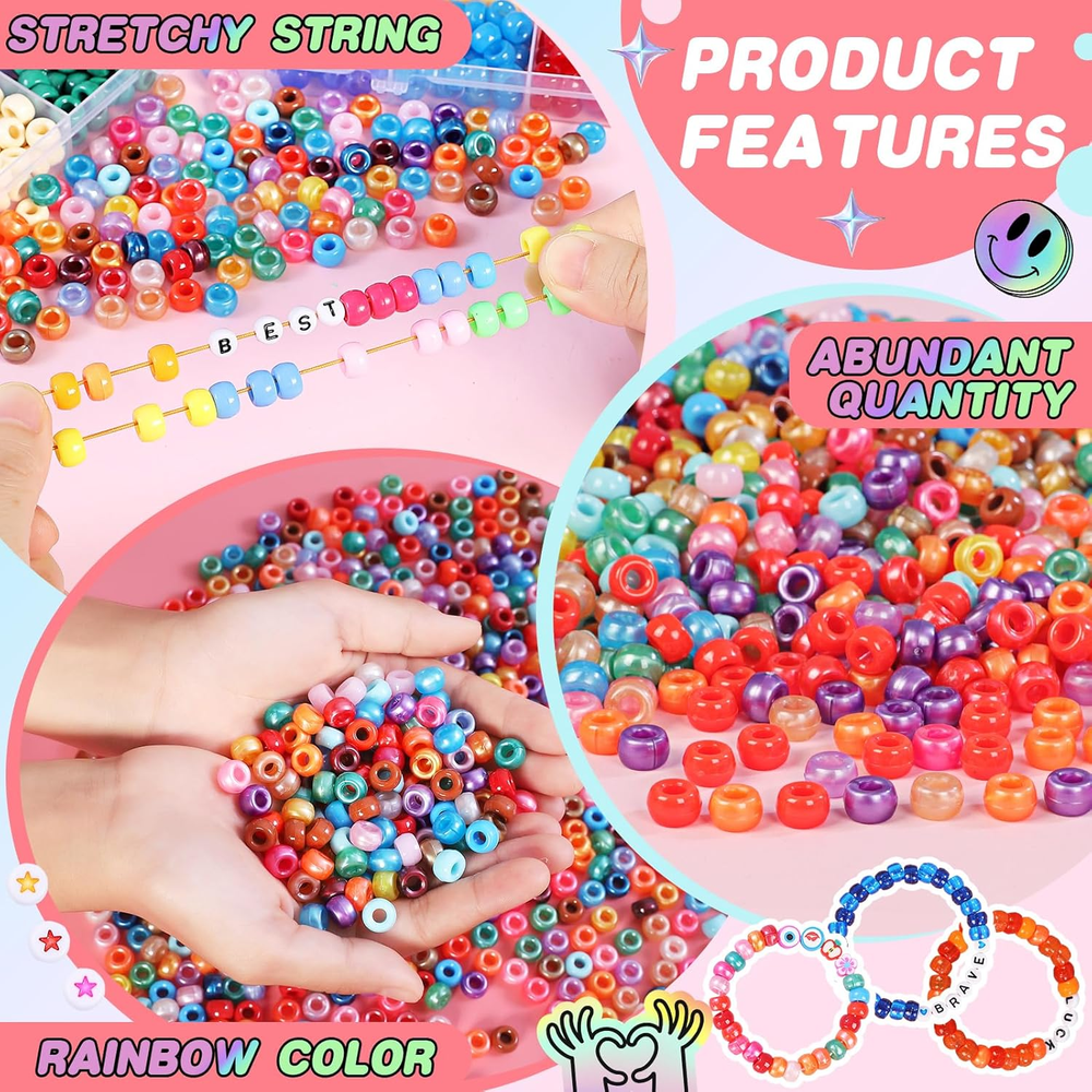 Bracelet making kit: You will receive 5 boxes bracelet making kit contains about 3600 pcs pony beads in 120 colors, about 60 pcs clay beads, 780 pcs letter beads , 60 pcs flat heart and star beads and so on, 7 rolls of strings, a scissors and a tweezers. Quality and vibrant beads: The pony beads for bracelets have 120 iridescent colors in all, and are made of premium materials with smooth surface and accurate 4 mm holes for easy stringing, waterproof, not easy to fade. Wide application: The bracelet making kit for girls 6-12 are very suitable for making necklaces, bracelets, hair braids, earrings, pendants, keychains, phone lanyard and other interesting DIY crafts like beaded pets, etc. Ideal for gift-giving: Our friendship bracelet making kit is warm gift for girls and adults, so it is a perfect gift for your families, kids, friends, teachers and colleagues at birthday, Christmas, Thanksgiving and Mother's and Children's Day! Great for festival: The pony bead kit is suitable for various festivals, by matching the color of the beads, highlighting the theme color, you can create a strong festival atmosphere. For example, the theme of St. Patrick's Day is green, and Christmas is green, white and red, etc. Product Description AMDBHC 5 Boxes Pony Beads For Friendship Bracelet Making Kit A must-have for DIY enthusiasts looking to create beautiful bracelets and jewelry pieces. Our bracelet making kit is designed with a focus on versatility, quality, and creativity, making it ideal for crafters of kids and adults. Inside this jewelry making kit, you will find everything you need to get started on your bracelet making journey. With over 3600 pcs sturdy pony beads in 120 assorted vibrant colors, the creative possibilities are endless. These lightweight and sturdy plastic beads are perfect for making bracelets, hair braiding, DIY crafts, and jewelry projects. Whether you are a beginner or experienced crafter, our bracelet making kit ensures a seamless crafting experience. The included organizer box keeps your beads neatly stored and organized, which will provide you with great convenience. Perfect for various occasions, our pony beads making kit is suitable for creating friendship bracelets. The high-quality materials ensure that your creations will stand the test of time, making them perfect for gift-giving or personal use. Bring out your inner artist with the AMDBHC bracelet making kit today and explore the endless possibilities of bead crafting. Transform simple beads into stunning accessories with ease and let your creativity shine through.