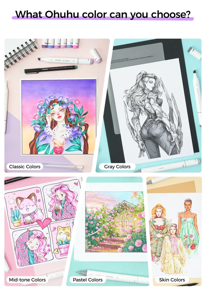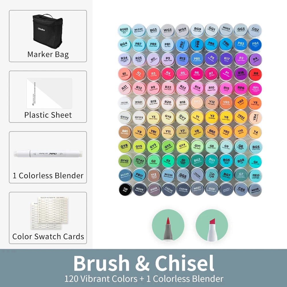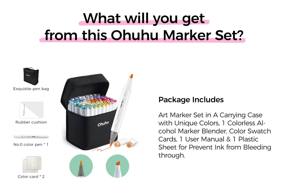 Main Featrues 【Honolulu Series】BRUSH & CHISEL , DOUBLE-TIP, DOUBLE THE FUN Widen your artistic horizons with the dual-tip marker design! Choose the brush tip for sweeping, calligraphic strokes or quickly color in large areas with the wide chisel tip. What's more, now Ohuhu replacement brush tips is available, so you can easily replace the worn-out tips to ensure consistent and precise lines whenever you create. The only limit is your imagination 【Honolulu B Series】BRUSH & FINE , DOUBLE-TIP, DOUBLE THE FUN Widen your artistic horizons with the dual-tip marker design! Choose the brush tip for sweeping, calligraphic strokes or the fine tip for details. What's more, now Ohuhu replacement brush tips is available, so you can easily replace the worn-out tips to ensure consistent and precise lines whenever you create. The only limit is your imagination REFILLABLE INK FOR A LIFETIME OF CREATIVITY With 51 Ohuhu popular colors available for refills now and more on the way, your creativity knows no bounds. Enjoy a wide range of hues and keep your markers going for years to come. Whether you're exploring the rich colors of Honolulu, Oahu, the Kaala, or the bold hues of Molokai Series, they are refillable now. Switch between sets seamlessly and unlock endless artistic possibilities SEAMLESSLY BLENDING Say goodbye to unsightly splotches and uneven coloring. Our high-quality ink seamlessly blends to create beautiful, professional-grade artwork, perfect for both beginners and experienced artists; Also, no more frustrating smudges or wet ink ruining your work. Our alcohol-based ink dries quickly, ensuring that your art is always clean, crisp, smudge-free, and ready to display 120 VIBRANT COLORS + 1 COLORLESS BLENDER The rainbow is at your fingertips - choose from 120 brilliant colors and bring your ideas to life. The color spectrum is yours to explore with 120 brilliant shades to choose from, plus a colorless blender for better blending effects. From coloring books to professional masterpieces, our brush markers will breathe life into your artwork EASY IDENTIFICATION, ORGANIZATION & PORTABILITY Don't waste time searching for the perfect color. Our markers come with color-coded caps to keep you organized and efficient. Plus, the free carrying case makes these markers perfect for any coloring adventure or as a thoughtful gift for any artist Product Description