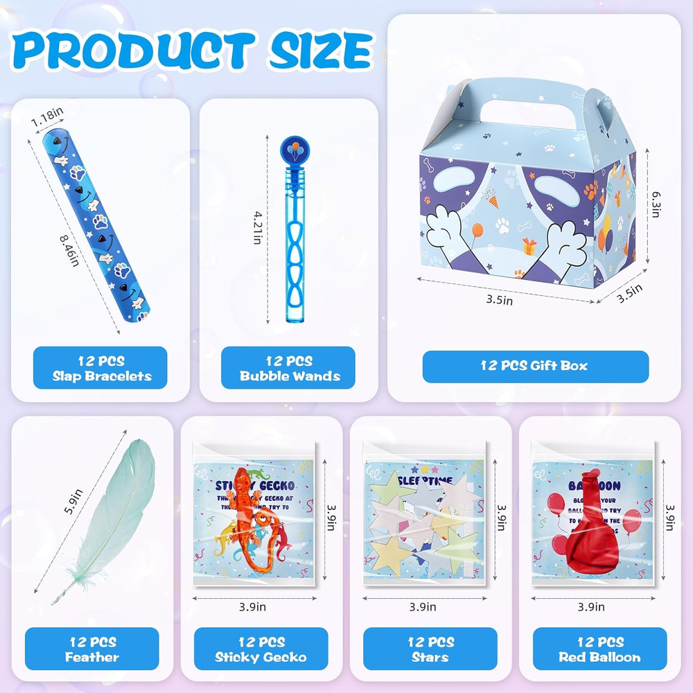Store New Arrivals Add to Favorite View Feedback Contact Fast deliveries to the customer's home Quality customer service John Make the customers happy! 120Pcs Blue Color Dog Party Favors,Birthday Decorations Supplies for Kids,Sticky Gecko,Red Balloon with Cards Goodie Bag Stuffers,Classroom Rewards,Pinata Stuffers,Family Games Description Pefrect Party Favors - Our Set includes 12 Slap bracelets,12 Gift boxes ,12 Feather,12PCS Bubble wands(with bubble wand mini stickers,you can match your own bubble wand),12 red balloons and 12 sticky gecko,12 pack of stars(You need to put the balloon, the gecko, the star and three different cards together into a transparent bag.) Wide Application - Perfect for children's birthday parties,or any special occasion, these favors are designed to spark happiness and laughter among kids and adults alike.Create unforgettable memories with the lovable characters and make your event truly special! Reliable Materials - The party supplies are made from safe materials, non-toxic and no harm,kids can use them with confidence. Dog Paw Design - Transform your celebration into a filled adventure with our exclusive range of blue color dog party favors. These unique items not only serve as delightful surprises for your guests but also add a touch of charm to your party decor. Customer Service - We are committed to providing quality products and services.Support refund or resend for any missing or damaged parts in your package.If you have any questions, please feel free to contact us, we will reply within 24 hours. Product Description Party Favor Pack – The Perfect Goodie Bag for Your Little Party Kids! Make your party unforgettable with the Party Favor Pack! Packed with fun and excitement, these adorable toys are the perfect way to thank your little guests for joining the celebration. Convenient and Ready to Go No need to assemble – just fill the bags and hand them out! Great Value: Get everything you need in one affordable pack, perfect for any party size. Sticky Lizards Toys Night-luminous stars Red balloons Make Your Party Pawsome! With the Party Favor Pack, you’ll send your little guests home with a piece of the fun. These goodie bags are sure to be a hit, leaving everyone talking about your amazing party for weeks to come! Item dimensions L x W x H 5 x 3 x 0.7 inches Product Dimensions 5 x 3 x 0.7 inches Material Plastic Country of Origin China Item Weight 2.12 pounds Theme Blue Manufacturer recommended age 6 years and up Age Range (Description) 3 Years old+ Occasion Birthday ABOUT US We offer the best prices around on high quality products. Our E-store includes media such as books, movies, music and games while offering electronics, toys, sporting apparel, clothing, tools, general home, garden items and more. SHIPPING We are always working hard to ensure your package arrives as soon as possible. Please understand that some factors like weather, high postal traffic, and the performance of shipping companies are outside of our control. We offer free shipping to the lower 48 states and ship within 2 business days of payment, usually sooner. We do not accept P.O. Boxes. Please provide a physical address. For shipping outside of the continental USA, we only use eBay's Global Shipping Program. The item is shipped to KY and then sent to the rest of the world. International customers are responsible for all duties and taxes. Continue to 'check out' to calculate costs for shipping the item to your country. Messages regarding eBay's Global Shipping Program MUST be directed at eBay EXCLUSIVELY. RETURNS We offer a 30-Day Return Policy on items in which you are not completely satisfied with. You have the option of a full-refund or an exchange of the item. No returns are available on items shipped outside of the USA PAYMENT We accept PayPal. CONTACT US This page content is yet to come Please ad us to your favorite seller and visit again later Thank You CUSTOMER SATISFACTION We try our very best to make sure every customer is completely satisfied. If there's a problem, message us! We're happy to help. WE ACCEPT