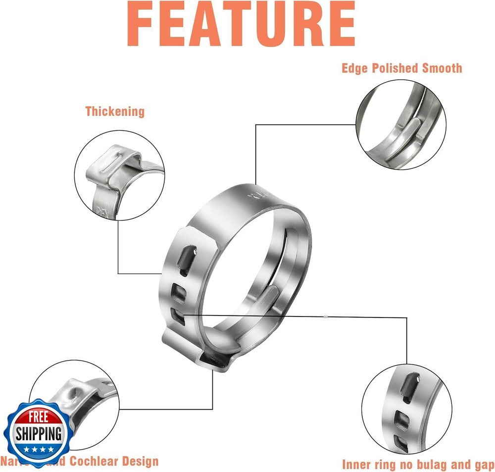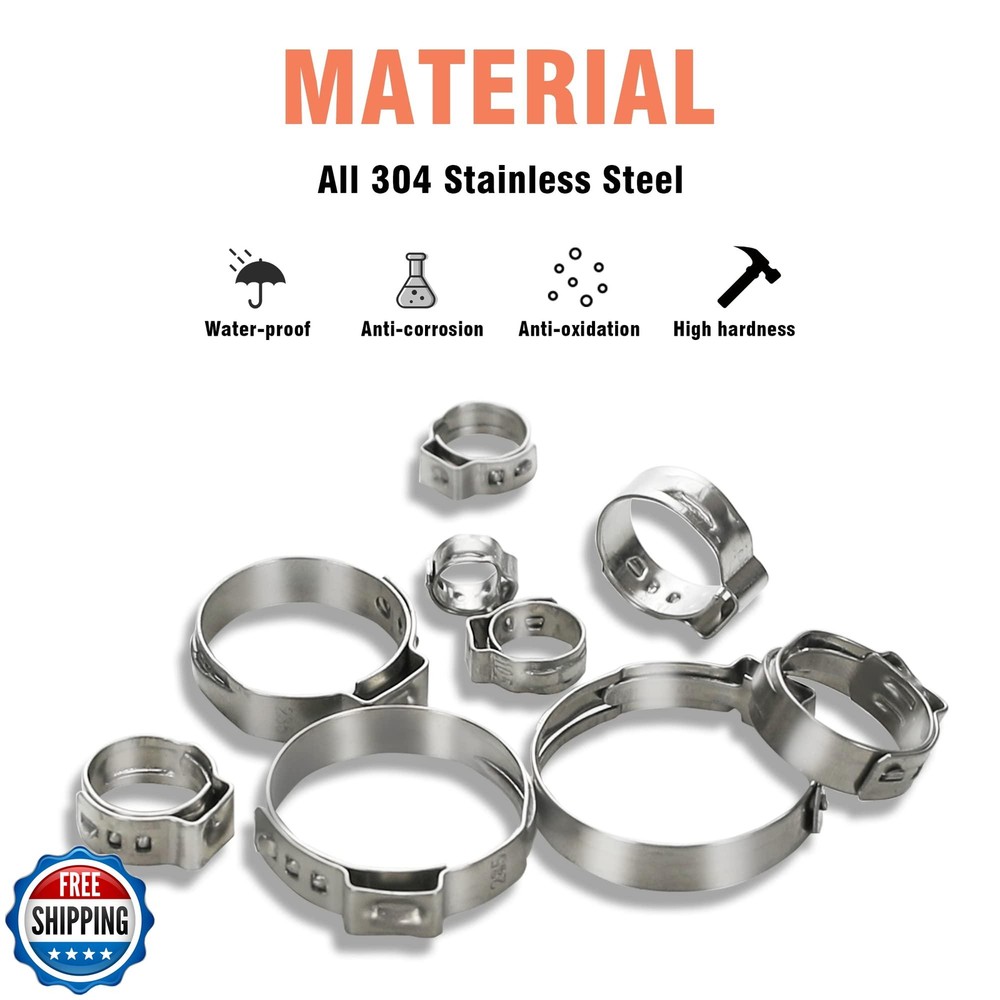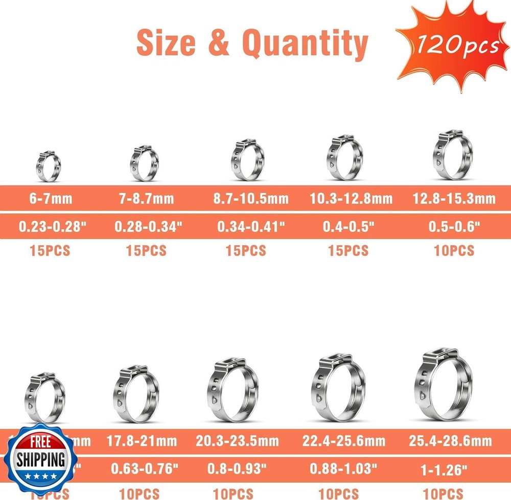 WYSIWYKA 120 PCS 10 Sizes Single Ear Hose Clamps, 6-28.6mm 304 Stainless Steel Crimp Hose Clamp Assortment Kit, Stepless Hose Clamps Cinch Rings for Securing Pipe Hoses and Automotive Use Features 【Complete Specifications】120 pieces single ear hose clamps set covers 10 common sizes: 6-7 mm, 7-8.7 mm, 8.7-10.5 mm, 10.3-12.8 mm, 12.8-15.3 mm, 15.3-18.5 mm, 17.8-21 mm, 20.3-23.5 mm, 22.4-25.6 mm, 25.4-28.6mm. These hose clamps are orderly placed in a storage box for easy grouping and organization. 【High quality】These single-ear stepless hose clamps are made of 304 stainless steel, which is anti-corrosion, rust-proof, waterproof and oil-proof, anti-oxidation, and can be used for a long time, not easy to rust and break. 【360°Sealing Protection】 The single ear hose clamp adopts 360° stepless design, and the inner ring of the clamp has no protrusions or gaps, and the surface of the hose is evenly compressed by force to realize the sealing protection of the hose. The 304 stainless steel single ear clip is processed by edging process, and the edge is smooth to avoid damage to the hose. 【Cochlear Design】 When the pipe fittings encounter material thermal expansion and contraction or mechanical vibration, the clamping force of the clamp can be increased to ensure effective and continuous clamping effect. 【Wide Applications】Single ear stepless hose clamps are widely used for fixing hoses, pipes, cables, pipes, fuel lines, etc. Great for indoor and outdoor automotive, industrial, marine/marine, protective enclosures, home and more. Shipping Free & Fast Shipping: We offer free shipping to most of the USA with a normal delivery time of 3-7 days. However, due to the current situation, additional delivery time (up to 3 weeks) may be required for some items. Alternative Carriers: We may use alternative carriers (e.g., USPS, FedEx, UPS) to ensure your package arrives safely and on time. Due to the use of multiple carriers, we are unable to provide a tracking number automatically. Handling Time: Orders are processed and shipped within 1-2 business days of receiving cleared payment. Shipping Restrictions: Shipping to Alaska, Hawaii, Puerto Rico, Guam, and other US territories may incur shipping charges or delivery restrictions. Please contact us before ordering, or your order can be refunded/cancelled. State Restrictions: Certain items may not be shipped to California due to state regulations. Contact for Tracking Updates: If you require tracking updates or have any concerns about the delivery of your order, please feel free to contact us, and we will be happy to assist you. Return Policy 30-Day Hassle-Free Returns: If you are not completely satisfied with your purchase, you can return the item for free within 30 days of receiving it for a full refund or exchange. Easy Return Process: Contact us, and we will provide you with a prepaid return shipping label and detailed instructions. No Restocking Fee: There are no restocking fees for returns. However, the buyer is responsible for return shipping costs if the return is not due to a seller"s error. Refund Processing: Refunds will be processed within 1 business day of receiving the returned item in its original condition. Feedback Your feedback is extremely important to us. We strive to provide the best products and customer service possible. If you are satisfied with your purchase, please take a moment to leave us a positive review. If you have any concerns or issues with your order, please contact us before leaving negative feedback. We are committed to resolving any problems and ensuring your satisfaction. Contact Us If you have any questions or concerns, please feel free to reach out to our customer support team. You can contact us through the eBay messaging system. We are available Monday to Friday, 9:00 am to 5:00 pm EST, and we will do our best to respond to your inquiry within 24 hours. Thank you for supporting our small family business!