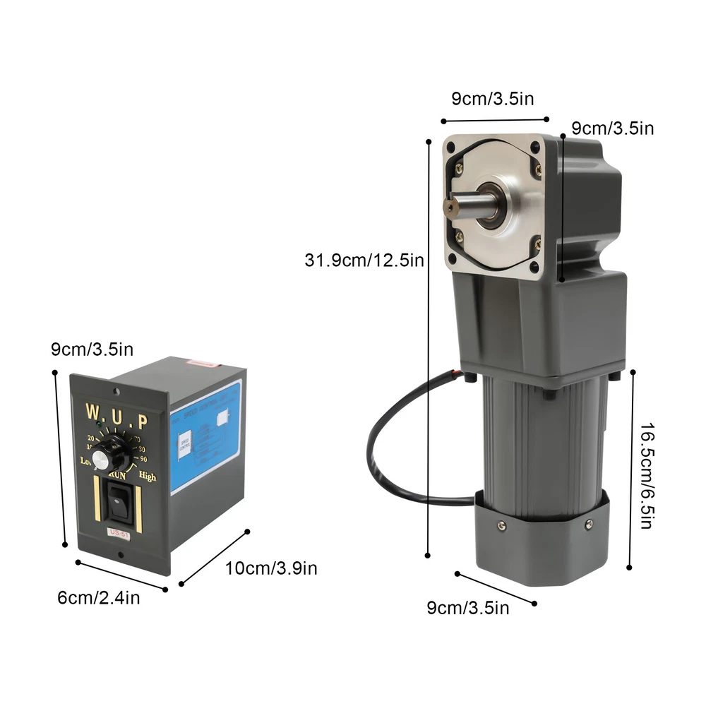 120W 110V 1:30 AC Gear Motor Electric Reversible Speed Reduction Motor 45R/MIN 30k Electric Variable Speed Controller 90° Right Angle Output Reduction Motor Description The 120W speed reduction motor provides high efficiency for your work and allows you to save a lot of working time. The governor with high accuracy and wide speed range allows you to adjust the right speed for different applications. And with its high torque, it will be your powerful working partner! Key Features High-quality Material: This product is made of high-quality medium carbon tempered steel, with high hardness, strong wear resistance , anti-corrosion , anti-rust performance, and long service life. High Efficiency: The speed of a 120W motor can reach 45rpm, ensuring high efficiency and saving you a lot of working time. Efficient Heat Dissipation: Built-in cooling fan, bottom cooling window design, and stable performance of pure purple copper coil can effectively dissipate heat, thus ensuring long-term stable operation. Adjustable Speed: The speed regulator with high precision and wide speed range allows you to adjust different speeds according to different applications to achieve the expected results. Commutation Function: This product has flexible normally open and normally closed control system by changing wires or adding switches, providing you with higher freedom of use. Large Torque: The stable pure purple copper coil and gear set consisting of full ball bearings and medium carbon tempered steel gears can effectively increase the torque of the motor, providing you with smoother and more powerful operation. Easy to Clean: The surface of the product is smooth and flat to clean. You can easily wipe off the dust and stains on the surface with a rag. Easy to Install: Complete installation parts and a detailed English manual can help you to install quickly and accurately. Details Stator: Both ends of the stator are equipped with ball-bearing axle wheels, resulting in low friction, temperature, and noise . Fine Fittings: The fine fittings make the top cover and bottom cover tightly combined, thus making the rotor run stably. Gearbox: 5GU gears are vacuum plasma nitrided for high strength and its shaft keyway is equipped with fixed key pins for wear resistance and stability. The gearbox has built-in solid lubricant for smoother rotation. Speed Range 1. The lower the governor's speed, the slower the speed, the smaller the force. The normal reasonable speed range is 50%~100%. 2. The larger the speed ratio, the slower the speed, the greater the force; the smaller the speed ratio, the faster the speed, the smaller the force. (Example: Both are 20 revolutions, but the 20 revolutions directly from the reducer are 2-3 times smaller than selecting a 40 revolution and then adjusting to 20 revolutions.) Application This product can be used in packaging, printing, textile, printing and dyeing, chemical, food, pharmaceutical, and other engineering machinery, as well as advertising, office, petrochemical, instrumentation, stage lighting, transmission, automated warehouse, parking lot, and other equipment. Specification Material: Medium Carbon Tempered Steel Color: Dark Grey Process: Plastic Spraying, One-piece Forming, Heat Treatment Type: Medium Solid Motor Reduction Ratio: 1:30 (30K) Power Supply: Wiring Voltage: 110V Power: 120W Torque: 20NM Rotational Speed: 45R/MIN Output: 90° Right Angle Output Gross Weight: 8kg/ 17.64 lbs Total Height: 31.9cm/12.6in Reduction Box Size: 9*9cm/3.5*3.5in Governor Size: 10*6*9cm/3.9*2.4*3.5in Package Size: 33*16*12 cm/ 12.99*6.3*4.72 in Package Included 1 * Speed Reduction Motor 1 * Speed Governor 1 * English Manual All Accessories for Installation Notes Our motors do not include the power cord and the bracket. Please do not plug and unplug the power cord with the power on. Please do not knock on the machine. The speed reduction motor is composed of a motor and a speed reduction gear. Different speed ratios can achieve different speed regulation ranges, and they have different strengths. The speed of the output shaft is different under different reduction ratios. When the gearbox decelerates, the higher the reduction ratio, the higher the force. The slower the speed regulated by the governor, the lower the torque. The motor can run for a long time within the safe speed regulation range. The safe speed regulation range for small loads is 50% of full speed-full speed. The safe speed regulation range for large loads is 70% of full speed-full speed. Please read the operating manual completely before use. And pay particular attention to the safety instructions included. Please allow the slight color difference caused by the shooting light and the 1-3 cm error due to manual measurement, and make sure you do not mind before ordering. Payment Delivery details Terms of sales About us Contact us Payment We accept ebay payment 。 Fees such as import duties, taxes are not included in the item price or shipping costs. These charges are the buyer's responsibility. Delivery details Shipping: 2-9 working days to: USA Terms of sales We maintain high standards of excellence and strive for hundred percent customer satisfaction. Feedback is very important to us. We hope that you contact us immediately before you give neutral or negative feedback, so that we can address your concerns. It is impossible to address issues if we do not know about them! About us Your satis faction is our ultimate goal. We work hard to earn your trust and future business. Our certified technicians have tested each item before shipping. The unit comes with 1 year limited warranty on all manufacturing defects. a) If you receive a defective item, you may return it or ask for a discount. Please contact us within 14 days after you receive the package. b) What you returned must be intact and in its original packaging as re? u. Customer is responsible for shipping costs of the returned item. c) We will cover the cost of shipping back t wit