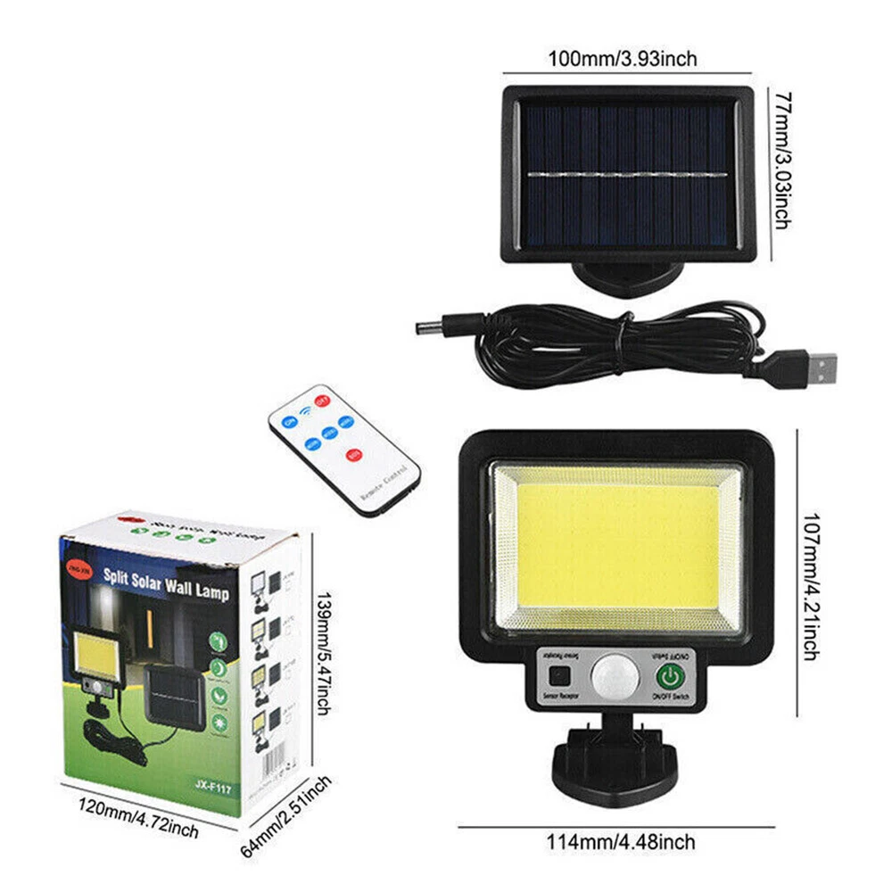 Description: 100% brand new and high quality. Practical Split Design: No worry about insufficient energy storage. With the help of the separate design and 16.4FT cable, the solar collector can be installed in positions with high sunlight intensity in the daytime and the lamp in positions with high lighting needs. In addition, Advanced solar panel with battery increases energy storage efficiency by more than 10%, which perfectly extends lighting time. Shines Farther and Wider: The solar light uses a 117pcs COB light source, offers 10% more brightness and less loss of light. It emits bright and even light with no light spots. A reflector is designed around the light source to achieve a longer irradiation distance and a wider angle. And high heat dissipation contributes to the long service life, definitely a recommended choice. 3 Induction Mode to Choose: With the sensitive sensor that offers 120° wide angle detection and up to 23 feet distance, the lamp can light up in time when someone approaches. Three humanized lighting modes are built in: a. Light off → motion-activated full brightness mode b. Dim bright → motion-activated full bright mode; c. Always Half bright mode. You can choose based on your actual needs. Easy Installation: No additional wiring required. You just need to drill the attached screws into the wall to complete the fixture. Even for anyone with minimal electrical skills, and you can complete it yourself in 3 minutes. We strongly recommend installing the solar panels in a location with sufficient daylight to maximize long-term night lighting. Waterproof and Dustproof: This security light meets the IP65 standard and achieve qualified waterproof and dustproof protection. Even in rain and wind, cold winter and hot summer, the product is not easily damaged. Suitable for garden, garage doors, pathway, front doors and other scenes. Specification: Product Name: Split Type Solar Sensor Wall Light Material: Polysilicon + ABS + PC Product Color: Black Light Color: White Light Lamp QTY: 117PCS Waterproof: IP65 Sensing Angle: 120° Light Angle: 180° Sensing Distance: Recommended Installation Height 3~5m / 9.8~16.4ft Control: Switch / Remote Control Sensor Mode: Motion Sensor + Light Sensor Extended Line: 5m / 16.4ft Solar Panel Size: 100 x 77mm / 3.93 x 3.03in Wall Light Size: 107 x 114 x 25mm / 4.21 x 4.48 x 0.98in 3 Modes: Mode 1: Human body sensing mode light will be off. When people pass by, the lights are high and bright. Turn off 20 seconds after the person leaves. Mode 2: Human body sensing mode + medium light mode light will be off. When people pass by, the lights are high and bright. 20 seconds after people leave, lights are half on. Mode 3: Low light mode after nightfall, dim lights will stay on and automatically turn off during the day. Package Included: 1 X Split Solar Wall Light 1 X Mounting Accessory Set 1 X Remote Control
