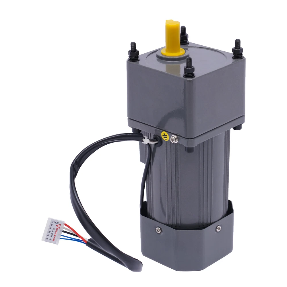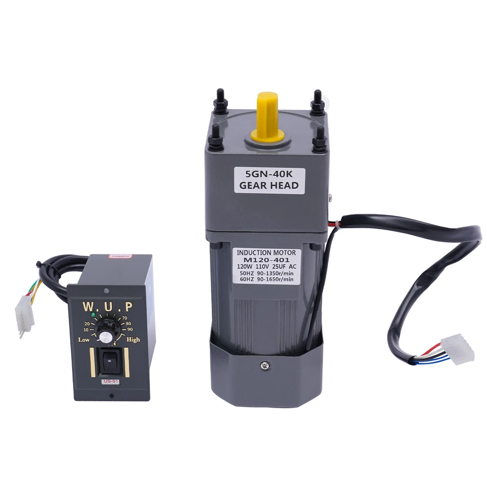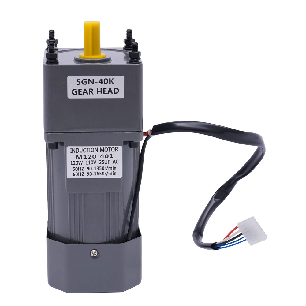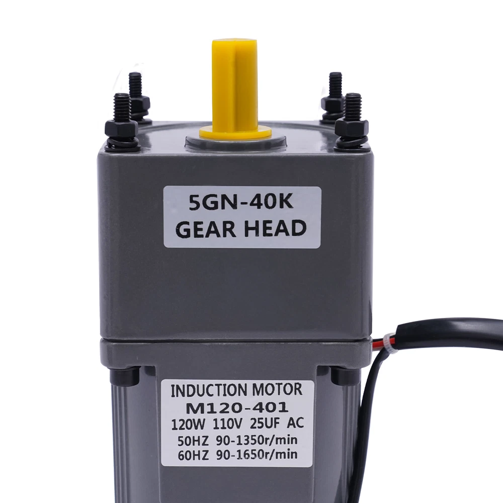 120W 40K 110V AC Motor Low Speed Mini Gearbox Electric Motor Barbecue High Torque 110V Geared Motor Synchronous Reduction Motor Reversible Description This is an AC 110V gear motor with 120W power, which can achieve the 1350r/min speed. It uses pure copper coils and allows for low-noise&powerful working, making it suitable for homes, handcrafts, school projects, model-churning soda machines, low-speed machines, and any other product you want. You can turn the speed control knob to adjust the motor speed, realizing the desired effect. Key Features Build to Last: Our product is made of high-quality cast aluminum shell and carburized carbon steel gear and is characterized by heat resistance, high quality, and long service life through plastic spraying, integration, and heat treatm 120W 40K High Torque 1:40 Electric AC Motor Low Speed Gearbox Reduction Motor 120W 40K 110V AC Motor Low Speed Mini Gearbox Electric Motor Barbecue High Torque 110V Geared Motor Synchronous Reduction Motor Reversible Description This is an AC 110V gear motor with 120W power, which can achieve the 1350r/min speed. It uses pure copper coils and allows for low-noise&powerful working, making it suitable for homes, handcrafts, school projects, model-churning soda machines, low-speed machines, and any other product you want. You can turn the speed control knob to adjust the motor speed, realizing the desired effect. Key Features Build to Last: Our product is made of high-quality cast aluminum shell and carburized carbon steel gear and is characterized by heat resistance, high quality, and long service life through plastic spraying, integration, and heat treatment. Speed Adjustable : With the speed controller that has various optional speeds and large torque, you can adjust different speeds according to different products to achieve the desired effect. Good Heat Dissipation: The built-in cooling fan(>60W), cooling window design on the bottom, and pure copper coils with stable performance can effectively dissipate heat to ensure long-term stable operation. Integrated Reducer: The integrated reducer with a heat treatment process improves the gear wear resistance and work efficiency. Stable Operation: Both ends of the rotor are equipped with ball bearings, which can reduce friction and temperature during use to ensure stable operation. High Safety: The slow start function can effectively avoid current overshoot and protect the motor. And it is adjustable to meet different personalized use needs. Reversing Function: It has a reversing function that is flexible with normally open and closed control systems. Easy to Operate&Assemble: With the simple structure, you can assemble this product quickly. The simple switch button and speed control knob make it easy for you to operate. Protective Package: To prevent the product from being damaged and bumped during transportation, we packed it with foam boxes and bubble pads to protect your products to the maximum extent possible. Buy with Confidence: We have been working hard to provide better service and quality for our customers, which is our goal. If there is any problem with our products, please contact us in time. Details Clear Marks: These clear number&letter marks on the machine allow for easy and convenient operation. Power Cable: The power cable has distinct colors for different wires, so you can connect them easily without confusion. Holster: The yellow holster can effectively protect the shaft when not in use. Application It is widely used in packaging, printing, textile, dyeing, chemical, food, and pharmaceutical construction machinery as well as advertising, office, petrochemical, instrumentation, stage lighting, transmission, automatic warehouse, parking, and other equipment. How to Install Please remove the holster before installation. Fix the reducer on the gear motor with four screws. Install the keyway at the keyway opening. Plug the speed controller and gear motor together (main wire to main wire). Unscrew the two AC screws on the back of the speed controller. Connect single-phase power to both AC ports (without distinguishing between zero and fire wires) and tighten the screws. Turn the speed control knob to adjust the motor speed. Install the bracket(not included) on the motor. Specifications Model: M120-401 Color: Gray Material: Cast Aluminum Gear Material: Carburizing Steel Processes: Plastic Spraying, Integration, Heat Treatment Process Type: AC Gear Motor, Induction Motor Shape: Square, Round Feature: Portable Power Phrase: Single-phrase Motor: Pure Copper Motor Noise: About 50-60db Built-in Fan: >60W Torque: 21N.m Voltage: AC 110V Power: 120W Capacitance: 25UF Speed: 50Hz 90-1350r/min, 60Hz 90-1650r/min Reduction Ratio: 1:40 (40K) Shaft Diameter: 12mm/0.47inch Shaft Length: 28mm/1.1inch Keyway: 4mm/0.16inch Key Depth: 25mm/0.98inch Dialogue Mounting Holes: 104mm/4.09inch Axis Eccentricity: 18mm/0.7inch Disc Diameter: 34mm/1.34inch Through-hole: ∅8 Gear Motor Height: 16.5cm/6.5inch Reducer Size: 9*9*6.2cm/3.5*3.5*2.4inch Speed Controller Size: 9*6*10cm/3.5*2.4*3.9inch Package Size: 28.5*24.1*12.5cm/11.22*9.48*4.9inch Net Weight: 4.96kg/10.9lbs Gross Weight: 5.3kg/11.68lbs Package Included 1* Speed Controller 1* Gear Motor 1* Reducer Notes Based on the industrial standard, to meet the different needs of customers, our motor does not include a power cord. You need to purchase a power cord to connect. The bracket is not included in this package, so you should purchase it yourself. Please do not plug&unplug the power cable when the power is on. Please do not knock or beat the machine. The speed reduction motor is composed of a motor and reducer, different speed ratios can achieve different speed regulation ranges, and they have different strengths. Under different deceleration ratios, the output shaft speed is different. The output shaft speed is equal to the motor speed of 1350 rpm divided by the deceleration ratio. When the gearbox decelerates, the greater the