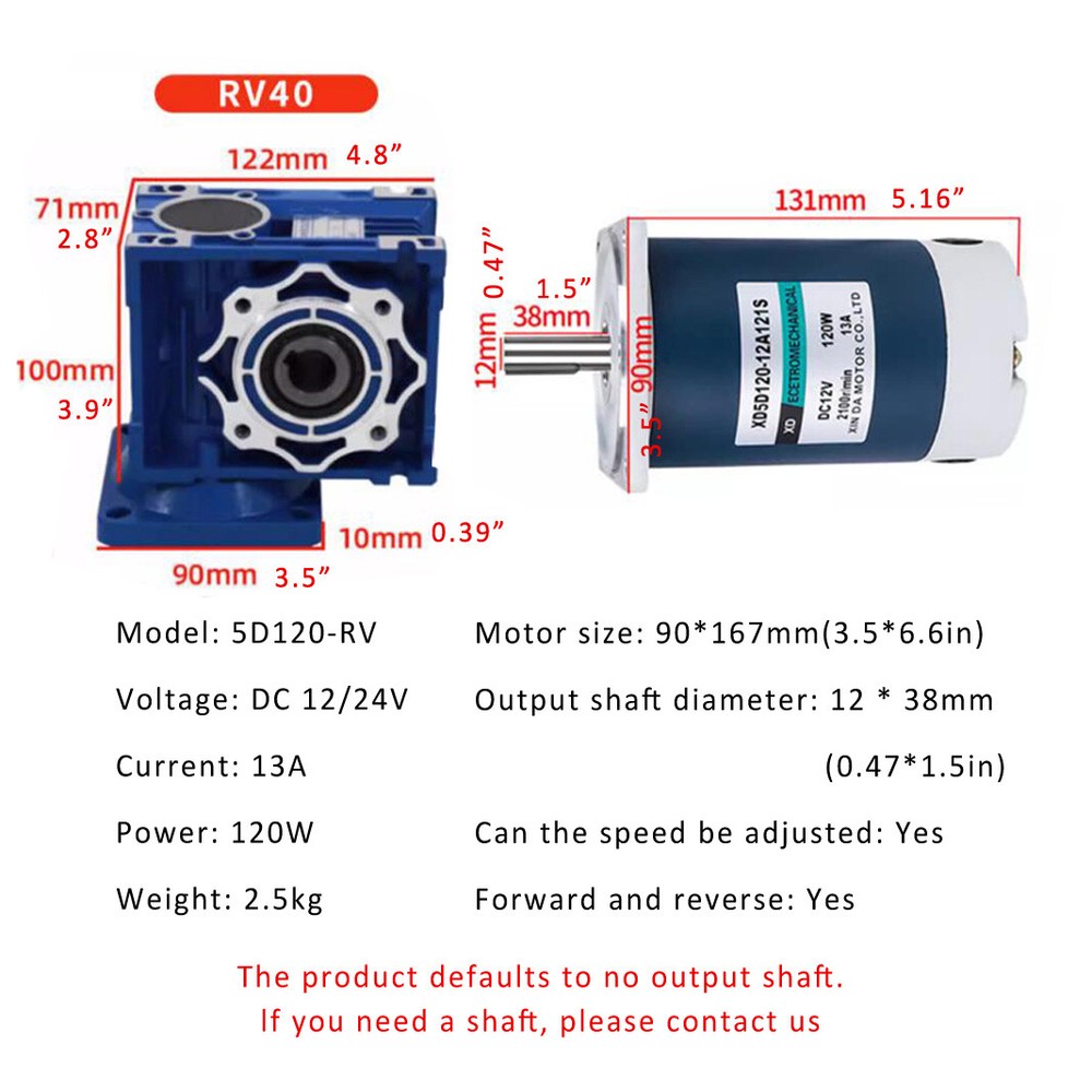 Store Categories Store Categories Outdoor Sports Business and industrial Batteries Home and garden Healthy and beauty Toys and doll TOOLS Accessory Other Product Description Application: Widely used in automatic barbecue, automatic mixing, automatic doors and windows, conveyor belt, conveyor, vending machine, feeder, calender, extruder, peeling machine, blender, cargo lifts, packaging machines, textile machinery, printing machinery, food machinery, vending machines, automatic tables, office equipment, medical equipment, etc. Feature: All metal gears, carburizing hardening, to ensure material toughness Rotor part of the pure copper wire, the output torque 2200GS high-strength magnetic tile, smooth operation, no jitter With self-locking, power outage to stop, reduce equipment wear and tear Parameter: Voltage: DC12V/24V Motor shaft diameter: 12mm Current: 13A Load speed: 1800 rpm Rated speed: 2100rpm Power: 120W Motor size: 90*167mm(3.5*6.6in) Output shaft diameter: 12 * 38mm (0.47*1.5in) Can the speed be adjusted: Yes Forward and reverse: Yes Reduction ratio: 5/7.5/10/15/20/30/50/60/80/100 Includes: 1 x Set of motor Note: Speed controller and power supply not included, please contact us if needed. Payment Policy Shipping Policy Returns Policy About Us Contact Us Payment Policy 1. We accept PayPal only. 2. All major credit cards are accepted through secure payment processor PayPal. 3. Payment must be received within 7 business days of auction closing. 4. If you have bought multiple items from me, you can send me one payment for all the items instead of paying for them individually. When you click the Pay Now button, eBay will automatically determine if there are other items you have won or purchased from me and will combine them for your review. 5. NOTE: Import duties, taxes and chargers are not included in the item price or shipping charges. These charges are the buyer's responsibility. Please check with your country's customs office to determine what these additional costs will be prior to bidding buying. Shipping Policy 1. We Ship to Worldwide. 2. Items will be shipped within 7-14 business day on payment received. 3. Item are shipped from Shenzhen using Airmail, reach most of the countries within 10 to 35. 4. Delivery time depends on destination and other factors, it may takes up to 40 business days. 5. We are not responsible for undeliverable address, we reserve the right to charge the shipping fee again for returned items due to wrong address. 6. If you do not receive your item by 30 business days, Please feel free to contact us via ebay mail system, we will try our best to resolve any problems with you. Returns Policy 1. You have 7 day to contact us and 10 days to return it from the date it was received. If this item is in your possession more than 7 days, it is considered used and WE WILL NOT ISSUE YOU A REFUND OR REPLACEMENT.There are NO EXCEPTIONS! 2. All Returned items Must Be in the original packaging and you MUST PROVIDE us with the shipping tracking number, specific reason for the return,and your ebay ID. 3. We will refund YOUR FULL WINNING BID AMOUNT, upon receipt of the item in its original condition and packaging with all components and accessories included, AFTER BOTH Buyer and Seller cancel the transaction form ebay.OR, you may choose to have a replacement. 4. Return shipping is to be paid by the Buyer. About Us 1. We strive for our customer satisfaction at best possible. If you have any questions, please feel free to email our service specialists 24 Hours a Day, 7 Days a week. We will reply you ASAP. If no response within 24 Hours, please check the spam in your mail box. 2. We greatly appreciate your POSITIVE feedback. Please do NOT leave negative feedback without asking for help. Our aim is to provide Top Level Customer Service, normally so we will try our best to solve any problem you have. 3. Please DON'T leave negative or neutral feedback if you haven't received item in 30 days, because we have mentioned the shipping time repeatedly. Contact Us Our customer-oriented service strives for positive feedbacks with all 5 star selling ratings . Please feel free to contact us via eBay message once you have any question before you giving us negative feedback or open case. Business time: GMT8 (9:00-18:00) from Monday to Friday Copyright © 2023 Dianxiaomi