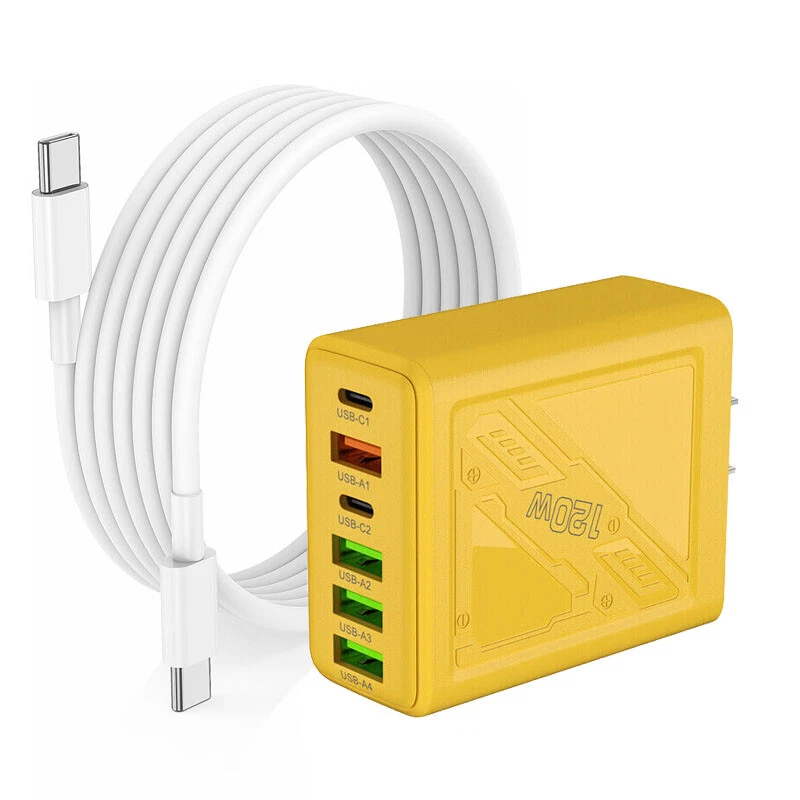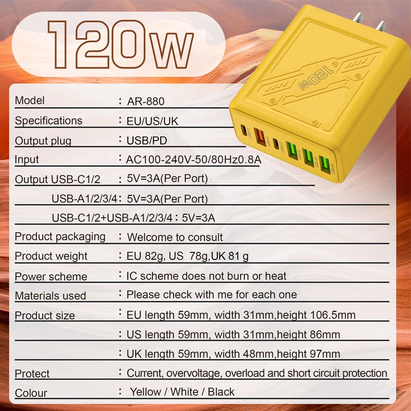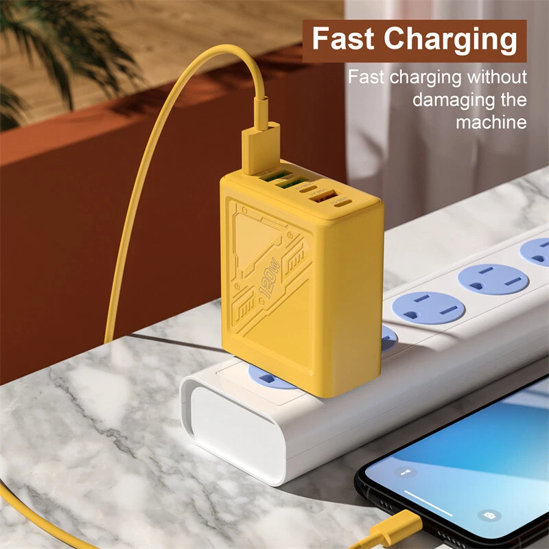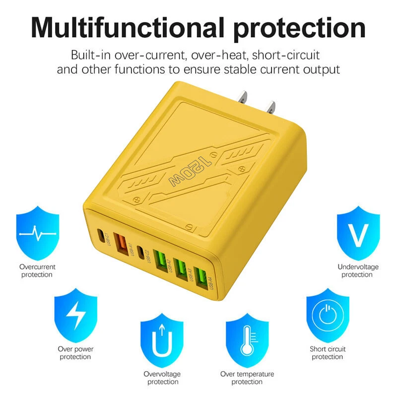 Description: 1. Fully charged, safe to use, with overcharge, overcurrent and overheating protection. 2. Flame retardant material, providing excellent service for you and your devices. 3. Safety: This USB charger adopts shell design, which is not easy to be damaged. 4. Convenient for travel: With global voltage compatibility, compact and portable design, you can charge anywhere. Specifications: Type: Charger Power: 120W Color: Yellow Charger plug: US plug, Warning: This product has 6 plugs with a total power of 120W. When multiple plugs are charged at the same time, the charging speed will be the same as that of a normal charger. If you encounter any problems during purchase or use, please feel free to contact us.