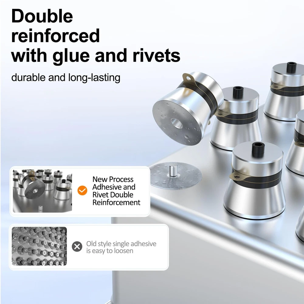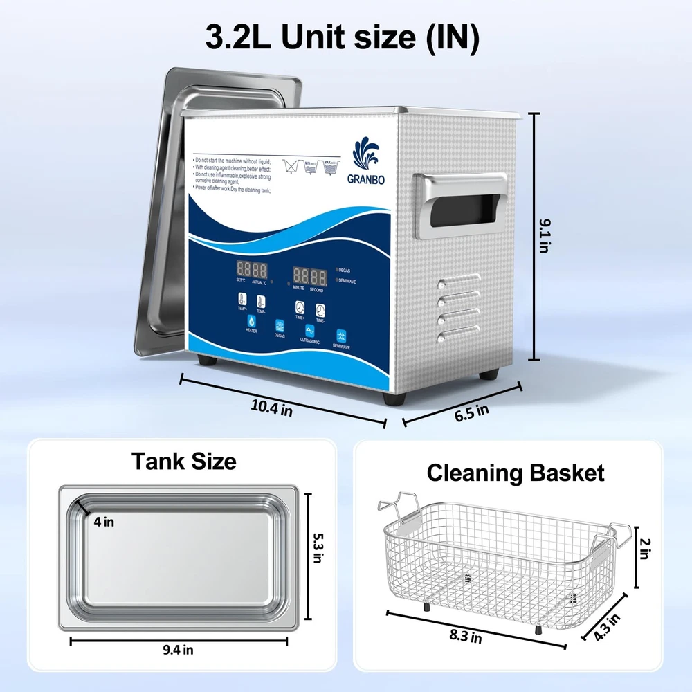 Overheat protection Product capacity: jewelry cleaning machine 3.2L 3.2L ultrasonic machine Product power: 120W best jewelry cleaner ultrasonic Operating frequency: 40khz professional eyeglass cleaner machine Inner groove size: 9.4×5.3× 4 in Overall dimension:10.4 × 6.5 × 9.1 in Timer:Digital 1~30min adjustable More Features: Digital Control + Timer + Heater + Degas 【Powerful Cleaning Effect】120W sonic cleaner possesses ultrasonic cleaning frequency 40kHz, ultrasonic power 120W.sonic jewelry cleaner machine have powerful and efficient cleaning performance to remove dirt, grime and contaminants from delicate items 【Heater Timer】The ultrasonic parts cleaner adopts digital control panel to control the working time and accurately determine the temperature. 150W heating power can heat the cleaning solution to effectively remove impurities, stains, anti-rust treatment and so on 【Degas Mode】Ultrasonic cleaning Machine with degassing mode can effectively remove the gas in the liquid, improve the cleaning efficiency, reduce the gas content in the liquid, protect the experimental samples, improve productivity, and extend the service life of the equipment 【Special capacity design 】jewelry cleaner ultrasonic capacity 3.2L, Tank Size: 9.4 × 5.3 × 4 in, made of high-quality 304 stainless steel, with corrosion resistance and oxidation resistance, more durable and sturdy, can be used for many years.is widely used for cleaning jewelry, eyeglasses, watches, circuit boards, dental equipment, and other small parts 【LED Digital Display】Sonic cleaner machine -Time setting: 0-30 minutes. The LED digital timer precisely controls the time 【Firm and not loose 】The ultrasonic eyeglass cleaner machine uses a high-strength flexible fixing adhesive to bond the ultrasonic transducer to the stainless steel tank,preventing the vibrating head from falling off when the ultrasonic cleaning machine is running