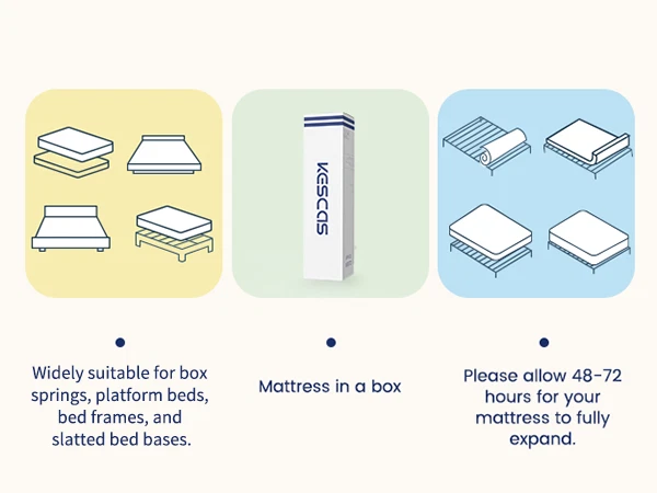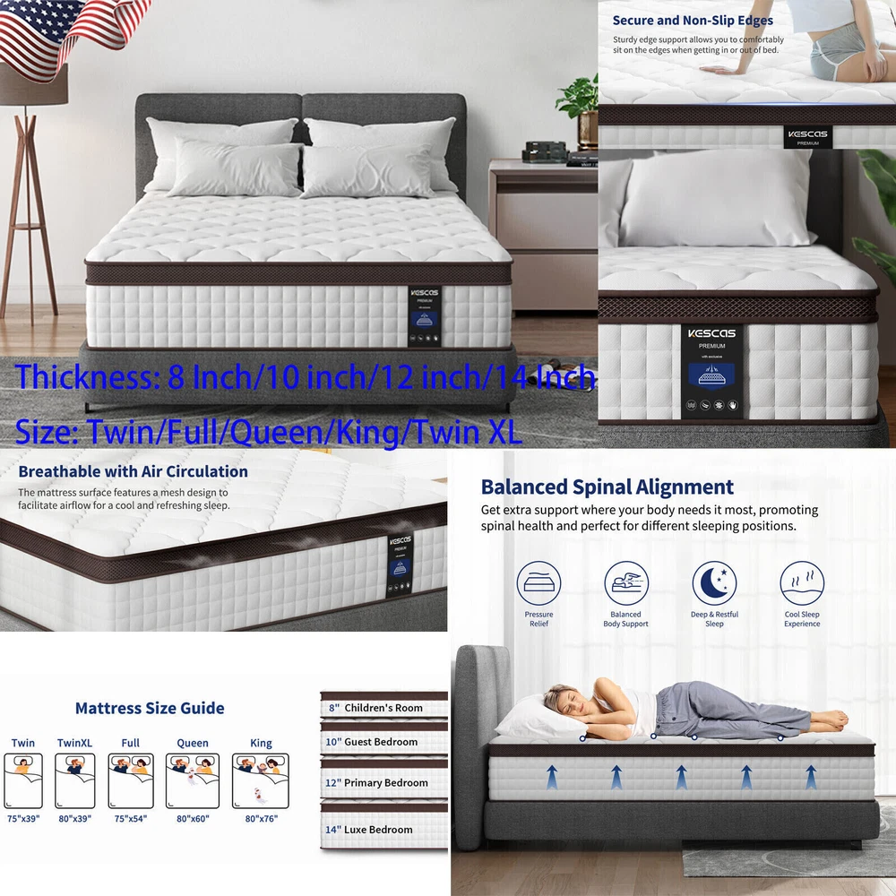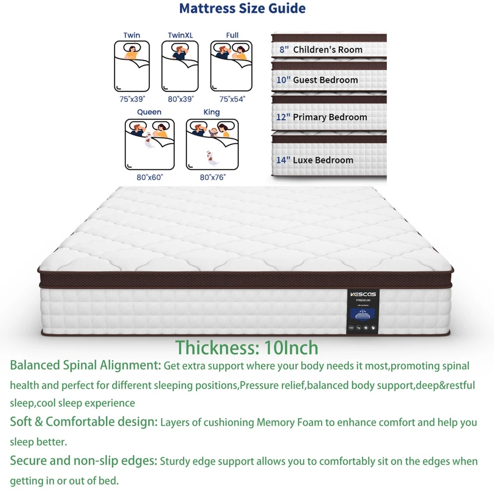 You may also like Twin XL 12 In Gel Memory Foam Hybrid Mattress 5-Zone Pocket Coils Bed in a Box 199.99 USD Free shipping 10" Twin XL Size Gel Memory Foam Mattress Hybrid Foam Pocket Coils Bed In a Box 179.99 USD Free shipping Product Description 12"/14" Full Queen King Mattress Spring Memory Foam Pocket Coils Bed In a Box Feature Brand: Kescas Thickness: 8/10/12/14 Inch Size: Twin/Full/Queen/King/Twin XL Construction Type: Inner_spring Item Firmness Description: Medium Material: Memory Foam Comfort Layer Material: Memory foam Fill Material: Individually Pocket Spring About this item 3D KNITTED BREATHABLE FABRIC - Made with 3D soft knitted fabric, this breathable mattress helps to promote airflow and provide a healthy sleeping surface. Its fireproof layer adopts flame-retardant non-woven fabric, which does NOT as well contain any glass fiber. More than that, Kescas hybrid mattress brings you luxurious rest experience of comfort at night with pocket innerspring design. DUAL GEL-INFUSED MEMORY FOAM - Kescas mattress uses dual gel-infused memory foam to regulate your body temperature and bring a cloud-like sleeping experience of coolness, so that you will wake up feeling refreshed. When rendering pressure relief, no reflection of motion will be transferred to sleeping partners. EURO TOP DESIGN - Mattress with dual rows of specially reinforced coils along the edge of the bed makes us easy to sit on it comfortably without slipping off. 690 pocket springs offer perfect support to your spine throughout the night, which is suitable for all kinds of sleeping positions, help to relieve pressure and improve sleeping quality. PACKAGE & FASHION - This mattress is compressed, rolled, and shipped in a box for a convenient delivery. It will accent your bedroom with style, while providing you with the most comfortable sleep experience you can imagine. KESCAS AFTER-SALES - Kescas mattress is efficiently compressed into a box that’s shipped right to your door, simply unbox, unroll and the mattress does the rest, expanding to its original shape within 72 hours. 100 hassle-free night trial, 100-Days Money Back and worry-free 10 year limited warranty included. Please don't hesitate to contact us if there is any question, we will reply to you within 24 hours. SUPPORTIVE FOAM & POCKET SPRINGS - Our firmest mattress ever is engineered with heavier gauge steel independent pocket innersprings for added stability and medium firmness. With soft comfort foam, durable high-density foam and motion-isolating independent pocket springs with a quilted jacquard cover offer a medium firm feel that's perfect for stomach sleepers, and plus-sized individuals and those who enjoy a very medium firm mattress. CERTIPUR US CERTIFIED & PRESSURE RELIEVING - Highest quality foam is CertiPUR-US Certified for durability, performance, and content. 4 foam layers for optimal softness and support. Provide cushioning and serve as protective buffer, relieve painful pressure points on the body. Ideal for stomach sleepers and those who suffer from back and neck pains. HIGH PERMEABILITY & STRONG EDGE SUPPORT - Knitted fabric cover offers the softest touch and luxurious feel. Made of dual-layered soft knitted fabrics, super breathable! Help to release heat and regulate sleeping climate. Airy mesh on the side promotes heat dissipation and independently encased coils beneath enhances airflow, which makes the sleeping cool and comfortable. MADE IN CENTURY-OLD BRAND FACTORY FOAM AND GLOBAL MATERIAL - Innovative performance in every layer, manufactured right here. Our R&D Center located in South Carolina of USA. Customized according to North American customer standards. Straight out of our first ever, state-of-the-art, global production technology in North American. EXPERTLY PACKAGED AND GENERAL NOTE - Kescas mattress is efficiently compressed into a box that's shipped right to your door, simply unbox, unroll and the mattress does the rest, expanding to its original shape within 72 hours. 100 hassle-free night trial, 100-Days Money Back and worry-free 10 year limited warranty included. Please don't hesitate to contact us if there is any question, we will reply to you within 24 hours. Packing list: 1x Kescas 8/10/12/14 Inch Twin/Full/Queen/King/Twin XL Size Mattress Mattress Size Information Size Specific size Firmness Weight 8 inch Twin Size 75''L × 39''W × 8''H Medium 38.03 lbs 8 inch Full Size 75''L × 54''W × 8''H Medium 53.90 lbs 8 inch Queen Size 80''L × 60''W × 8''H Medium 59.88 lbs 10 inch Twin Size 75''L × 39''W × 10''H Medium 42.99 lbs 10 inch Full Size 75''L × 54''W × 10''H Medium 57.14 lbs 10 inch Queen Size 80''L × 60''W × 10''H Medium 63.07 lbs 10 inch Twin XL Size 80''L × 39''W × 10''H Medium 46.41 lbs 12 inch Twin Size 75''L × 39''W × 12''H Medium 51.92 lbs 12 inch Full Size 75''L × 54''W × 12''H Medium 68.78 lbs 12 inch Queen Size 80''L × 60''W × 12''H Medium 77.71 lbs 12 inch King Size 80''L × 76''W × 12''H Medium 94.80 lbs 12 inch Twin XL Size 80''L × 39''W × 12''H Medium 55.12 lbs 14 inch Queen Size 80''L × 60''W × 14''H Medium 78.37 lbs 14 inch King Size 80''L × 76''W × 14''H Medium 95.68 lbs Product Description Highly mixes the traditional support of built-in spring mattress and comfort of memory foam to bring moderate comfortable experience. Dual-layer memory foam creates the optimum softness and support to relieve your pain points on the body. Airy mesh on the side promotes heat dissipation and independently encased coils beneath enhances airflow, which makes the sleeping cool and comfortable. CERTIPUR US CERTIFIED 4 FOAM LAYERS for optimal softness and support. Provide cushioning and serve as a protective buffer, relieving painful pressure points on the body. Ideal for stomach sleepers and those who suffer from back and neck pains. MADE IN NORTH AMERICAN FOAM AND GLOBAL MATERIAL - Innovative performance in every layer, manufactured right here. Customized according to North American customer standard