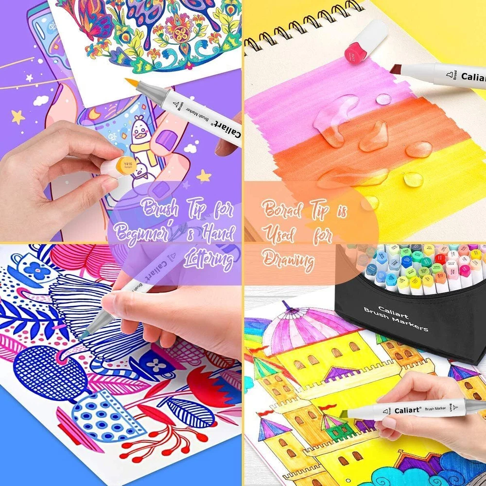 Ink Color Multicolored Number of Items 121 Point Type Chisel Recommended Uses For Product Coloring,Illustration About this item 🎨 Brush & Chisel Double Tip Art Markers. Each brush tip marker has a double-ended design, providing great versatility. You can choose the brush tip for sweeping, details, calligraphic strokes or the broad chisel tip for quickly color in large areas. Caliart brush markers are more durable and do not fray easily. 🎨 120 Vibrant Colors + 1 Free Colorless Blender. Valued artist markers set for adults, coloring books , artist sketching, illustration, drawing, calligraphy lettering beginners, underlining, card making, architectural design, advertising rendering, landscape, and other forms of comic design etc. Great as art markers, sketch markers, drawing markers, permanent markers, paint markers, brush markers pens, based markers, markers brush tip, brush markers. 🎨 Seamless Blending and Color Mixing. High-quality Japanese marker ink blends seamlessly to achieve beautiful coloring effects, excellent for both beginners and professionals. Smooth color mixing and blending, never worry about uneven, blotchy ink marks anymore. 🎨 Based Ink Markers. The highly pigmented and vibrant brush tip markers are built to last without worrying about smudges. Excellent smudge-proof and waterproof qualities on most surfaces, work well on paper, ceramics, plastic, rock etc. No fade with time. NOTE: as Based Markers like ALL other brand markers, they will Bleed through regular coloring paper, except very thick paper, marker paper. Item Weight ‎4.38 pounds Product Dimensions ‎6 x 0.55 x 0.55 inches Is Discontinued By Manufacturer ‎No Color ‎12 Colors Closure ‎Click-Off Cap Grip Type ‎Contoured