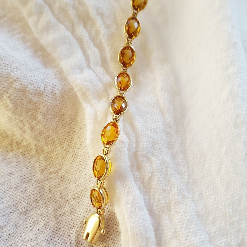Natural Oval cut Yellow Topaz women's Tennis Bracelet in Sterling silver, November birthstone Bracelet, Party wear Bracelet, Finance gift Bracelet, Gemstone Bracelet, Tennis Bracelet. ==================================== PRODUCT DETAILS:-- Product Type - Bracelet Bracelet type - Tennis Bracelet Gemstone setting - Natural Yellow Topaz Natural Yellow Topaz shape -Oval Natural Yellow Topaz size - 6x4 mm Natural Yellow Topaz color - Yellow Setting type - Prong ==================================== The Exclusive Benefits of Yellow Topaz stone: Growth in administrative, criminal & creative careers – yellow topaz is pretty beneficial for people operating in academics, government jobs, judiciary or innovative arts. Sporting a yellow topaz stone benefits the native by boosting his innovative and realistic judgement. Financial progress & social enlistment – yellow topaz improves wearer’s will power and awareness, thereby supporting him to comprehend his goals and visions. Expert achievement and social popularity are a number of the blessings of wearing yellow topaz. Better physical and intellectual health – humans stricken by kidney and liver associated ailments are suggested to put on yellow topaz if they can’t come up with the money for yellow sapphire. Yellow topaz is also effective in coping-up with psychological disorders like despair or tension. Marital and progeny bliss – as Jupiter regulations married lifestyles and progeny, it's far believed that carrying a yellow topaz can help women dealing with delays in getting married or are struggling with bearing children. Yellow Topaz Gemstone Quality The Quality of yellow topaz is judged collectively after studying its origin, colour and readability. Any alternate, primary or minor, can notably influence on the general well worth of the gemstone. =============================================================== Guidelines for Wearing Citrine : Metal : It is usually worn in a silver ring or Bracelet . Day : Thursday is considered an auspicious day to start wearing Citrine Mantra : Reciting the mantra for Venus (“ Om Streem Brahm Brihaspataye Namah ” ) while wearing the Citrine stone is considered beneficial. ==================================== Shipping Policy :---- • Shipping Thru FedEx, DHL Express, USPS & Other Courier Services. • We ship item(s) from India to Worldwide . • We also use USP Which take 4-5 days for delivery with 100 % insured and online tracking . • We provide you each item with individually packed secured with quality products to help ensure safety and undamaged delivery =================================== Regards by RG jewels