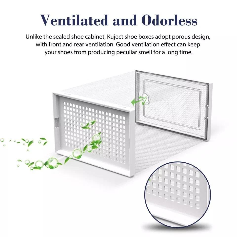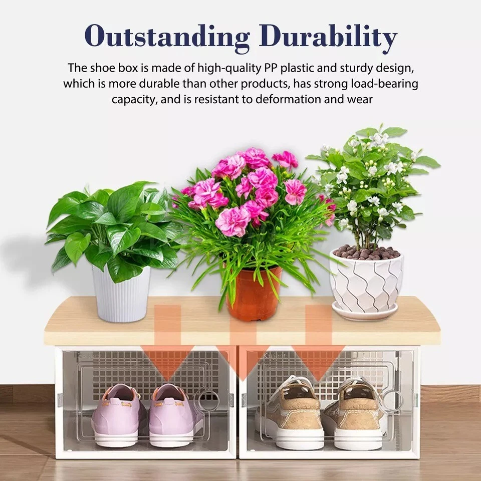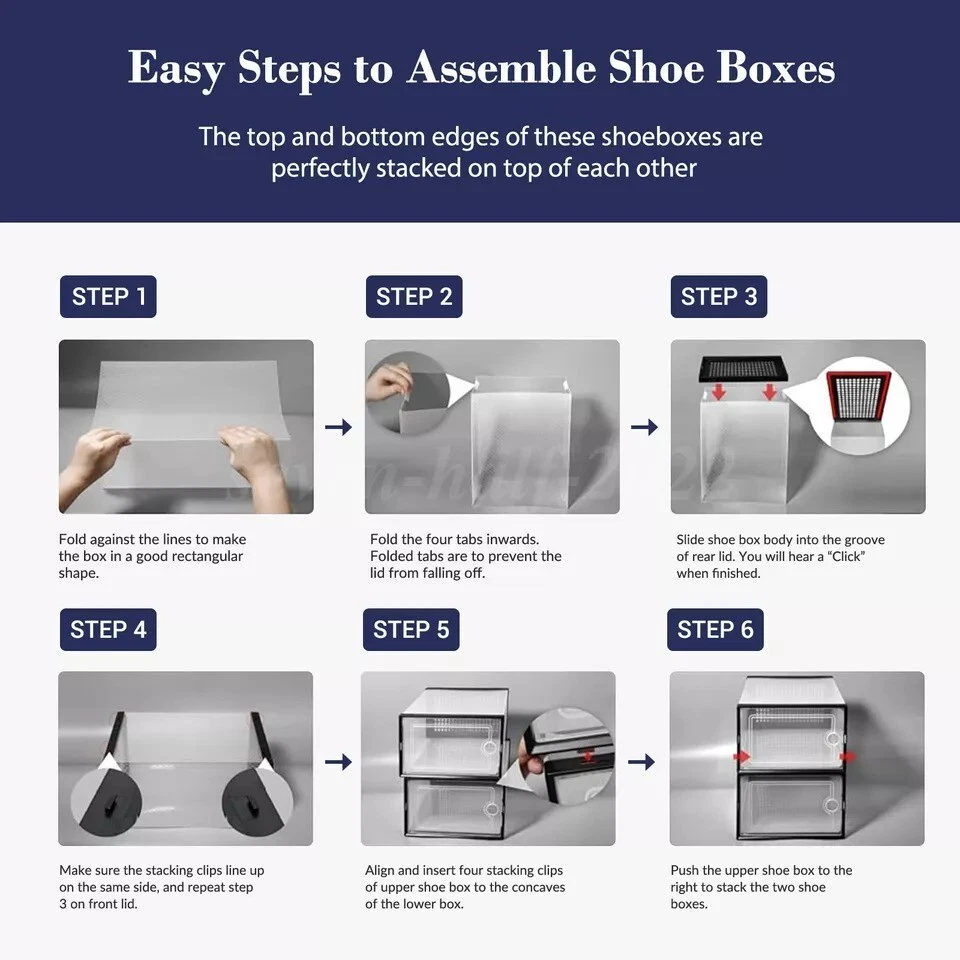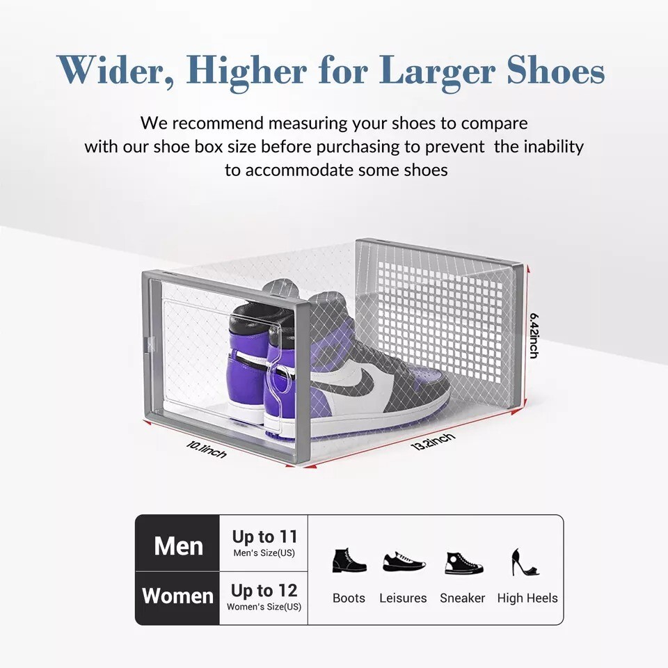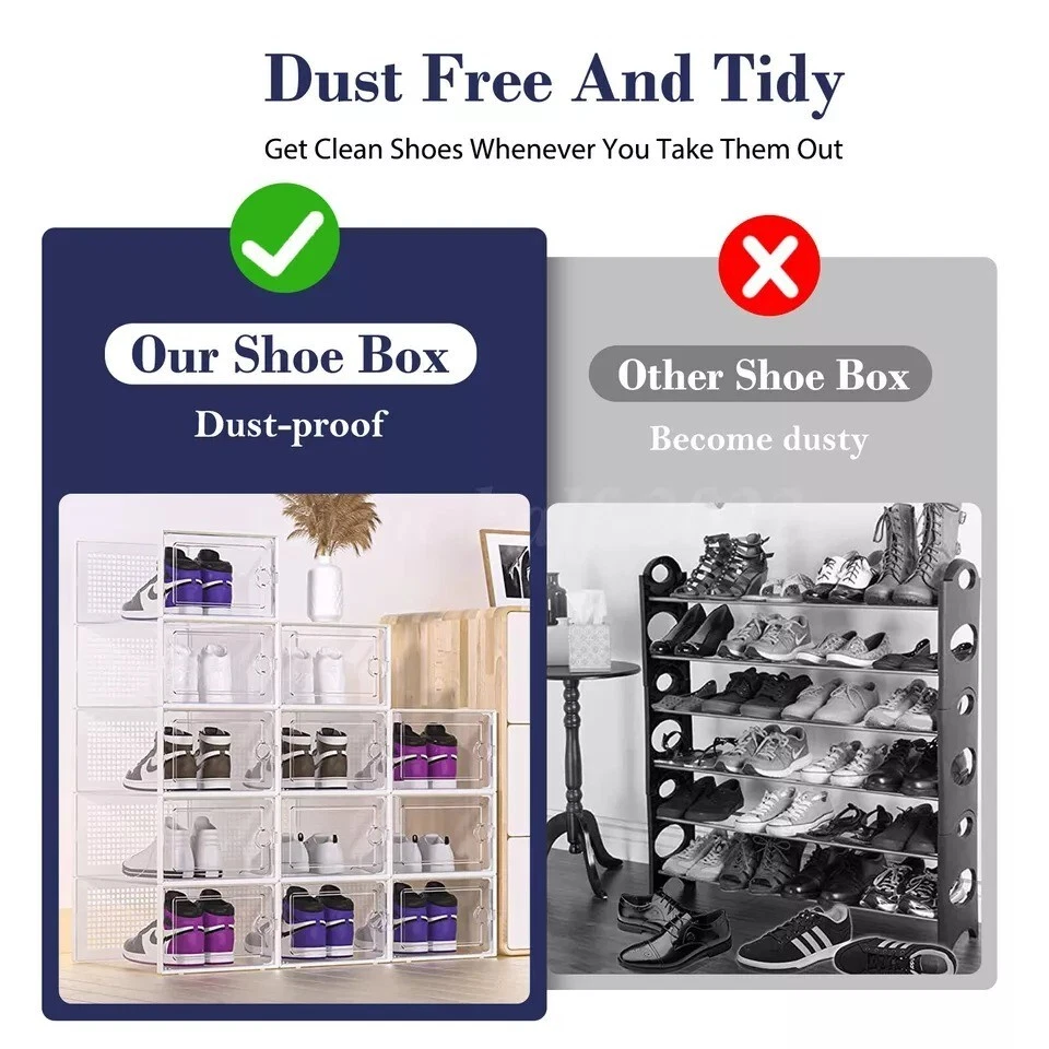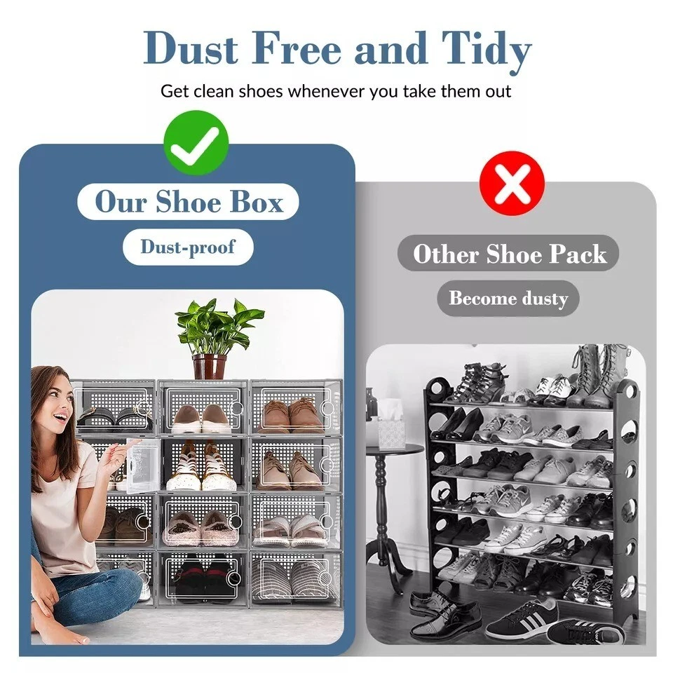 Free eBay listing template designed by dewiso.com 12 PCS Shoe Storage Box Clear Stackable Shoe Container Sneaker Organizer XL About this item X Large Size Shoe Box: Upgraded wider and higher shoe organizer fit for larger shoes size . Unit size is 13.1 "(L) x 10 "(W) x 6 "(H), fits for women’s shoes up to US size 11 and men’s shoes up to US size 10. Suitable for many types of shoes such as heels, flats, sneakers, leather shoes, sandals, wedges, and others shoes. Stable Stacking and Easy to Assemble: Upgrade new slot lock design just only two steps “INSERT-and- SLIDE” to finish the stacking, more stable stacking structure for moving overall. JUST THREE STEPS finsh assembly as follow the assembly manual and video on Youtube. Alternatives to Traditional Shoe Racks: Compared with traditional shoe rack, shoe storage box with lid is dust-free and stackable. Modular design make combine them according to available space conveniently, easy to move and use. Clear Shoe Manager: Clear shoe boxes stackable helps you search for your shoes quickly and efficiently, and ventilation design allows air circulation and odor prevention. Limited space saving fit for in the closet, wardrobe, hallway, entryway, bedroom, under bed and so on. Service: 12 PACK shoe storage box in package. 24/7 online customer service, any problem we will slove for you. Brand Secret Space Color White (12 PACK ) Material Plastic Special Feature Portable, Easy to Install, Removable, Waterproof, Dustproof Style 12 Pack Features and further details Additional Features Portable, Easy to Install, Removable, Waterproof, Dustproof Closure Type Flip Top Water Resistance Level Waterproof Opening Mechanism Slide Occasion Christmas, New Year'S, Birthday, Thanksgiving Style Name 12 Pack Shape Rectangular Pattern Solid Occasion Christmas, New Year'S, Birthday, Thanksgiving Contact us We can be contacted at any time through eBay messages if you have any questions, comments or product requests. We will respond to you within 24 hours and do our best to help you out! We encourage our customers to contact us with any questions or concerns! We'd like to be sure you are completely satisfied with your purchase. Payment We accept PayPal, PayPal Credit, Visa, Mastercard, American Express, Discover, Google Pay, and Apple Pay. Immediate Payment is Required! Shipping We provide FAST, FREE SHIPPING to the Continental 48 US States. We do not ship to Alaska, Hawaii, APO/FPO, PO Boxes, or any US Protectorates. PLEASE PROVIDE A PHYSICAL ADDRESS. Your order will be processed within the allotted time frame. Most items ship out with 1-3 Business Days after payment is received. Please not that some orders may be shipped in multiple packages. Return If you have any problem with product we can accept return within 30 days after purchase. If you want to return product, you can contact with us. HAVE A NICE SHOPPING!!!