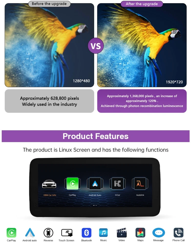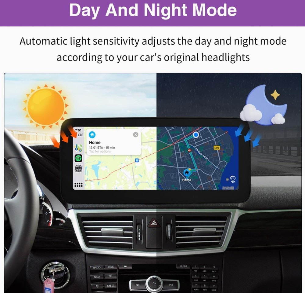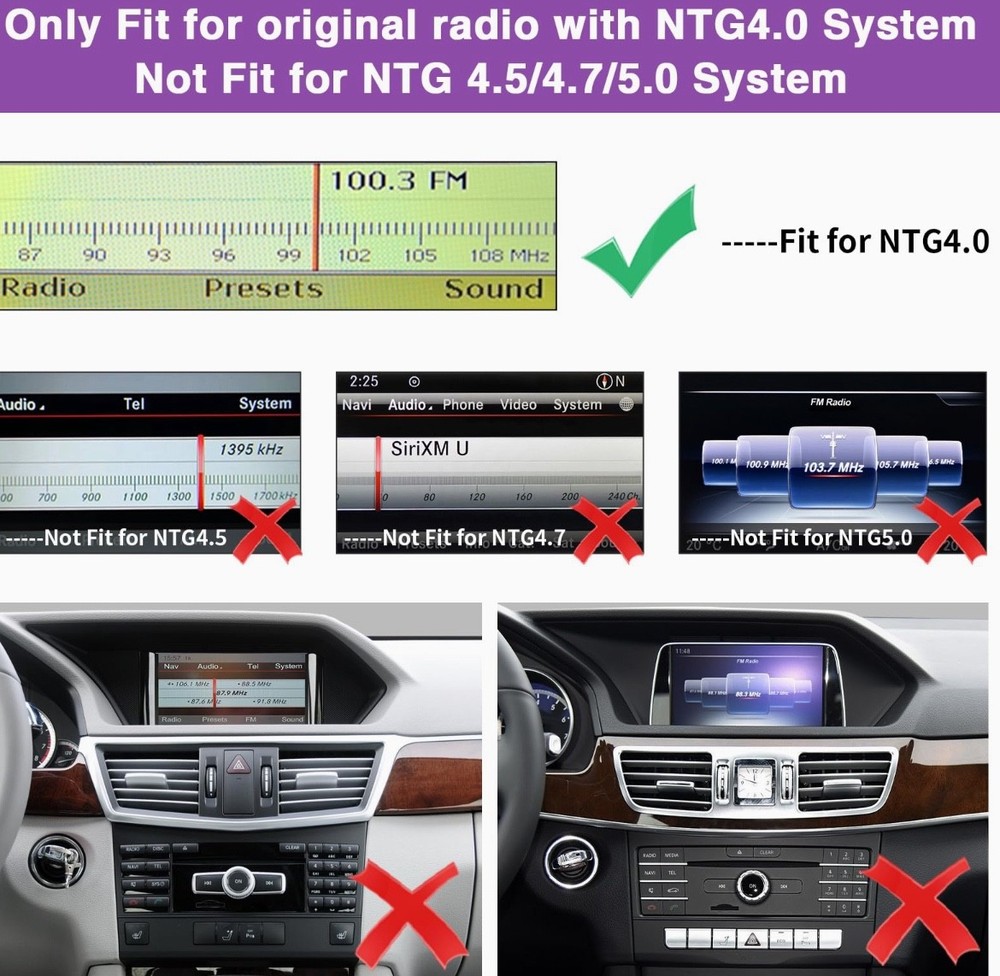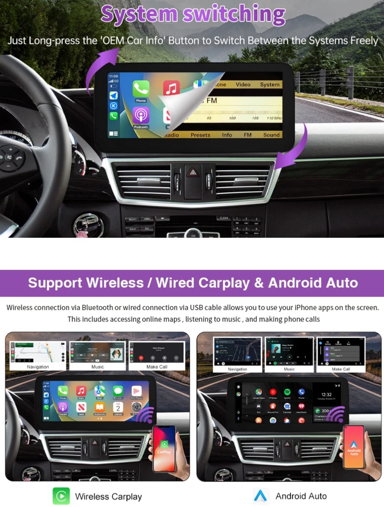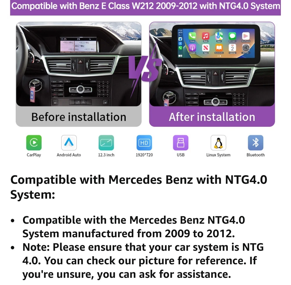 #2732 12.3 inch Touchscreen Wireless CarPlay Android Auto Multimedia Car Radio Receiver Compatible with Mercedes Benz E Class W212 with NTG4.0 System (2009-2012) Brand ninetom Connectivity Technology Bluetooth, USB Compatible Devices Smartphone Total HDMI Ports 1 Connector Type HDMI, RCA Audio Output Mode Stereo, Surround 【Pre-shopping Notes】This touchscreen is compatible with the Mercedes Benz NTG4.0 system. It is not compatible with other systems. It's designed for use with Mercedes Benz E Class W212 (2009-2012). Not Fit for E coupe car.This touchscreen operates on a Linux system, ensuring stable performance without freezing issues over prolonged use. 【Built-in Carplay & Android Auto】Built-in wired and wireless Carplay & Android Auto support Siri or touch display interaction. You can access GPS, make calls, send and receive messages, and enjoy music, among other functions. It's a smarter, safer, and more enjoyable way to use your phone in the car. 【Supports Original Functions】The upgraded touch screen retains all original functions, including the original car radio, amplifier function, factory joystick control, original reversing camera, and more. No software changes are made to the vehicle's control units. It supports the use of original or aftermarket rearview cameras and is compatible with DVR systems. 【Upgrqaded Screen Resolution】You can connect via USB to play your favorite music or videos. The 1920 * 720 HD resolution touchscreen enables more convenient movie viewing and supports mirror link functionality. Automatic light sensitivity adjusts the display between day and night modes based on your car's original headlights, ensuring a more comfortable driving experience. 【Easy installation】 The original car cable allows for plug-and-play installation, eliminating the need for cutting or breaking cables, ensuring a non-destructive process. The package includes an 12.3" touchscreen and all necessary cables. If you encounter any installation issues, please reach out to us for assistance.
