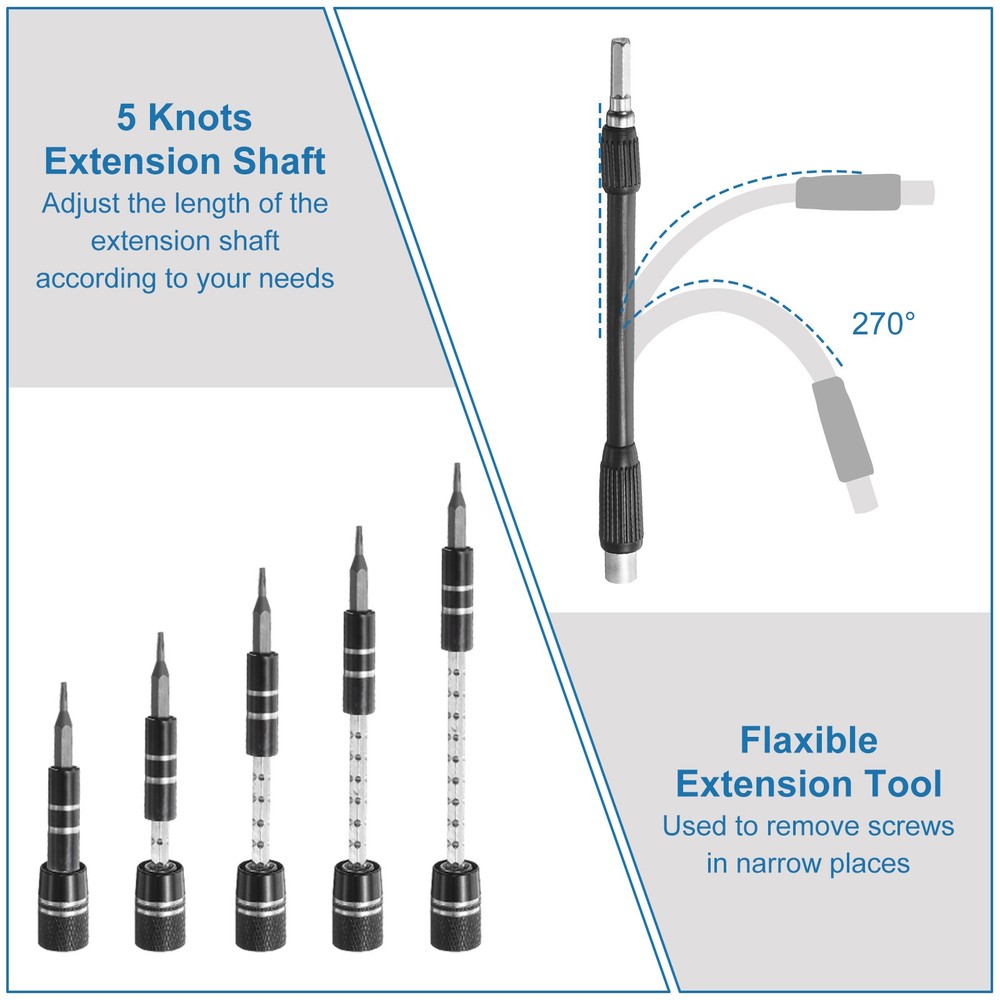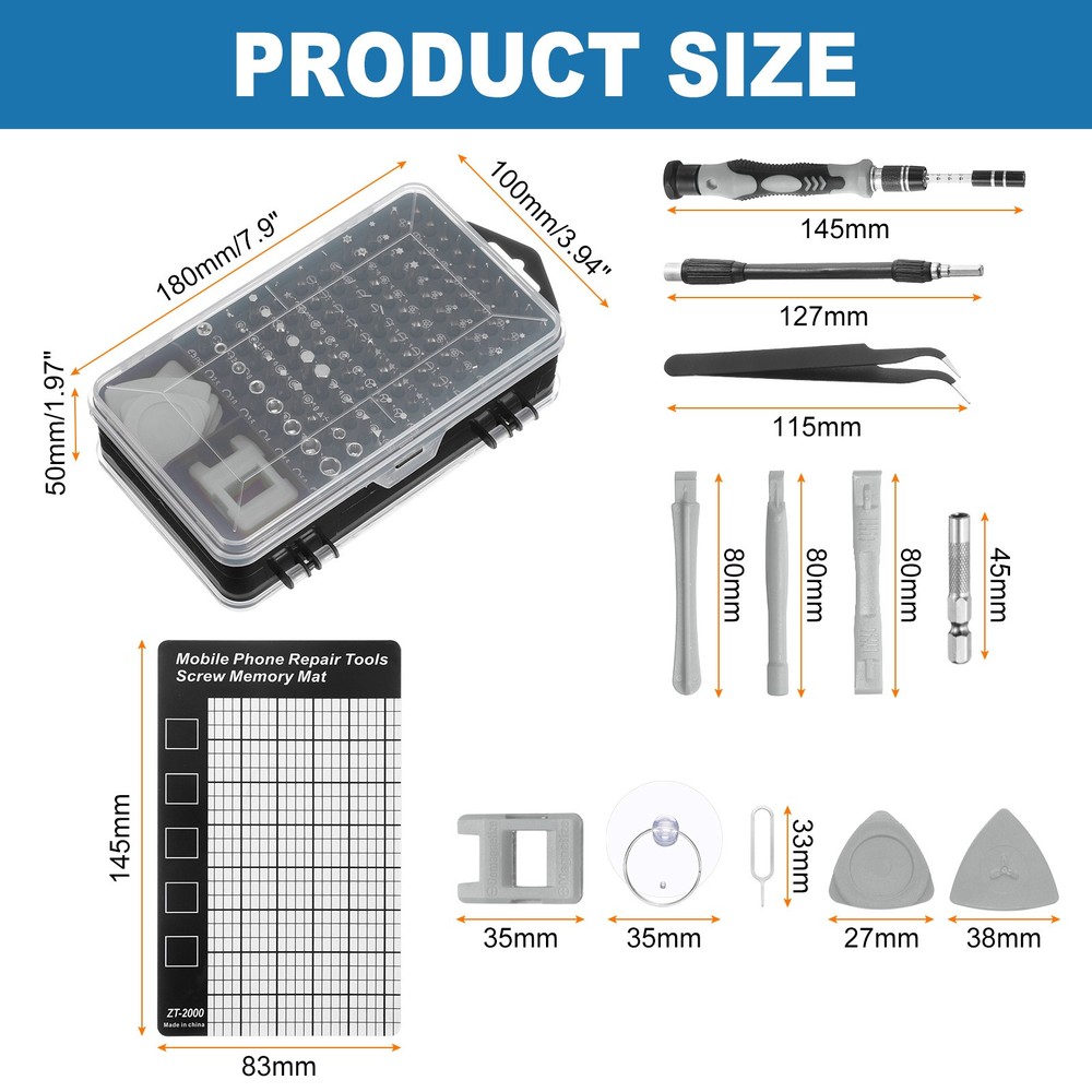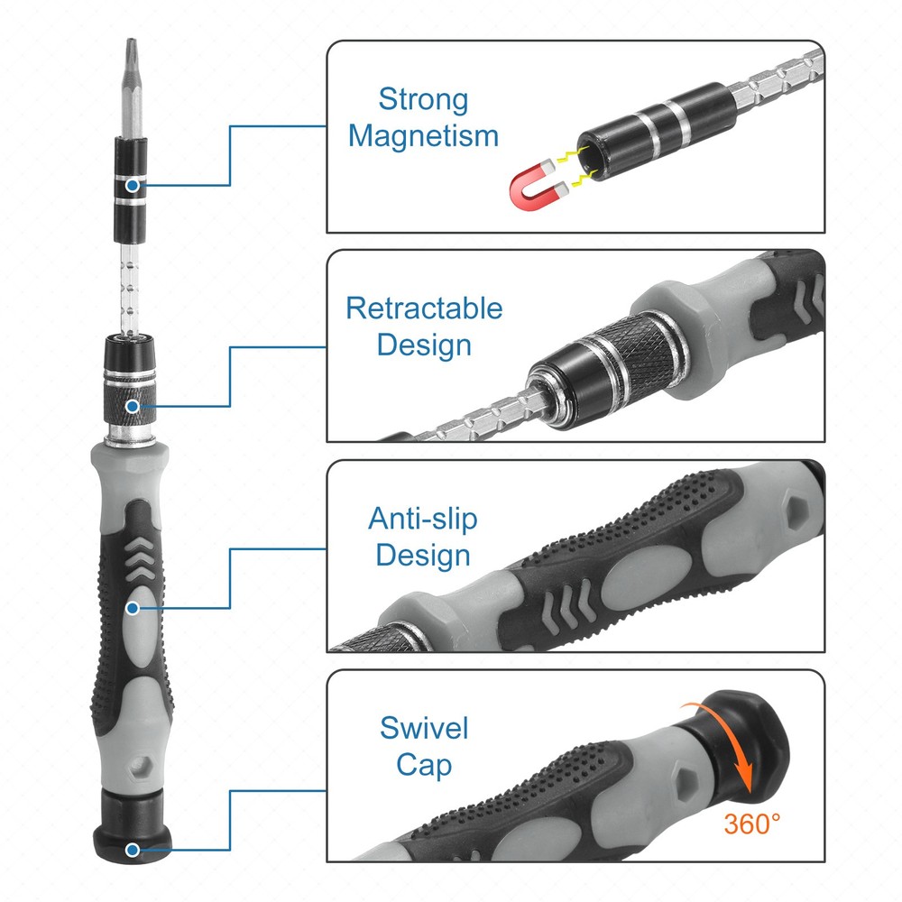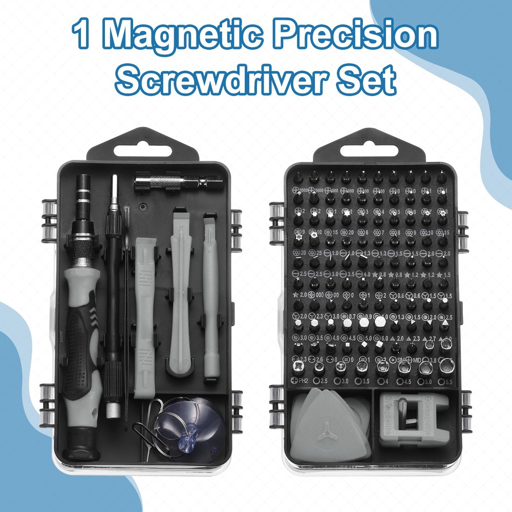 Document The precision drill bits are made of chrome vanadium steel, which is hard, corrosion-resistant, wear-resistant, sturdy and durable, and can be used for a long time.The screwdriver handle is made of granular grip and rubber, ergonomic handle, non-slip and wear-resistant, telescopic design, rotatable top, comfortable grip; the universal extension soft rod can be used to remove screws in narrow places.The magnetizer tool helps to enhance the magnetism of the screwdriver bits, making it easier to adsorb and fix screws, or weaken the magnetism to avoid potential damage or interference when handling items that are easily affected by magnetic field such as sensitive electronic devices.All screwdriver bits are neatly stored in rubber drill bit holders and are labeled with type and size for quick identification. The repair tools are packed in a box, so there is no need to worry about anything getting lost. It is easy to carry and can be easily placed in various places such as home, office, vehicle or drawer, which helps keep the workplace clean and organized, while also ensuring that the tools are easy to find and readily available.The 123-in-1 mini screwdriver set is magnetic and easy to remove and install small screws. It is suitable for repairing electronic products and high-precision instruments such as mobile phones, tablets, laptops, PCs, game consoles, cameras, precision instruments, watches, glasses, etc., and is used to repair various parts of electronic devices. 123 in 1 Magnetic Precision Screwdriver Set Electronics Repair Tools Kit, Grey The precision drill bits are made of chrome vanadium steel, which is hard, corrosion-resistant, wear-resistant, sturdy and durable, and can be used for a long time. The screwdriver handle is made of granular grip and rubber, ergonomic handle, non-slip and wear-resistant, telescopic design, rotatable top, comfortable grip; the universal extension soft rod can be used to remove screws in narrow places. The magnetizer tool helps to enhance the magnetism of the screwdriver bits, making it easier to adsorb and fix screws, or weaken the magnetism to avoid potential damage or interference when handling items that are easily affected by magnetic field such as sensitive electronic devices. All screwdriver bits are neatly stored in rubber drill bit holders and are labeled with type and size for quick identification. The repair tools are packed in a box, so there is no need to worry about anything getting lost. It is easy to carry and can be easily placed in various places such as home, office, vehicle or drawer, which helps keep the workplace clean and organized, while also ensuring that the tools are easy to find and readily available. The 123-in-1 mini screwdriver set is magnetic and easy to remove and install small screws. It is suitable for repairing electronic products and high-precision instruments such as mobile phones, tablets, laptops, PCs, game consoles, cameras, precision instruments, watches, glasses, etc., and is used to repair various parts of electronic devices. Hot Item Payment 1.We accept eBay payment . 2.Payment must be received within 7 business days of auction closing. Shipping 1.We ship to your eBay or Paypal address. Please make sure your eBay and Paypal address is correct before you pay. 2.Items will be shipped within 1-3 business day when we received payment. 3.Delivery time depends on destination and other factors. Description Policy 123 in 1 Magnetic Precision Screwdriver Set Electronics Repair Tools Kit, Grey The precision drill bits are made of chrome vanadium steel, which is hard, corrosion-resistant, wear-resistant, sturdy and durable, and can be used for a long time. The screwdriver handle is made of granular grip and rubber, ergonomic handle, non-slip and wear-resistant, telescopic design, rotatable top, comfortable grip; the universal extension soft rod can be used to remove screws in narrow places. The magnetizer tool helps to enhance the magnetism of the screwdriver bits, making it easier to adsorb and fix screws, or weaken the magnetism to avoid potential damage or interference when handling items that are easily affected by magnetic field such as sensitive electronic devices. All screwdriver bits are neatly stored in rubber drill bit holders and are labeled with type and size for quick identification. The repair tools are packed in a box, so there is no need to worry about anything getting lost. It is easy to carry and can be easily placed in various places such as home, office, vehicle or drawer, which helps keep the workplace clean and organized, while also ensuring that the tools are easy to find and readily available. The 123-in-1 mini screwdriver set is magnetic and easy to remove and install small screws. It is suitable for repairing electronic products and high-precision instruments such as mobile phones, tablets, laptops, PCs, game consoles, cameras, precision instruments, watches, glasses, etc., and is used to repair various parts of electronic devices. Hot Item Payment 1.We accept eBay payment . 2.Payment must be received within 7 business days of auction closing. Shipping 1.We ship to your eBay or Paypal address. Please make sure your eBay and Paypal address is correct before you pay. 2.Items will be shipped within 1-3 business day when we received payment. 3.Delivery time depends on destination and other factors.