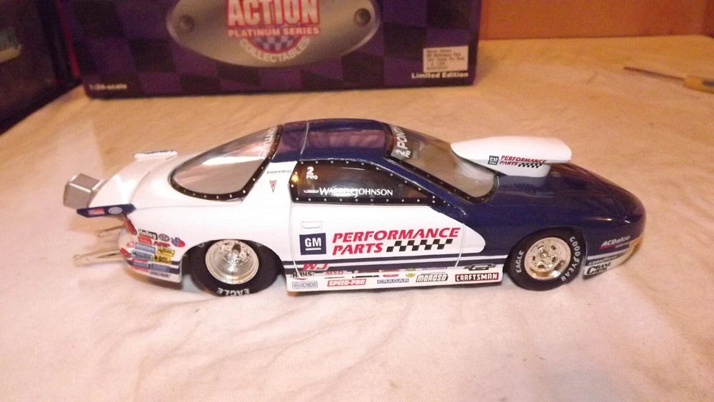 This limited edition 1/24 scale diecast model of a 1997 Warren Johnson GM Performance Parts Pontiac NHRA Pro Stock Car is a must-have for any car enthusiast or collector. The multi-colored car, featuring the iconic NHRA organization and driver Warren Johnson, is intricately detailed and made with high-quality materials. The action-packed design and attention to detail make this model a perfect addition to any collection, whether it's for display or play. This car is part of the Cars character family and is a great representation of the sport and touring car category. Get your hands on this unique and rare item today!