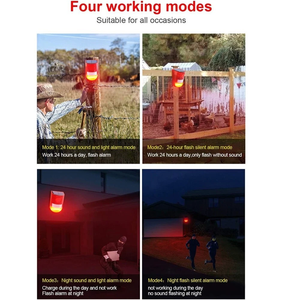 1/2/4/6/8Pcs Solar Alarm LED Light Solar Strobe Light Wireless Motion Sensor Detector Outdoor # Ship within 24 hours. # 100% New & Excellent Quality # Strictly QC, Each item was fully checked before shipping # FREE & FAST Shipping delivery with Tracking Number ✔️ Features: 1.Solar acoustooptic alarm lamp has two functions, the first mode is 24-hour induction acoustooptic alarm in daytime. 2.The second mode is night mode (no daytime induction,dark induction acoustooptic alarm), induction distance of 5-8 meters. 3.Modal induction angle 110 degrees, solar light about 6 hours full of electricity, a charge can be used 24 hours a day for 30 days of ultra-long duration, 365 days continuous power, no power-consuming alarm lights. 4.It is suitable for farms, villas, orchards, tea gardens, farms, factory warehouses and other places. ✔️ Function: Daytime mode (24-hour induction acoustooptic alarm) Night mode (no daytime induction, dark induction acoustooptic alarm) Only flashing lights during the day without sound Only flashing at night without sound ✔️ Specifications: * Solar panels: 5V*0.6W polycrystalline silicon * LED: 6 flash red lights, 1000 meters visible * Product Material: ABS * Size: 4.72''x2.72"/120x69mm * Waterproof grade: IP65 * Induction Angle: Film Induction Angle 110 Degree * Charging Method: Solar Energy Charging * Alarm sound: 110 decibels (1000 meters clear) * Induction distance: 5-8 m/16.4-26.2 ft (affected by ambient temperature) * Battery parameters: 3.7V*400mAh full capacity polymer lithium battery * Working hours: induction 45 seconds or so sound and light alarm more than 300 times, once charged, standby for 30 days ✔️ Package Included: 1/2/4/6/8PC Solar Warning Light. Detail Image: Payment: 1.We accept ebay payment only. 2.All major credit cards are accepted through secure payment processor ebay payment. Shipping: 1.We ship to your eBay or ebaypayment address. Please make sure your eBay and ebaypayment address is correct before you pay. 2.Items will be shipped within 1-3 business day when we received payment. 3.Delivery time depends on destination and other factors; 4.International buyers please note: a.Import duties, taxes and charges are not included in the item price or shipping charges. These charges are buyer’s responsibility. We will try our best to reduce the risk of the custom duties. b.Please check with your country's customs office to determine what these additional costs will be prior to buying. Returns: Please contact me before opening any return,don't worry, I will definitely solve your problem.thank you!!! 1) If you received an incorrect, damaged, defective, or item not as described, contact us for a partial/full refund or replacement on our cost. 2) If you want to return the item, please contact us within 30 days after package received. Return products must also be in its original condition: including box, packaging and all other accessories. Payment 1.We accept PayPal only! 2.Please keep the consistency of the address from Paypal and eBay. 3.Payment must be received within 3 days since you won the item, or eBay will launch Unpaid Reminder Against you. Delivery Details 1. All items will be shipped to buyer's ebay address,we don't take charge for wrong address left. 2. All items will be shipped within 24 working hours upon receipt of payment, and multiple items will be combined shipping. 3. In most cases, delivery takes around 1-7 business days from US Warehouse by UPS/USPS, it's highly depended on the efficiency of the shipping carrier. If your item doesn't arrive on time, please contact us immediately for further assistance. Please note there is no local pickup service available. Term of Sales Customer satisfaction is our top priority. Please message us over the eBay messages. All returns must have RMA number. Returns with no RMA number will be avoided! Changed your mind and don't want the item anymore? No Problem! Please contact us within 30 days. We do not charge restocking fee unless the item you are returning is Brand New. Defective/Dead items will be fully refunded or replaced after matching the serial number with the one in our records. Order/bid cancellation: We can cancel your order only if you contact us within 15 min after your purchase. No exceptions. If your order arrives incorrect or the package is damaged in result of a carrier company, you must notify us within 2 days of receipt. We are aware of all fraud cases and have all the items details in our records. If the goods are not defective, you will be responsible for the return postage costs. Returned item must include all previously included accessories. No restocking fee will apply. If there is a quality issue or malfunction with the product, we strongly suggest you to contact us asap. Any item needed to be returned must be securely packaged, insured and shipped with tracking for safety. We cannot be responsible for lost damaged packages. We carefully inspect returned items upon receipt before any possible refunds, credits, or exchanges. Thank you for purchasing from us We are professional manufacturer seller. All products are factory direct sales, best quality at best price.We strive for 100% customer satisfaction. We maintain high standards of excellence and strive for 100% customer satisfaction. Positive feedback with 5 star rating is very important to us. Please give us a chance to resolve any issues before posting a neutral or negative feedback. Thanks a lot. 1. All items will be shipped to buyer's ebay address,we don't take charge for wrong address left. 2. All items will be shipped within 24 working hours upon receipt of payment, and multiple items will be combined shipping. 3. In most cases, delivery takes around 2-3 business days from UK Warehouse by RoyalMail, it's highly depended on the efficiency of the shipping carrier. If your item doesn't arrive on time, please contact us immediately for further assistance. Please note there is no local pickup service availabl