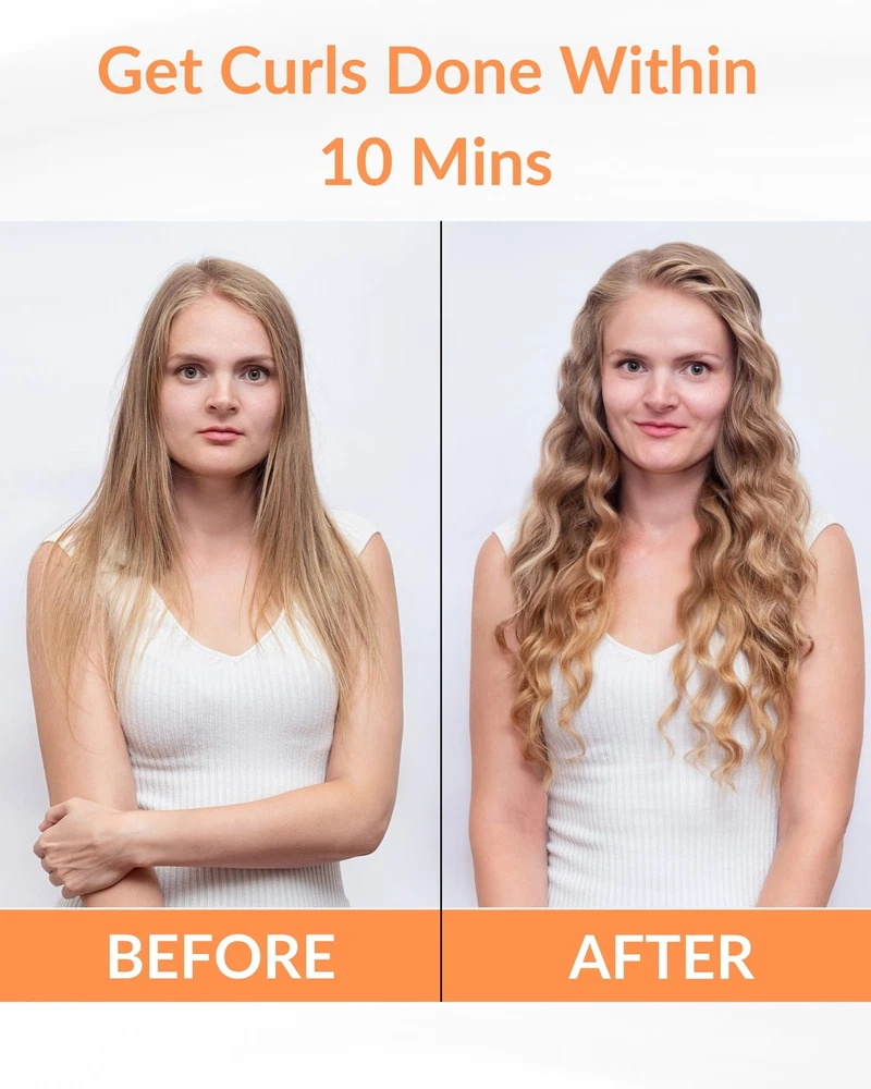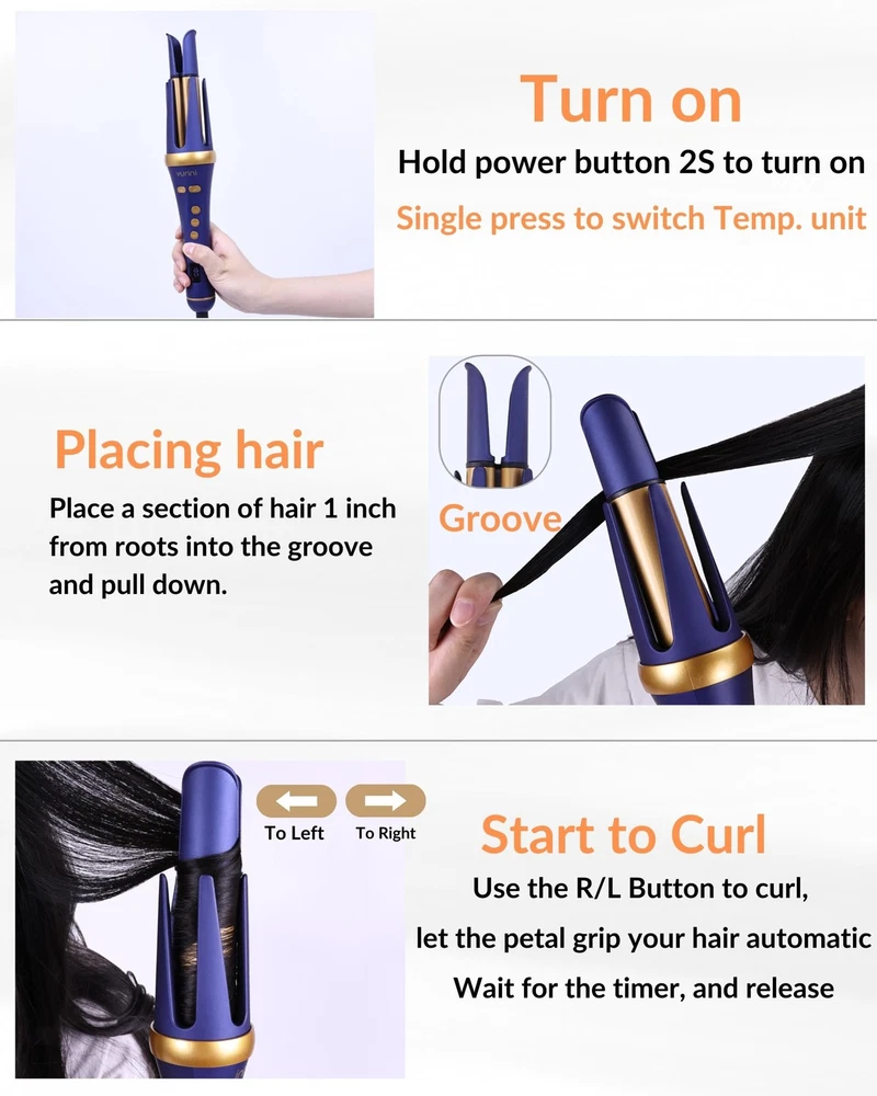 Experience Effortless Styling with the Automatic Hair Curler Transform your hair into beautiful, long-lasting curls with the Automatic Hair Curler. Designed for both beginners and pros, this curler heats up in just 30-60 seconds, offering seven precise temperature settings ranging from 300°F to 420°F. The versatile 1.25-inch barrel effortlessly creates a variety of styles, from soft waves to defined curls, all while saving you precious time. Safety is at the core of ’s design. Our advanced anti-scald technology ensures that your fingers and head are safeguarded from burns, allowing you to style with confidence every time. The ergonomic design makes this curler easy to handle, perfect for anyone looking to achieve salon-worthy results at home. Enhance your hair’s natural shine and health with ’s exclusive IonicCeram technology. The ceramic coating on our curler releases billions of negative ions, which help to evenly distribute heat, reduce frizz, and lock in moisture. The result? Silky, smooth curls that look vibrant and feel soft to the touch. Take full control of your styling with our LCD display, which offers precision heat settings and five customizable timer options (8s, 12s, 16s, 20s, 24s). Whether you're creating tight curls or loose waves, the dual voltage feature (110-240V) makes it easy to achieve perfect results no matter where you are. stands behind the quality of our products. That’s why we offer a 1-year warranty on our Automatic Hair Curler. Follow our detailed product manual to get the most out of your curler, and if you ever have any questions, our dedicated customer support team is here to help. Upgrade your hair routine with the Automatic Hair Curler, and enjoy effortless, professional-grade styling at home. 𝗧𝗿𝗮𝗻𝘀𝗳𝗼𝗿𝗺 𝗬𝗼𝘂𝗿 𝗛𝗮𝗶𝗿 𝗶𝗻 𝗠𝗶𝗻𝘂𝘁𝗲𝘀: The Auto Hair Curler heats up in 30seconds and features a simplified curling process that's easy for beginners. Achieve your desired beach waves in just 10 minutes! Whether you want soft waves or defined curls, this curler saves you time while delivering stunning results effortlessly. 𝗡𝗼 𝗧𝗮𝗻𝗴𝗹𝗲, 𝗡𝗼 𝗕𝘂𝗿𝗻: The Auto Curling Iron features a rotating petal design that eliminates the risk of burns during styling. Its exclusive curling wand with groove gently guides your hair, allowing it to curl effortlessly. 𝗦𝗵𝗶𝗻𝘆, 𝗛𝗲𝗮𝗹𝘁𝗵𝘆 𝗖𝘂𝗿𝗹𝘀 𝗘𝘃𝗲𝗿𝘆 𝗧𝗶𝗺𝗲: Experience ’s curling wand with ceramic coating technology, which releases billions of negative ions, evenly distributing heat to reduce frizz and enhance shine. The result? Gorgeous, smooth curls that look healthy and vibrant. 𝗦𝘂𝗶𝘁𝗮𝗯𝗹𝗲 𝗳𝗼𝗿 𝗔𝗹𝗹 𝗛𝗮𝗶𝗿 𝗧𝘆𝗽𝗲𝘀: The Auto Curler’s offers 7 temperature ( 300-420 ℉) and five customizable timer settings (8s, 12s, 16s, 20s, 24s). Choose the settings based on your hair type to achieve stunning results without damage. 𝗚𝘂𝗮𝗿𝗮𝗻𝘁𝗲𝗲𝗱 𝗤𝘂𝗮𝗹𝗶𝘁𝘆 & 𝗦𝘂𝗽𝗽𝗼𝗿𝘁: Trust in ’s commitment to quality with a 1-year warranty. Follow our easy-to-use product manual for the best results, and rest easy knowing our dedicated customer support team is ready to assist you with any concerns.
