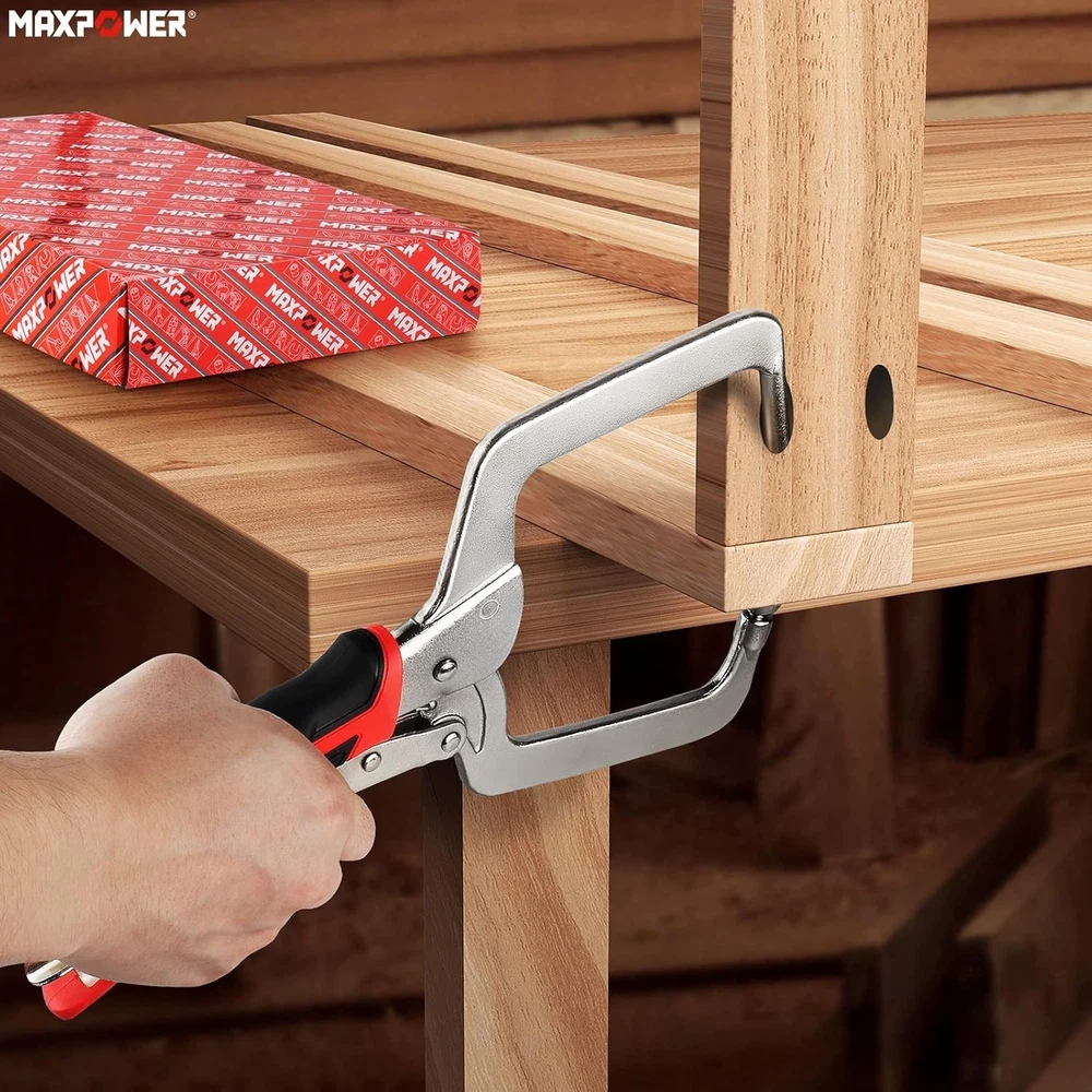 Fast Friday Store ✿✿✿✿✿ 12.5" Pocket Hole Clamp, Right Angle Clamp for Woodworking & Pocket Hole Joinery ☛ The clamp jaw depth is 4" (102 mm) and the clamping capacity is up to 4 inches, keep pocket-hole joints at 90 degrees during project assembly ☛ The clamps are forged with Cr-V steel and high hardness tough after Integral heat treatment. High-quality nickel-plated alloy steel increases rust resistance ☛ The ergonomic handles make for comfortable clamping while the quick-release lever allows users to disengage pressure quickly ☛ Screw adjustable locks with a trigger release, turn the screw to adjust pressure and fit work, hex key receiving hole on knurl for increased torque & convenience ☛ Perfect for woodworking and pocket hole joinery, the metallic no-mar swivel pads always ensure even and secure clamping