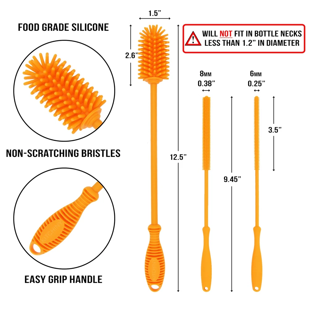 HOW TO USE: Be aware that silicone is non-absorbent, so it CANNOT hold soap, lather up or get sudsy like a sponge. For optimum cleaning results when using our bottle brush, first add warm, soapy water to your container, and then scrub away. The minimum diameter neck the brush will squeeze into is 1 1/8” wide, so it won't fit in beer, wine, swing-top or kombucha bottles. DEEP CLEANING POWER: With its 12.5” long, non-flexible steel shaft and rugged silicone bristle head, our water bottle brush gets deep down into tall, narrow containers such as insulated water bottles, flasks, thermoses, baby bottles, vases and skinny glassware. BETTER HYGIENE FOR YOU: Our silicone water bottle cleaner repels unpleasant odors and stains - unlike sponge and nylon brushes that fall apart, and get smelly after a few uses. This bottle scrubber prevents nasty grime build-up which is more hygienic and healthier for your family NO MORE SCRATCHES: The easy-clean, non-scratching silicone bristles of our 12.5” long bottle cleaning brush are tough on gunk, yet gentle enough to leave your favorite vase, glass water bottle, pitcher, blender and delicate glassware clean and scratch-free SAY GOODBYE TO GRUNGY CONTAINERS: It’s great as a sports bottle cleaner brush, for swishing slimy dregs from your flask, scrub soup from your thermos, or blitz residue in your baby bottle. Our 12.5” long bottle brush is perfect as a travel bottle brush too! LONG LASTING & DURABLE: The sturdy bristles of the rugged bottle brushes for cleaning will keep their shape, and won’t break off or fall apart. Our long bottle brush fits in 1 1/8” width bottle necks or larger, and heat-resistant up to 400°F.