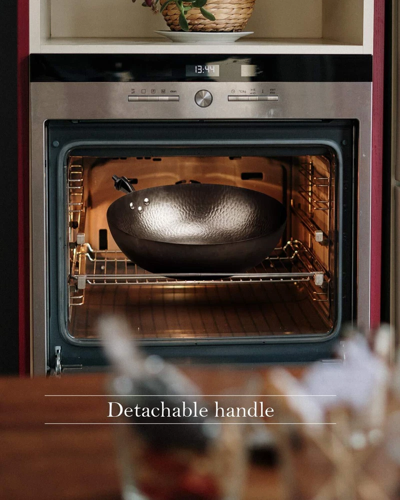 SUPERIOR VALUE: Our wok possesses a thicker body, 1.5cm as opposed to the standard 1.2-1.4cm, guaranteeing optimal and even heating, therefore enhancing your cooking experience. With the addition of unique aluminum components, a beechwood handle, it delivers something more - elevating both its practicality and aesthetic appeal. MUlTI-PURPOSE WOK SET: The wok, crafted from carbon steel, boasts exceptional heat conduction and durability, perfect for creating authentic Chinese cuisine. It is also versatile, suitable for cooking a wide variety of ingredients and adaptable to numerous cooking methods. This helps maintain the flavor and nutritional value of your food. So go ahead and give it a try! EMBRACE A HEALTHIER & LASTING:The surface is nitrided, our woks are proudly Teflon-free. Although not a typical non-stick woks & stir-fry pans, rest assured, with the right seasoning, its performance only gets better! And what's more, its life is significantly extended, and the risk of rust is lessened. SUITABlE FOR ALL STOVE:SUITABlE FOR ALLSTOVE: The flat-bottom design makes it suitable for all types of stoves, including , gas, ceramic, induction, and open flame.The removable wooden handle allows you to easily put it in the oven, oven-safe to 450F. SOME DETAILED DESIGNS: The step design made the wooden lid to match the pot, the soup mouth design is easy to pour soup, the detachable handle is easy to save, also easy use in the oven and the hammer pattern looks very special. CARE & GUIDELINES - We value your suggestions for our product. Remember, refer to the manual before first use. Clean promptly and keep dry after each use to prevent rusting. Regularising cooking oil application after cleaning will keep it in the best condition.