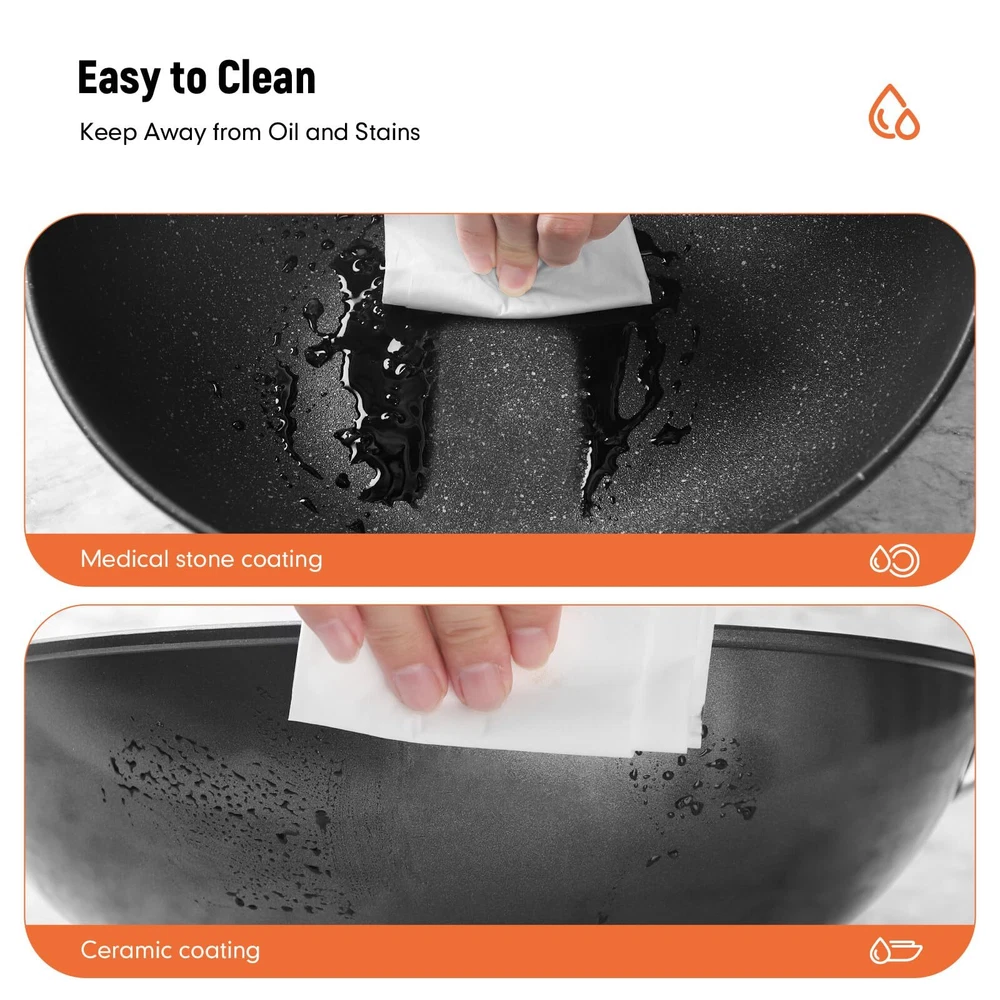 Non-stick & Easy Cleaning: The woks and stir fry pans nonstick with a lid to adopt stone coating and carbon steel which are free of PTEE and PFOA, allow you to cook with LESS oil or butter. Less lampblack, more healthy. Cleans up easily, dishwasher safe (hand wash is recommended). Don't need seasoning before use. Rough Rust-resistant & Prevention coating fall off: This coating uses hardening and anti-scratch technology to prevent scratching, staining, and falling off, enhances both durability and cooking performance which will not get rusty. Versatility: The non sticking frying pan set is everything you need to prepare delicious stir-fry, steaming, roasting, boiling, baking meals, and more. The non stick stone wok with the cover set can be used as a deep fry pan, saute pan, deep skillet, frying wok, stir fry wok, stir fry pan, baking dish, egging frying pan, roasting pan, rice cooker, steamer, and deep stockpot. The wok is suitable for a family of 5-6 people with a large capacity, not afraid of splashing oil. Heats quickly and evenly & Suitable for most stoves: The flat bottom conducts heat quickly and evenly with precise temperature control. The 2 mm-thick body makes this wok pan durable and anti-warping. Suitable for all occasions, with stoves, induction cooker, gas ranges, and other heat sources. Package: The pots and pans set nonstick includes a 12.5-inch nonstick frying pan with a lid and a roasting steaming rack. The wooden handle is in line with the human body, engineered solid wood anti-scalding design keeps a cool feel when cooking at high temperature.