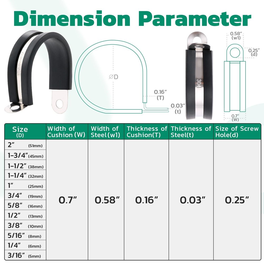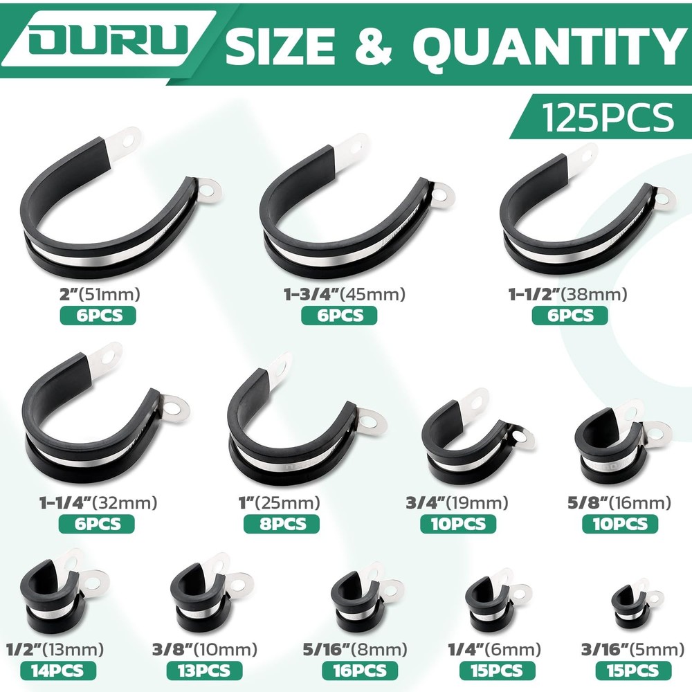 125PCS Cable Clamps Assortment Kit —The stainless steel cable clamps assorted box including 12 different sizes,15pcs 3/16’’(5mm),15pcs 1/4’’(6mm),16pcs 5/16’’(8mm),13pcs 3/8’’(10mm),14pcs 1/2’’(13mm),10pcs 5/8’’(16mm),10pcs 3/4’’(19mm),8pcs 1’’(25mm),6pcs 1-1/4’’(32mm),6pcs 1-1/2’’(38mm),6pcs 1-3/4’(45mm),6pcs 2’’(51mm),various sizes are available to meet your needs Thick Metal Strap-Each stainless cable clamp is made of 304 high quality stainless steel with rubber coated cushioned,less susceptible to deformation and bending.Excellent performance in abrasion,moisture,rust and heat resistance even in harsh environments.It is strong and will not rust or break.It is the best choice for indoor and outdoor Durable Rubber Cable Clips-Reinforced EPDM tape,anti-cracking.The nylon rubber cushioned on the tube clamp prevents damage caused by shock due to vibration,effectively protects the line and tubing.Silicone insulation provides a safer installation.It can be firmly fixed in the right position,clamped tightly without wiggling Easy Installation-The 125pcs cable clamp set(5-51mm) in a storage box for easy to carry and . With unique R-shaped design,flexible twisting and easy to control during installation,simple disassembly.You only need to use a screwdriver and screws to fix the clamps in the proper place,save time and effort.It can be recycled and reused,can be used for a long time Ideal for Application-The marine grade rubber p clamp.Used to fix and support pipes or wires and cables in automotive,industry,boat,outdoor,home decoration,DIY,RVs and any place where vibration may occur.Such as wires,cables,pipes,line management and repair