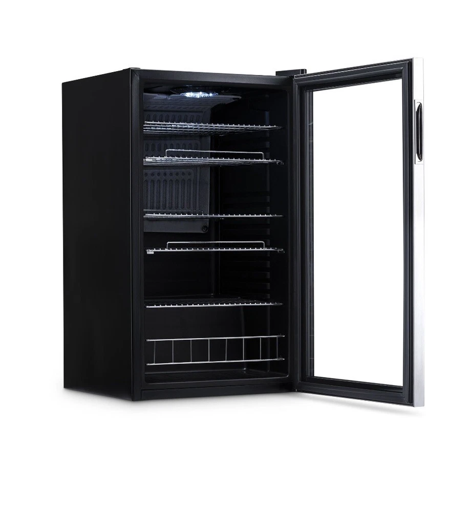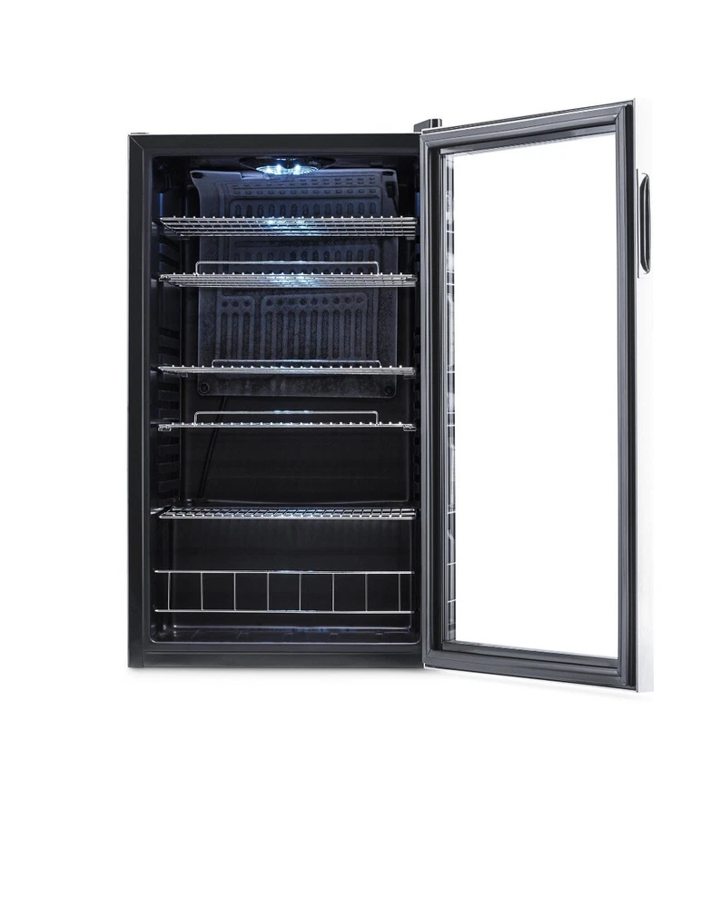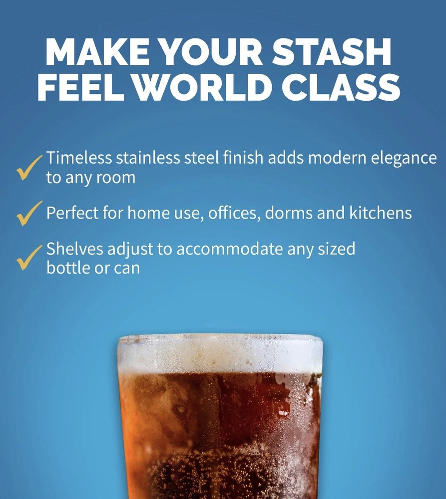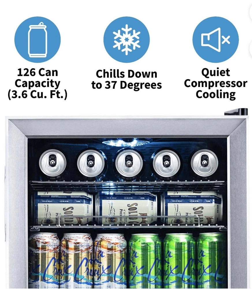 126-Can Stainless-Steel Freestanding Beverage Center:: • Roomy design holds 126 cans in an attractive, stainless-steel design • The beverage center features removable storage racks to create space for cans, bottles, and more • Set-and-forget-it thermostat comes with 7 custom settings • A quiet 35dB compressor is ideal for homes, offices, dorm rooms, and more