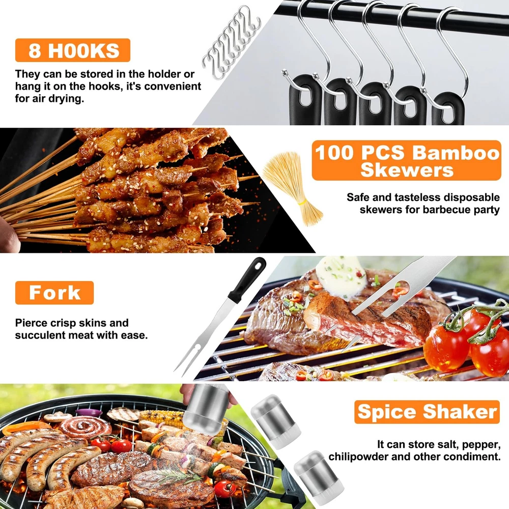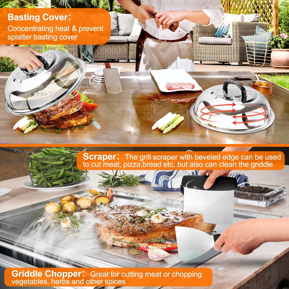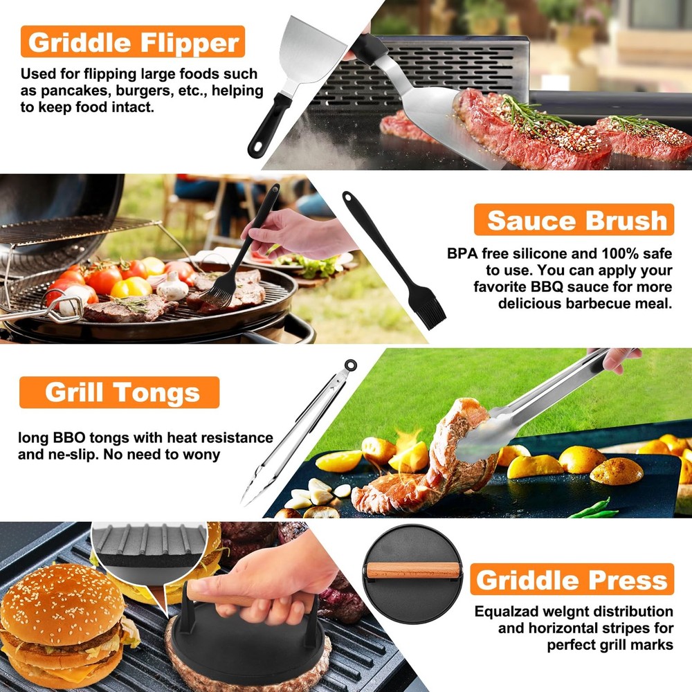 Are you still struggling to prepare a barbecue for your friends' gatherings because you lack the right tools? Our griddle accessories kit contains 127 invaluable accessories, covering everything you need during the cooking process, from spatulas and scrapers to oil bottles and brushes, ensuring no detail is overlooked. We craft each griddle accessories for blackstone with high-quality materials, ensuring durability and reliability. Whether you're grilling outdoors or cooking at home, our griddle tool set can withstand high temperatures and heavy use, helping you effortlessly tackle any cooking challenge. 127 PIECES GRIDDLE ACCESSORIES KIT Our grill cessories kit is made of premium stainless steel, ensuring safety and durability with non-toxic, rust-resistant, and heat-resistant properties. The heat-resistant ABS handles prevent burns during high-temperature cooking. Included is a convenient storage box for easy organization and storage of all accessories. Additionally, all flat top grill accessories are dishwasher safe, saving time and effort, allowing you more time to focus on cooking delicious meals. Packaged in an exquisite gift box, it's a practical gift choice for both family and friends or for your own kitchen arsenal. The griddle accessories for blackstone is not only functional but also stylish, making it the dream choice for every cooking enthusiast. Whether you're grilling in the backyard, cooking at home, getting creative in the kitchen, or enjoying outdoor camping, the griddle accessories kit is your reliable companion. This versatile set of high-quality griddle accessories for outdoor grill allows you to effortlessly tackle cooking challenges in any scenario. [127 PCS VALUE-PACKED GRIDDLE ACCESSORIES FOR BLACKSTONE] Our griddle accessories kit is the most comprehensive on the market, fulfilling all your grilling needs. It includes a griddle spatula, 2 slotted spatulas, griddle flipper, slant edge scraper, chopper, griddle press, basting cover, 2 egg rings, cleaning brush, 2 spice shakers, 2 squeeze bottles, sauce brush, fork, 100 bamboo skewers, grill tongs, 8 hooks, and storage bag. Elevate your grilling experience with ease, safety, and enjoyment [PREMIUM STAINLESS STEEL GRIDDLE ACCESSORIES KIT] Crafted from high-quality stainless steel, our griddle accessories kit for blackstone ensuring non-toxic, rust-resistant, and heat-resistant properties. The extended ABS handles prevent burns during high-temperature cooking, while hanging loops facilitate easy drying and storage. Whether grilling outdoors or cooking at home, our flat top grill accessories are built to withstand high temperatures and heavy-duty use, making cooking task easy [CHEF'S CHOICE GRIDDLE TOOL SET] Our griddle accessories kit features 5 versatile tools for effortless cooking. Included griddle spatula for flipping, slicing, along with a scraper and chopper for food prep and maintenance. The heavy-duty cast iron burger press is idea for grilling burgers, steaming vegetables, and pressing steaks. Fork and tongs aid in flipping and gripping food, while the cleaning brush removes residue. Egg rings and spice shakers enhance your cooking experience [CONVENIENT STORAGE & EASY CLEANING] Crafted from food-grade stainless steel, all griddle accessories for blackstone are easy to clean and dishwasher safe, ensuring safety and health. This saves you time; however, after washing by hand or dishwasher, make sure to dry them to ensure a longer lifespan. All items are packed in a high-quality storage bag, keeping everything neat and organized. They can be stored together with the flat gril, making them ideal for picnics and camping trips [THE IDEA GIFT CHOICE] This griddle accessories kit comes in an exquisite gift box, containing all the tools needed for backyard, outdoor, and camping grilling. It's the ideal gift for friends, partners, or family who enjoy grilling, and camping. The flat grill accessories will satisfy everyone at your barbecues, weekend gatherings, or daily meals. If you have any questions about our griddle accessories for blackstone, let us know, and we'll promptly address your concerns