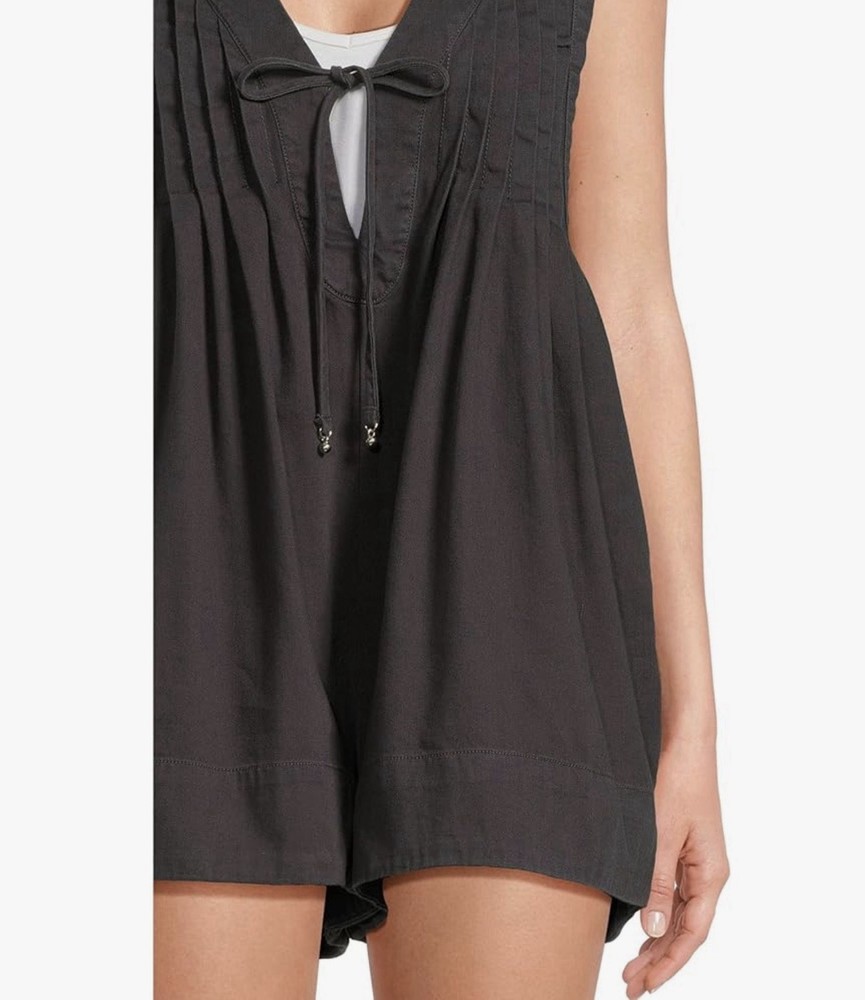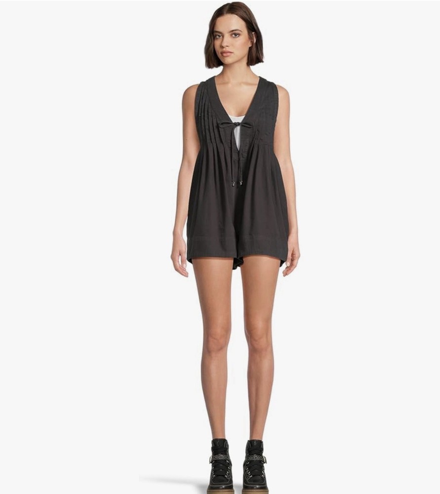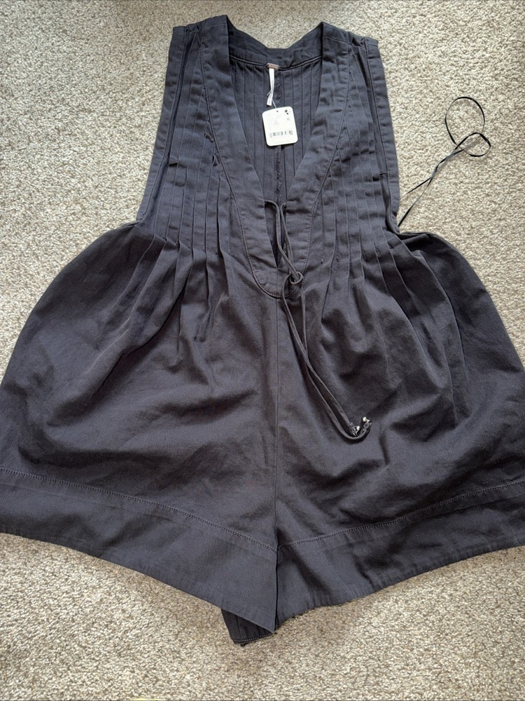 The $128 Free People Size XS Webster Denim Romper in black is a stylish and versatile one-piece outfit designed for women. Made from denim fabric, this sleeveless romper features a classic button-up front and a comfortable regular size fit. The black color adds a chic touch to the overall look, making it perfect for various occasions. With the Free People brand known for its quality and trendy designs, this romper is sure to be a great addition to any woman's wardrobe.