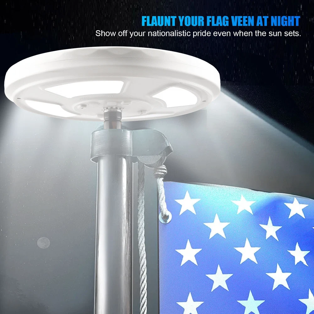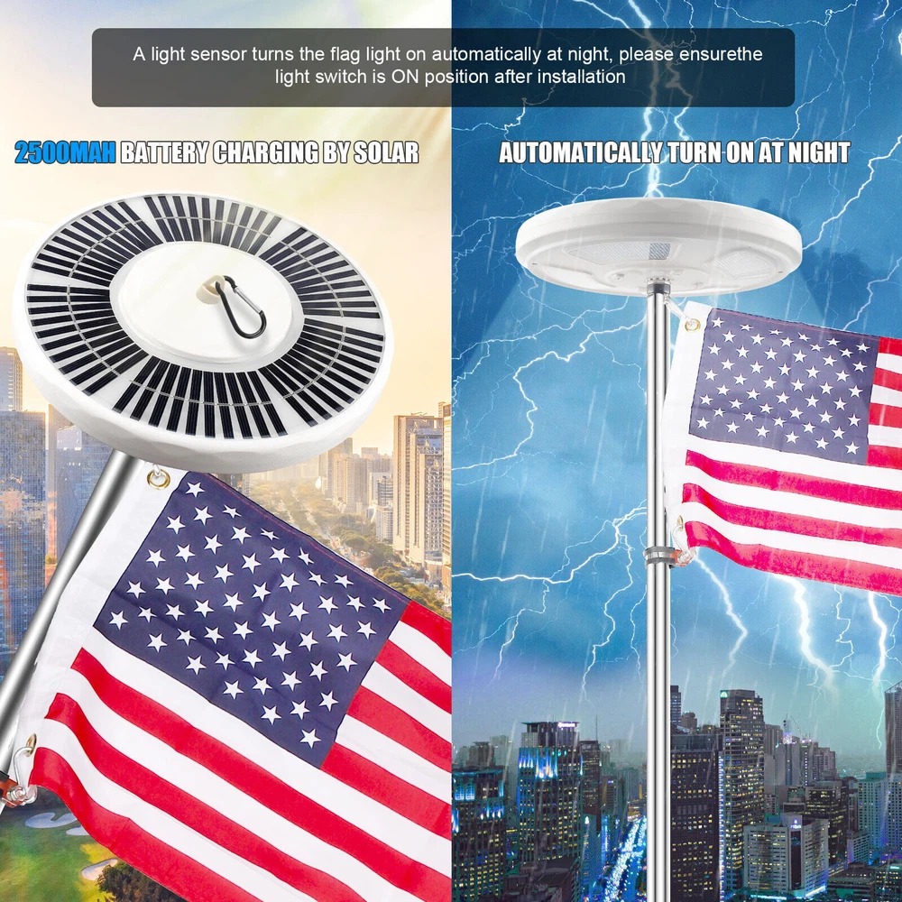 Product Description Item Description Features: ✦128 LED lights up the latest flagpole lights. The solar flagpole lights are made of 128 upgraded LED lamp beads. The brightness is 640 lumens, which is 3.6 times brighter than ordinary 48 LEDS flag lights. With solar flag lights, your national flag will become the brightest beacon in the night sky. ✦Upgrade solar panels to achieve faster solar conversion. 128LED flagpole lights adopt the latest dispersion technology, increasing the number of solar panels from 12 to 60. Therefore, this 2500 mAh solar flagpole light can absorb solar energy faster and can work continuously for up to 12 hours at night. ✦Auto on/off and 2 brightness lighting modes, equipped with cutting-edge sensors, can detect the correct time to automatically activate the lighting when it is dark. Please make sure that the flagpole light switch is in the "on" state before installation. Press the switch button once, face down or cover the solar panel, if it is lit, it is “ON”; if it is not lit, you need to press the button again to set it to “ON”. In addition, the flag light has two brightness lighting modes. The high-brightness flag will be more dazzling, and the low-brightness can work longer. ✦Suitable for most flagpoles of 15-25 feet, easy and quick to install, 128 LEDS solar flag light can be used with flagpoles buried in the ground of 15-25 feet, suitable for flagpoles in 0.6 inch holes, easy to install without any special tools. In addition, this lamp can be hung anywhere, used for camping, roadside, courtyard, night market. Specifications: - Color: White - Material: ABS - Light-emitting chip: 128 LED - Dimensions: 9 x 9 x 1.2in - Solar panels: 5V/560mAh - Power supply: 5V/560mAh - Battery: 18650 lithium battery - Battery capacity:2500mAH - Battery QTY:1 Battery - Charging time:8-10 hours - Working hours: 6-12 hours - Waterproof: IP67 - LED: 128LED (2835 patch) Package Included: 1 x Solar Flagpole Light 2* Hanger Accessories Tips: 1. Please use a 15-20 foot flagpole with a 0.5"-0.6" pole on the top. 2. Please tear off the protective film on the solar panel for the first time. 3. Make sure that the light switch is in the ON position before installation. 4. If you want to get the best performance of 128 LED solar lights, please ensure 8 hours or more sunlight, about 10 hours of lighting, 5. Please note that this list only applies to solar flag lights. Does not include balls, bolts, decorations, flags or flagpoles. The props in the product pictures are only for demonstration and application purposes. 6. The maximum brightness of the flagpole is 640 lumens. If you want your flagpole to light up longer at night, please select "I" level. If you want to get 640 lumens of brightness at night, please choose the "II" level. 2X Shaft Adapter Sleeve 335 For Taylormade Qi10,Stealth,SIM,M6,M5,M4 Driver&Wood 9.99 USD Free shipping 10 AWG Solar Panel Extension Cable PV Wire Solar Connectors Pair Black Red 6mm² 16.59 USD Free shipping Bidet Fresh Water Spray Kit with Dual Nozzle Non Electric Toilet Seat Attachment 20.19 USD Free shipping Trucker Bluetooth 5.2 Wireless Headset With Noise Cancelling Mic For Phones PC 25.99 USD 0.59 USD Electric Vacuum Magnetic Suction Car Phone Mount 360° Rotation Phone Holder 21.99 USD Free shipping 6 pcs Toothbrush Replacement heads COMPATIBLE WITH & FOR SONIC E-SERIES 14.99 USD 0.59 USD
