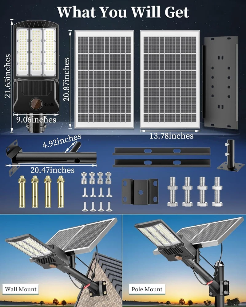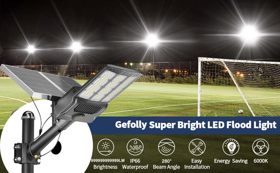 Gefolly SL-12800W solar security light is built-in 1844pcs 5054 ultra bright LED lamp beads and 140000mAh battery (lifetime up to 95,000 hours). Provides a 6500K, IP67 waterproof rating, and works normally even in bad weather all year round. Solar powered, no electricity bill, auto turns on at dusk and charging during the day, Continuous lighting up to 30 hours (when fully charged). Best for commercial and home lighting. Note: The remote controls that come with the light are available in white and black. The white and black remote controls are shipped randomly. 12800W Commercial Solar Street Lights Outdoor Dusk to Dawn For basketball court 【Solar Powered & 0 Electricity Bill】 — Gefolly SL-12800W solar security light is built-in 1844pcs 5054 ultra bright LED lamp beads and 140000mAh battery (lifetime up to 95,000 hours). Provides a 6500K, IP67 waterproof rating, and works normally even in bad weather all year round. Solar powered, no electricity bill, auto turns on at dusk and charging during the day, Continuous lighting up to 30 hours (when fully charged). Best for commercial and home lighting. Note: The remote controls that come with the light are available in white and black. The white and black remote controls are shipped randomly. 【140AH Large Capacity Battery & Power Capacity Indicator Light】 The solar street light has a built-in 140000mAh lithium battery, which is more stable and durable. Equipped with 2 solar panels , compared with ordinary solar lights, our lights can absorb twice the solar energy during the day, convert it into double electricity and store it, and output it in the form of light energy at night. With 4 power capacity indicator light, more intuitively understand the remaining power of the lamp during use. 【Super Bright 5054 Type Led Beads】 Designed with 1844pcs first-class super bright 5054 type LED beads, 1 of our Gefolly beads is as bright as 20 ordinary beads. The lighting area is up to 9600 square feet, reducing lighting blind spots. Escort for the safety of you and your family. The first choice for night lighting. 【Intelligent Control & Easy Installation】 —The solar flood security light comes with a remote control, convenient for long-distance use. 2 lighting modes (constant light mode, timer setting mode) and 10%-100% brightness adjustable. 3 timing groups: 3H/5H/8H(No radar induction) . Comes with a set of wall and pole mount accessories that require no wiring for easy outdoor installation. Great for streets and roads, parking lots, basketball courts, garages, gardens, streets, courtyards, etc. 【 3-Year Policy】 — We promise a 120-day money-back and a 3-years product maintain. We're devoted to providing a satisfying purchase experience for our customers. For any questions about the solar security flood lights, pleas contact our customer service team. Brand Gefolly Color Black Material Aluminum Style Industrial Light fixture form Wall Room Type / Product Dimensions 21.65"L x 13.78"W x 2.5"H Specific Uses For Product Garden Indoor/Outdoor Usage Outdoor Power Source Solar Powered Installation Type Surface Mount Special Feature Waterproof Control Method Remote Light Source Type LED Finish Type Powder Coated Shade Material Plastic Number of Light Sources 1844LED Light Color cool white Shape Rectangular Included Components 140000mAh battery, 2 solar panels, remote control, wall and pole mount accessories, set of accessories Warranty Type Extended Lighting Method LED Number of Items 1 Wattage 6.5E+3 Bulb Base E26 Controller Type Remote Control Switch Type Remote Control Unit Count 1.0 Count Water Resistance Level Waterproof Brightness 99999999999900 lumen Efficiency High Mounting Type Wall Mount Shade Color Black Fixture Type Non Removable Assembly Required Yes Manufacturer Gefolly Recommended Uses For Product outdoor lighting for commercial and residential areas, parking lots, sports facilities, garages, gardens, and pathways Model Name Solar Light Part Number SL-12800 Item Weight 21 pounds Item model number SL-12800W Batteries 8 Lithium Polymer batteries required. (included) Finish types Powder Coated Special Features Waterproof Package content 1 x Solar Street Light (Mounting Pole is INCLUDED) 1 x Remote Control 1×Nut Kit 1 x Manual 1×Packing Box 2xMonocrystalline silicon solar panel About us Delivery details Returns Payment Contact us About us Why Choose Gefolly Solar Security Light? Gefolly is a brand devoted to all kinds of lamp produce and design. We have been deeply engaged in lighting products for many years, and we have our own design and development team and production and manufacturing team. We promise to provide excellent product quality and efficient after-sales service and look forward to your choice. Delivery details USWarehouse Fast&Convenient Delivery Shipping available time: Mon. - Fri. exclude holidays The orders will be handled in 24 hours after payment got. Returns 1.We strive to ensure 100% satisfaction for each and every one of our customers. we offer a 30-day 100% money-back guarantee on all eBay orders. 2. All of our products are one hundred percent brand new. 3.Please inspect your order upon arrival for missing/incorrect items. Please messages us to notify us of any missing/incorrect item. 4. Item may be return within the return period. It must be returned in its original and unused condition. Goods must also be in its original box and packing. Do not dispose of the box or any packaging materials until you are satisfied with the product. Payment 1. Paypal Accept.You can use any payment method supported by eBay. 2. Payment should be sent within 4 (FOUR) days auction closing. Or unpaid dispute will be filed for closing auction. Contact us ★★★ USA Warehouse! Fast shipping! 1.Office Time: 9:30 - 18:30, Monday - Friday(UTC+8) 2.Please contact us with eBay Message. 3.We will respond you within 24 hours on business day. ★★★Your satisfaction is our pursuit. We Strive For Positive Feedback & 5stars ☆☆☆