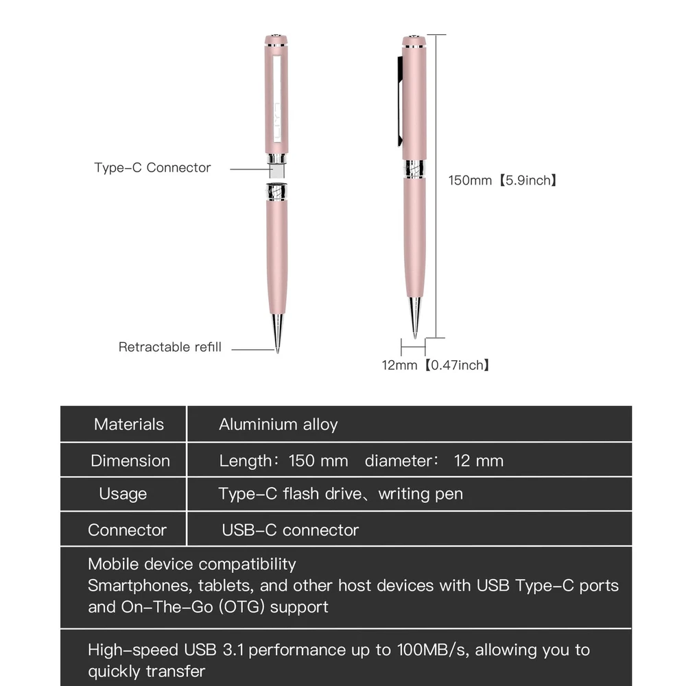 A pen drive is a portable storage device that resembles a regular pen in appearance, but contains a flash memory chip inside that can be used to store various types of data. The design of pen drives is usually simple and sleek, which meets people's requirements for fashion and beauty. Pen drives are also compact in size, making them convenient to carry and use. They can be inserted into a computer's USB port to transfer data through the USB interface. With high-speed USB 3.1 interface, pen drives have fast transmission speeds, with read and write speeds of up to 150MB/s, making them ideal for users who need to transfer large amounts of data. The storage capacity of pen drives is also relatively large, with a maximum capacity of up to 256GB. This means that you can store a large amount of files, images, audio or video content on them. In addition, pen drives can be reused and have no mechanical parts, so they have a longer lifespan. Pen drives can be used not only for data storage but also as bootable drives. If you need to reinstall the operating system or perform system maintenance, you can copy the installation files to the pen drive and set the computer to boot from the drive. In conclusion, pen drives are very practical portable storage devices that have advantages such as large capacity, fast read and write speeds, and easy operation. If you need to frequently transfer data or backup important files, pen drives are definitely a recommended choice. USB-C Interface: The USB flash drive adopts USB Type-C technology, which is very convenient to insert. The Type-C interface does not require flipping or fumbling, just plug it in directly. The interface also has reversibility, so there is no need to worry about connection issues. The USB-C interface of this U disk is also compatible with most new laptops and smartphones, Supports Android system smartphones, as well as iOS devices including iPhone 15, iPad Pro, and iPad Air models. allowing users to easily back up and store data anytime High-speed Transmission: This flash drive uses a USB 3.1. This allows users to quickly back up and transfer large amounts of data without waiting too long. Even large files, HD videos or high-resolution images can be easily transferred with this U disk. Large Capacity Storage: Our U disk offers 4 storage capacities of 32GB, 64GB, 128GB and 256GB, which are enough to meet the storage needs of different users. It makes it an ideal choice for storing large files, photos, videos, audios, and other data types. Users can store the required data at any time and access it anytime. Multiple Device Compatibility: In addition to supporting devices with USB-C interfaces, this U disk is also compatible with standard USB-A and Micro USB interfaces. This means that users can connect this U disk to more devices, not limited to devices that support USB-C interfaces. No matter which device you use, you can use this U disk for data transfer and storage. Practical Design: The portable memory stick adopts a pen-style design, making it a highly practical everyday or business tool. It not only meets your writing needs but also serves for data storage and transfer. Its minimalist design makes it visually appealing, with smooth writing and replaceable ink. Whether you're at school, in the office, or on the go, this USB flash drive is a very useful tool.