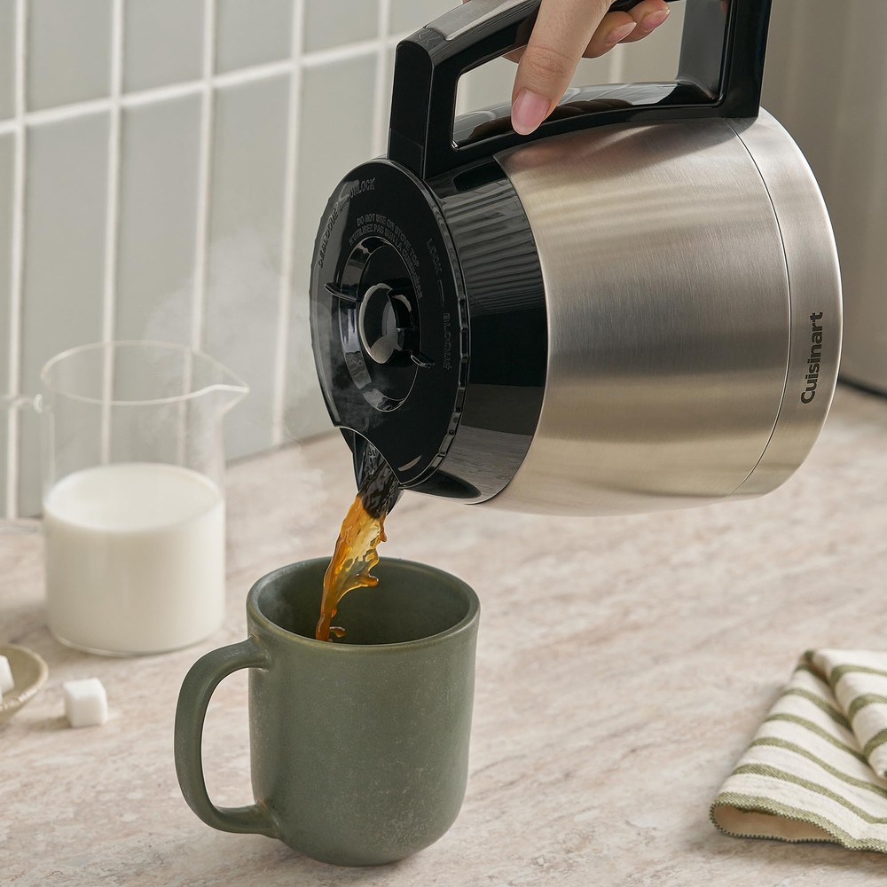 Color Silver Product Dimensions 7.75"D x 9"W x 14.25"H Special Feature Programmable Coffee Maker Type Drip Coffee Machine Capacity 12 Cups Material Stainless Steel Item Weight 8.5 Pounds Wattage 1100 watts About this item PROGRAMMABLE COFFEE MACHINE: Fully automatic Cuisinart 12-Cup* Coffee Maker with 24-hour programmability, self-clean, 1-4 cup setting, optional ready alert tone, and Brew Pause convenience. PIPING HOT COFFEE: Hotter coffee with expert coffeemaking technology to ensure hotter coffee temperature without sacrificing flavor or quality. BREW STRENGTH CONTROL: This Cuisinart coffee machine tailors the strength of your brew with Brew Strength Control for regular or bold settings. Savor the rich flavors with the included gold-tone and charcoal water filters. 12-CUP* CAPACITY: *Cup equals approx. 5 oz. (varies by brewing technique). CONVENIENT DESIGN: This Cuisinart coffee maker features a backlit LCD that’s easy to read, a ready tone that can be turned on or off, and an indicator light that signals when it’s time to decalcify.