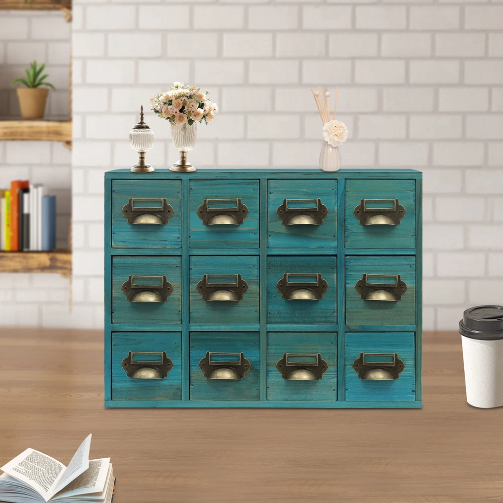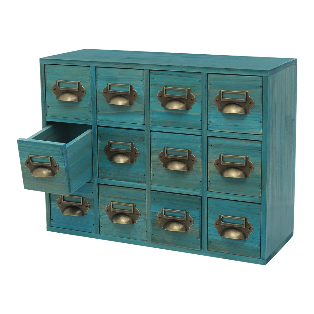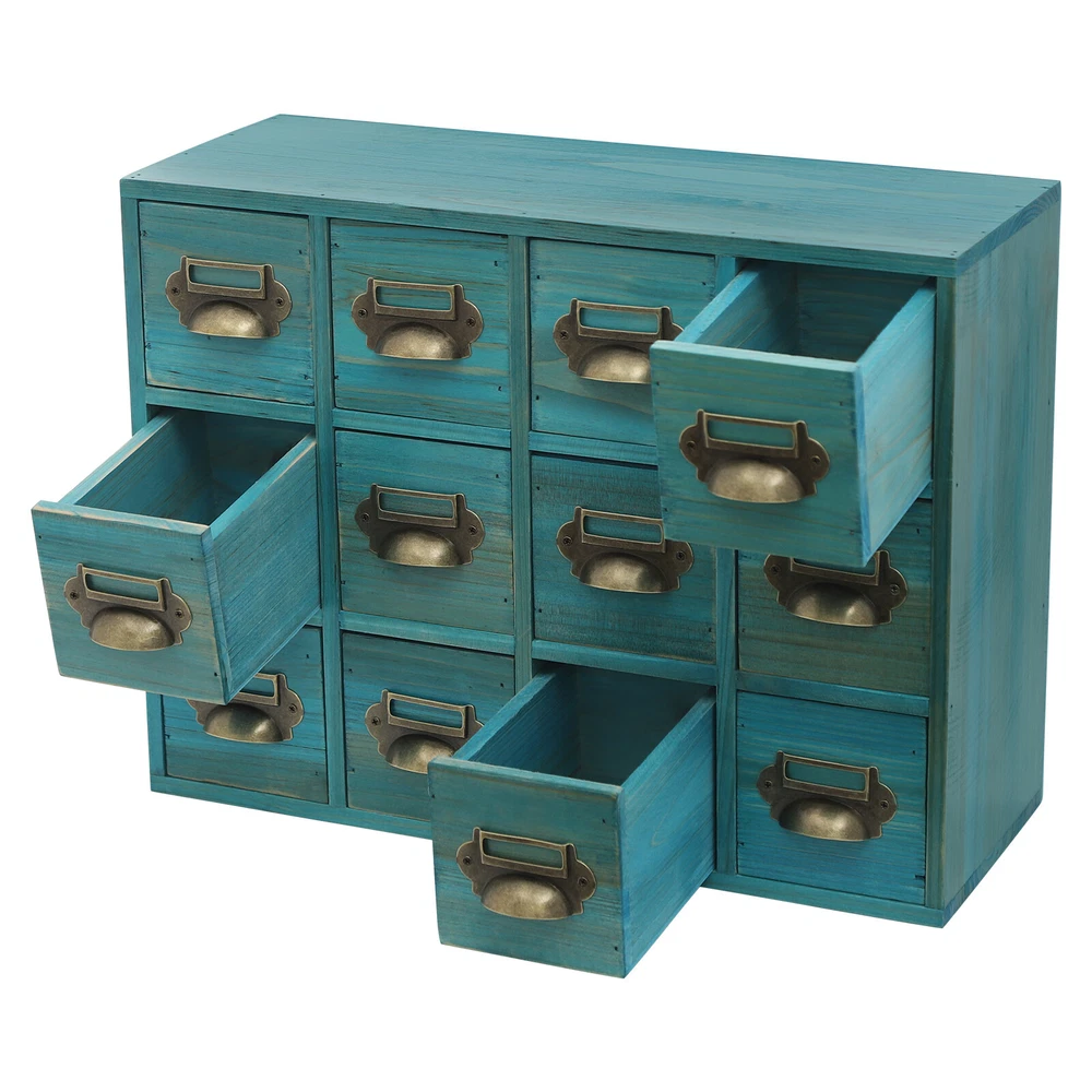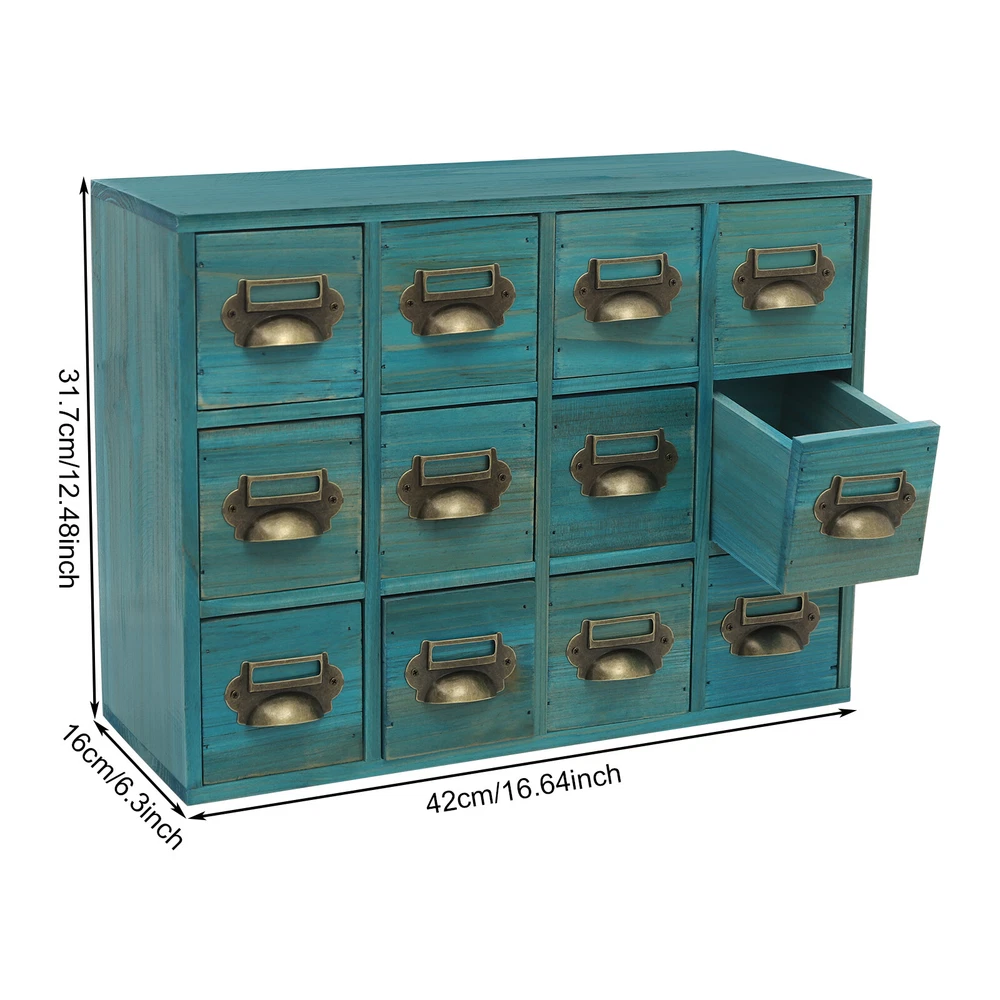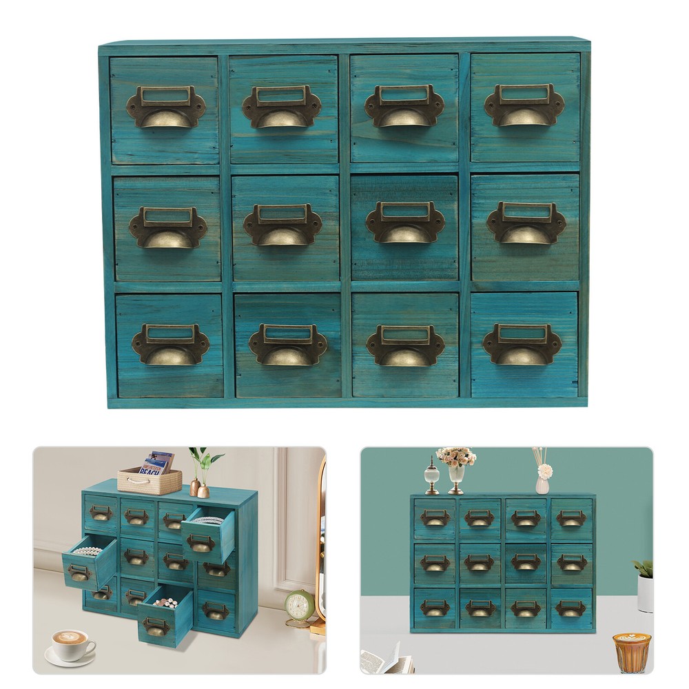 Description A great storage cabinet can make your living experience more convenient and comfortable. Its premium materials ensure durability and strong load-bearing capacity. The 12 storage compartments provide ample space for storing small items, keeping your desktop tidy. Its elegant and vintage appearance also makes it a great decorative piece! Key Features Build to Last: This product is made of premium solid wood, plywood , and zinc alloy, and the surface is treated with spray painting technology, which is wear-resistant, scratch-resistant, and not easy to deform, ensuring a long service life. Storage Assistant: The 3-tier design with 12 storage compartments provides ample storage space for categorizing Chinese herbs, stationery, and other small office supplies, making your desktop more organized and improving work efficiency. Stable Structure: The thick materials and a sturdy frame structure ensure that it can remain stable in long-term use and has a load-bearing capacity(22.05 lbs), so you can store items with confidence. Space-saving: It adopts a narrow body design(6.3 inches) and has a vertical structure, which will not occupy much tabletop space. Convenient to Clean: Its surface is smooth and its structure is simple, so you can easily wipe off the dust with a damp rag (not included). Nice Gift: This practical and beautiful product is a great holiday or housewarming gift for family, friends, and lovers so that they can enjoy a more convenient life. Nice Appearance: The elegant brown, wooden textures, and metal handles enhance its rustic and vintage charm, making it not only a convenient storage cabinet but also a unique decorative piece. Ready to Use: This product does not require additional assembly and can be used immediately upon receipt, making it labor-saving and convenient. Buy with Confidence: We stand behind all our guests and look forward to assisting you with your purchase. It is our pleasure to answer your confusion and questions. The end of the story between us is not "we sell and you buy". Details Round Corners: They add to the beauty of the product while ensuring safer use. Comfortable Handles: They make it easier for you to open cabinet drawers. Application It is suitable for households, offices, small workshops, traditional Chinese medicine stores, etc. It is used to organize various items such as spices, medicines, jewelry, handicrafts, cosmetics, essential oils, small office supplies, tea bags, lipsticks, and more. Specification Color: Blue Shape: Rectangular Material: Solid Wood, Plywood, Zinc Alloy Process: Spray Painting Assembly Required: No Mounting Type: Tabletop Number of Compartments: 12 Load-bearing Capacity: 10kg/22.05 lbs Product Size: 42*16*31.7cm/16.54*6.3*12.48in Package Size: 46*36*20cm/18.11*14.17*7.87in Gross Weight: 4.8kg/10.58 lbs Net Weight: 4.56kg/10.05 lbs Package Included 1* 12 Drawer Storage Cabinet Notes Please check the product size before ordering. Please allow the slight color difference caused by the shooting light and the 1-3cm error due to manual measurement, and make sure you do not mind before ordering.