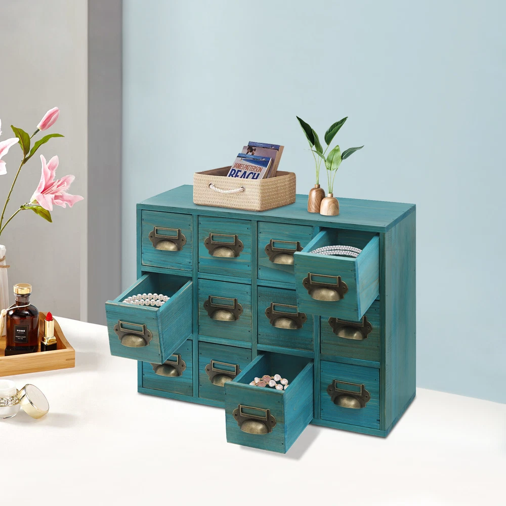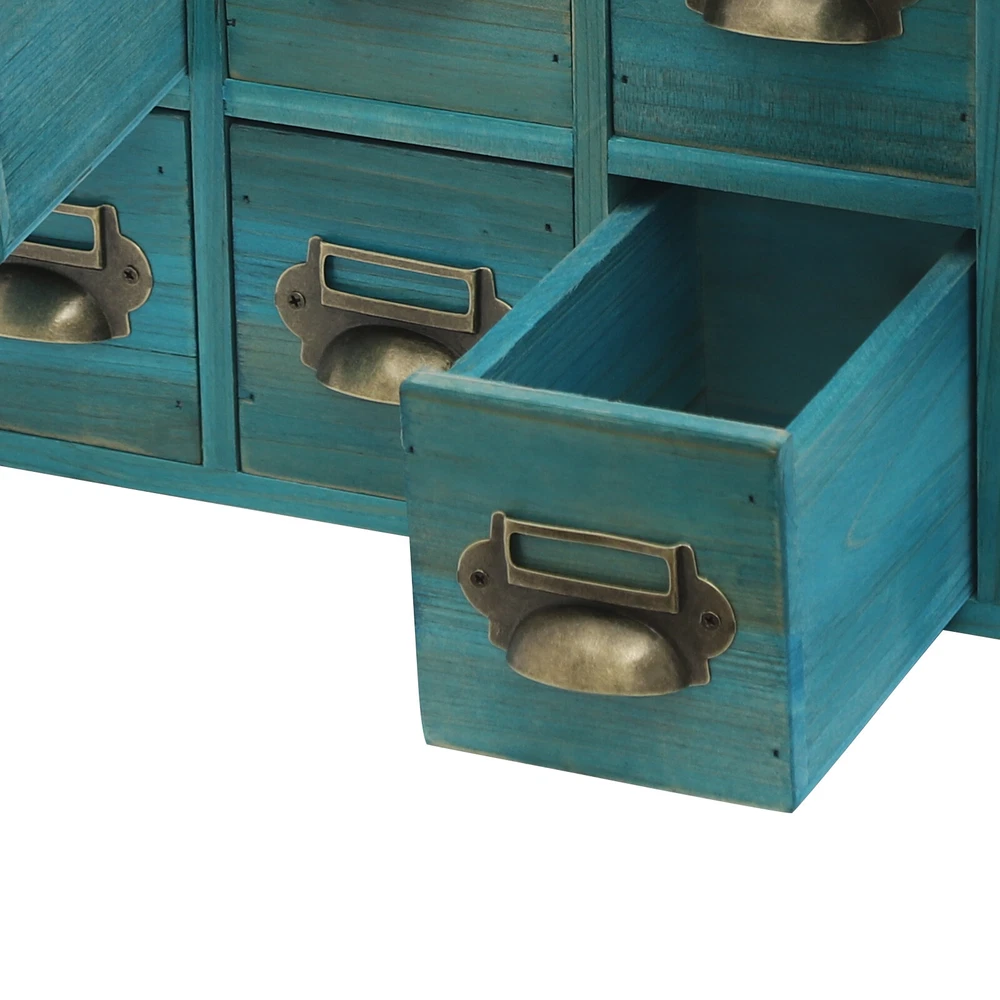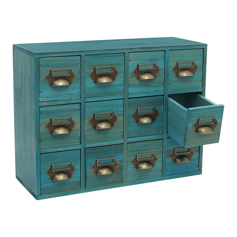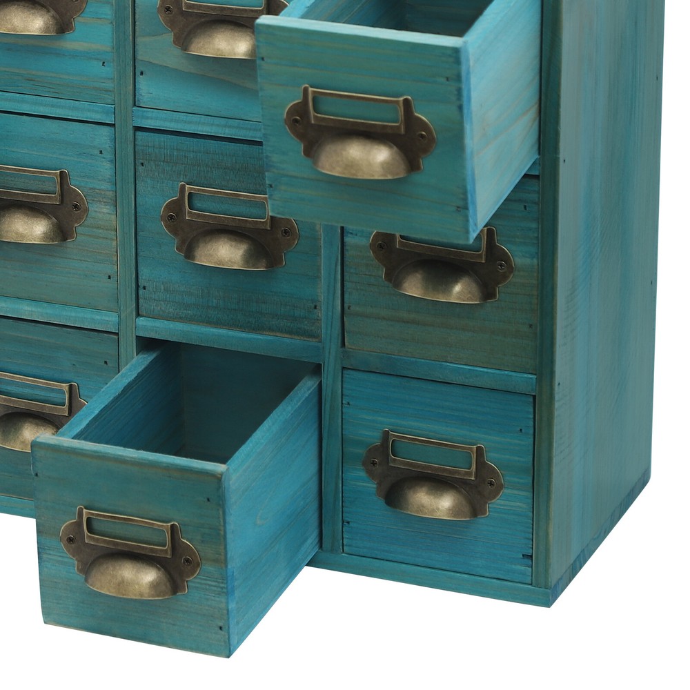Description A great storage cabinet can make your living experience more convenient and comfortable. Its premium materials ensure durability and strong load-bearing capacity. The 12 storage compartments provide ample space for storing small items, keeping your desktop tidy. Its elegant and vintage appearance also makes it a great decorative piece! Key Features Build to Last: This product is made of premium solid wood, plywood , and zinc alloy, and the surface is treated with spray painting technology, which is wear-resistant, scratch-resistant, and not easy to deform, ensuring a long service life. Storage Assistant: The 3-tier design with 12 storage compartments provides ample storage space for categorizing Chinese herbs, stationery, and other small office supplies, making your desktop more organized and improving work efficiency. Stable Structure: The thick materials and a sturdy frame structure ensure that it can remain stable in long-term use and has a load-bearing capacity(22.05 lbs), so you can store items with confidence. Space-saving: It adopts a narrow body design(6.3 inches) and has a vertical structure, which will not occupy much tabletop space. Convenient to Clean: Its surface is smooth and its structure is simple, so you can easily wipe off the dust with a damp rag (not included). Nice Gift: This practical and beautiful product is a great holiday or housewarming gift for family, friends, and lovers so that they can enjoy a more convenient life. Nice Appearance: The elegant brown, wooden textures, and metal handles enhance its rustic and vintage charm, making it not only a convenient storage cabinet but also a unique decorative piece. Ready to Use: This product does not require additional assembly and can be used immediately upon receipt, making it labor-saving and convenient. Buy with Confidence: We stand behind all our guests and look forward to assisting you with your purchase. It is our pleasure to answer your confusion and questions. The end of the story between us is not "we sell and you buy". Details Round Corners: They add to the beauty of the product while ensuring safer use. Comfortable Handles: They make it easier for you to open cabinet drawers. Application It is suitable for households, offices, small workshops, traditional Chinese medicine stores, etc. It is used to organize various items such as spices, medicines, jewelry, handicrafts, cosmetics, essential oils, small office supplies, tea bags, lipsticks, and more. Specification Color: Blue Shape: Rectangular Material: Solid Wood, Plywood, Zinc Alloy Process: Spray Painting Assembly Required: No Mounting Type: Tabletop Number of Compartments: 12 Load-bearing Capacity: 10kg/22.05 lbs Product Size: 42*16*31.7cm/16.54*6.3*12.48in Package Size: 46*36*20cm/18.11*14.17*7.87in Gross Weight: 4.8kg/10.58 lbs Net Weight: 4.56kg/10.05 lbs Package Included 1* 12 Drawer Storage Cabinet Notes Please check the product size before ordering. Please allow the slight color difference caused by the shooting light and the 1-3cm error due to manual measurement, and make sure you do not mind before ordering.