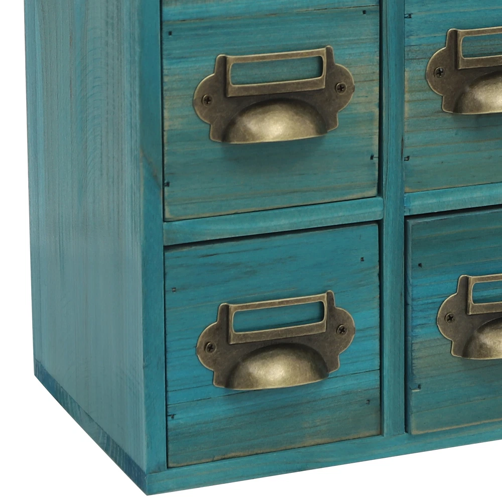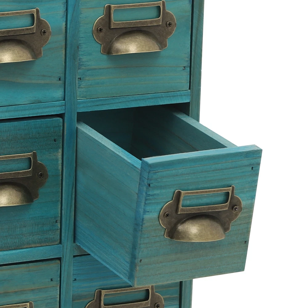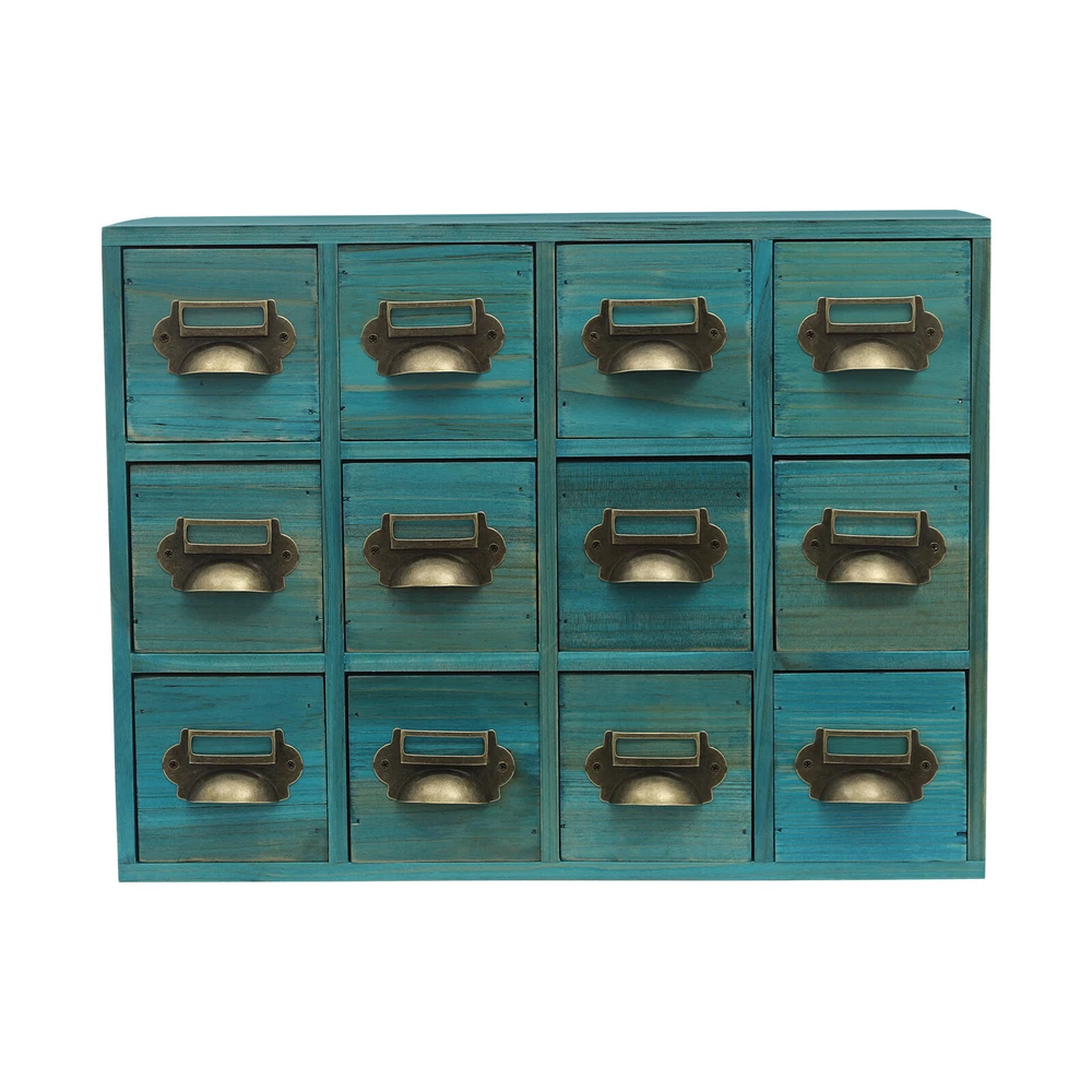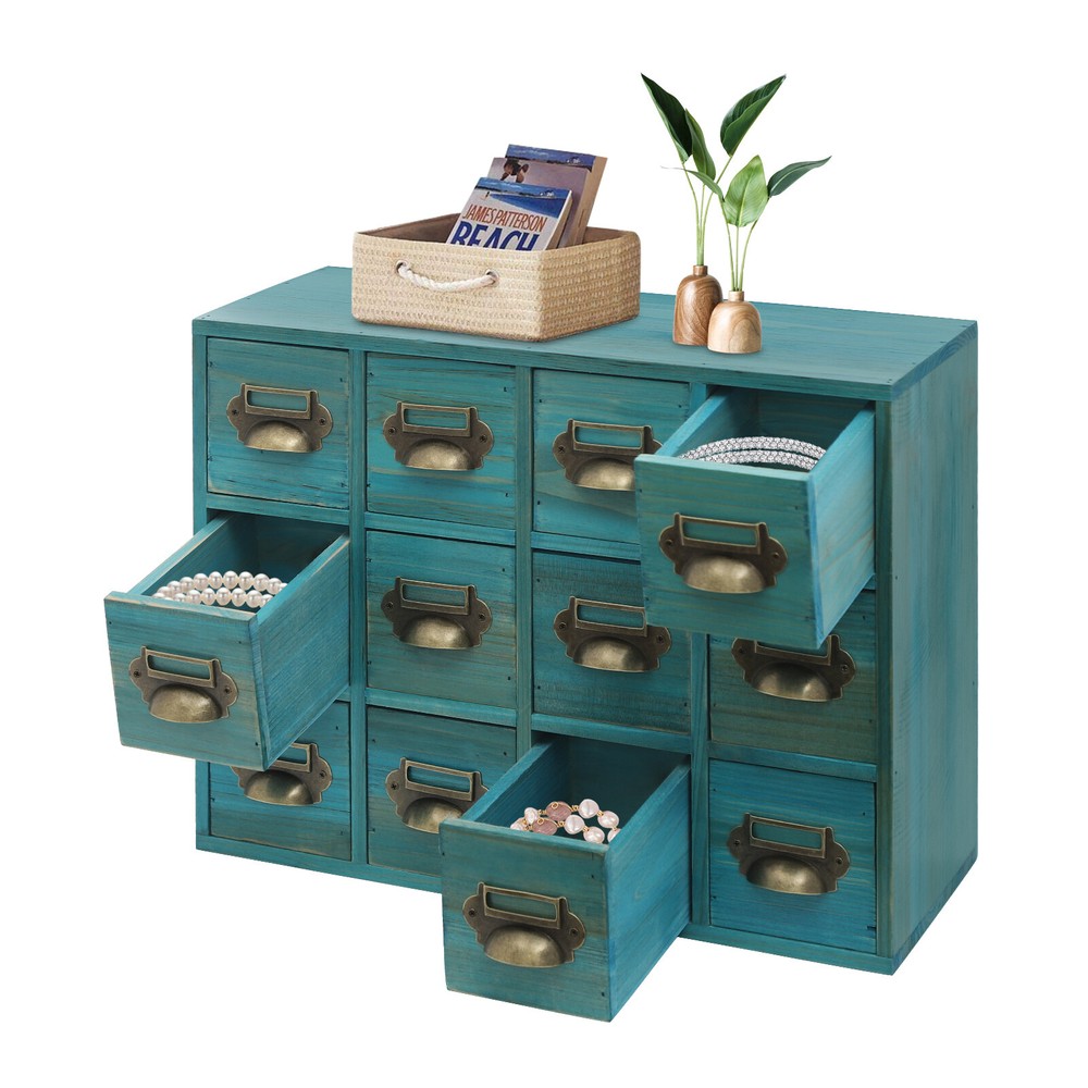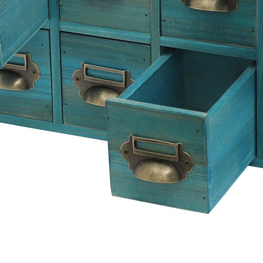 Description A great storage cabinet can make your living experience more convenient and comfortable. Its premium materials ensure durability and strong load-bearing capacity. The 12 storage compartments provide ample space for storing small items, keeping your desktop tidy. Its elegant and vintage appearance also makes it a great decorative piece! Key Features Build to Last: This product is made of premium solid wood, plywood , and zinc alloy, and the surface is treated with spray painting technology, which is wear-resistant, scratch-resistant, and not easy to deform, ensuring a long service life. Storage Assistant: The 3-tier design with 12 storage compartments provides ample storage space for categorizing Chinese herbs, stationery, and other small office supplies, making your desktop more organized and improving work efficiency. Stable Structure: The thick materials and a sturdy frame structure ensure that it can remain stable in long-term use and has a load-bearing capacity(22.05 lbs), so you can store items with confidence. Space-saving: It adopts a narrow body design(6.3 inches) and has a vertical structure, which will not occupy much tabletop space. Convenient to Clean: Its surface is smooth and its structure is simple, so you can easily wipe off the dust with a damp rag (not included). Nice Gift: This practical and beautiful product is a great holiday or housewarming gift for family, friends, and lovers so that they can enjoy a more convenient life. Nice Appearance: The elegant brown, wooden textures, and metal handles enhance its rustic and vintage charm, making it not only a convenient storage cabinet but also a unique decorative piece. Ready to Use: This product does not require additional assembly and can be used immediately upon receipt, making it labor-saving and convenient. Buy with Confidence: We stand behind all our guests and look forward to assisting you with your purchase. It is our pleasure to answer your confusion and questions. The end of the story between us is not "we sell and you buy". Details Round Corners: They add to the beauty of the product while ensuring safer use. Comfortable Handles: They make it easier for you to open cabinet drawers. Application It is suitable for households, offices, small workshops, traditional Chinese medicine stores, etc. It is used to organize various items such as spices, medicines, jewelry, handicrafts, cosmetics, essential oils, small office supplies, tea bags, lipsticks, and more. Specification Color: Blue Shape: Rectangular Material: Solid Wood, Plywood, Zinc Alloy Process: Spray Painting Assembly Required: No Mounting Type: Tabletop Number of Compartments: 12 Load-bearing Capacity: 10kg/22.05 lbs Product Size: 42*16*31.7cm/16.54*6.3*12.48in Package Size: 46*36*20cm/18.11*14.17*7.87in Gross Weight: 4.8kg/10.58 lbs Net Weight: 4.56kg/10.05 lbs Package Included 1* 12 Drawer Storage Cabinet Notes Please check the product size before ordering. Please allow the slight color difference caused by the shooting light and the 1-3cm error due to manual measurement, and make sure you do not mind before ordering.