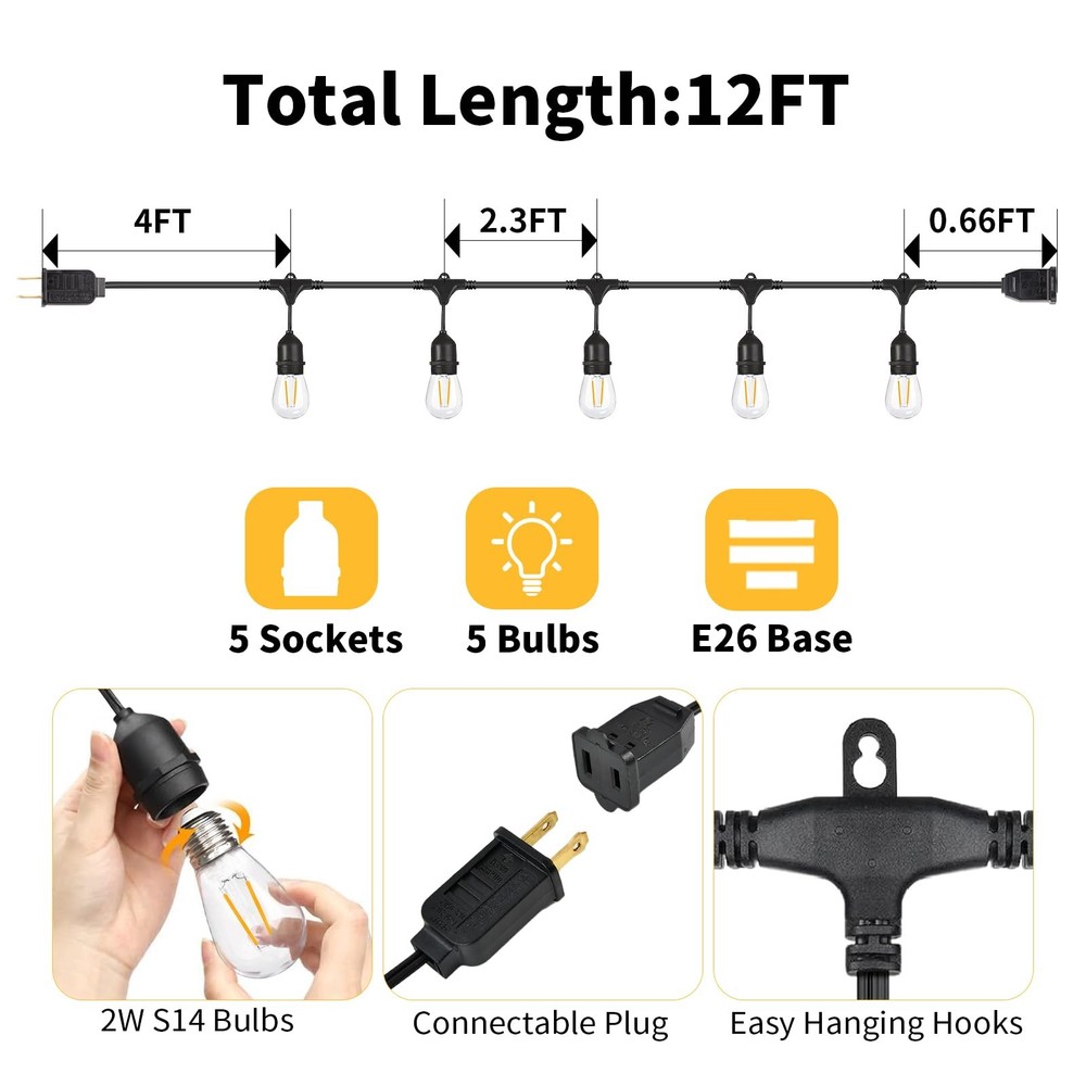 S14 LED Outdoor String Lights Application: These LED string lights are suitable for indoor, outdoor, patio, pergola, gazebo, canopy, porch, garden, courtyard, bistro, party even indoor like cafe and bedroom. Perfect for adding warm ambience for festival, wedding, birthday, Christmas. Specification: - Wattage: 1w per bulb - Input Voltage: AC 110-130V - Strand Length: 12FT - Plug Type: US 2-Pin Plug - Light Source Type: LED - Color Temperature: 2700K warm white - Number of bulbs: 5 x S14 LED Edison Bulbs - Lumen:80LM per Bulb, 400LM per String - Lead Length: (Plug to 1st bulb) 7.2FT - Space between sockets: 2.2FT - Maximum strings per run: 10 Strands 【Waterproof & Durable】outdoor string lights are made of high-quality wire that can withstand the wear and tear of year-round outdoor use. The insulation material also protects against various weather conditions. LED Edison bulbs consume only 1 watt, saving 90% on electricity costs compared to incandescent bulbs. 【Shatterproof Design】12FT string lights with 5 E26 hanging sockets, 110V-130V, 1W shatterproof LED bulbs. The plastic bulbs ensure your family safe while hanging the patio string lights, without worrying about glass shards. 【Easy to Install & Connectable】S14 outdoor string lights 12ft, 7.2Ft lead with male plug, 2.2Ft spacing between bulbs, 0.5Ft tail with female connector. End to end connectable up to 10 Strands easily. Simple Installation and easy-to-use socket loop design allows for hangup and installation anywhere that’s desired–hang lights in outside rafters for backyard, parties and weddings, or indoors for urban inspiration. 【Perfect Ambiance】The outdoor light string is designed to create the perfect lighting style that adds exquisite and visually pleasing ambiance to any indoor or outdoor space at any time. It can turn the exterior of your house or yard into a club or romantic cafe. 【Widely used】The vintage Edison bulb string light emits a warm white light of 2700K, creating a vintage effect and romantic ambiance. It is suitable for backyard, deck, bistro, deck, porch, cafe, pergola, gazebo, patio, garden, terrace, umbrellas, market, etc. Widely used in wedding, party, Christmas, and many other occasions or events.