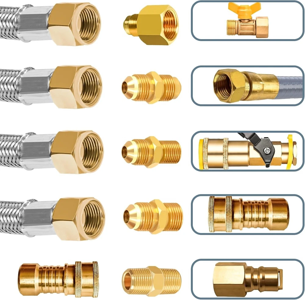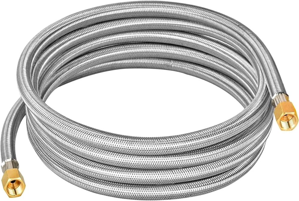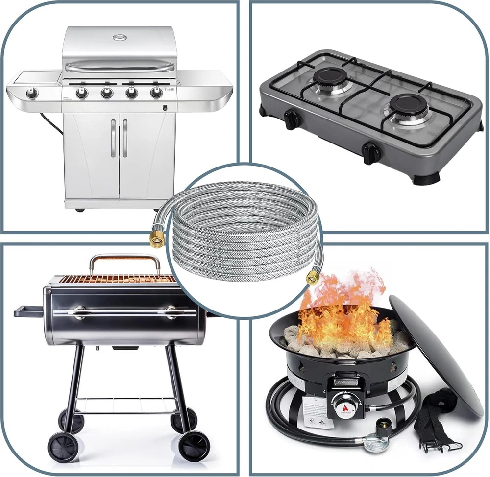 【Premium Material】12 Feet Stainless steel braided propane regulator hose are made of High-strength stainless steel braided. 3/8" female flare fittings on both ends are made of 100% Solid Brass.Durable solid brass provide secured connections between appliance and tank. This Propane Hose with CSA Certification, ensures air tightness and stability. 【Multipurpose Assembly Kit】12FT stainless steel braided propane hose with 5 x Different Conversion Adapter Fittings(3/8" NPT Male x 3/8" NPT Male, 3/8" Flare Male x 3/8" Flare Male, 3/8" NPT Male x 3/8" Flare Male, 1/2" Female NPT x 3/8" Flare Male, 1/4" NPT Male x 3/8" Flare Male). 【Easy to Use】12FT braided propane extension hose can meet your needs and can be used flexibly between propane tank and gas appliance. It can also be used to extend the propane storage tank pipeline on low-pressure equipment. 3/8 "propane hose adapter kit +Buckle Velcro makes the product easier to carry, store and use safely, saving your cost. 【Wide Application】12FT stainless steel braided propane hose has 3/8" internal thread ends on both sides, and is connected with equipment equipped with 3/8" external thread flaring fittings to help you realize multi-equipment connection. It can be used in gas grills, propane burners, fire pits, frying pans, stoves, propane generators, propane smokers, portable generators, etc. 【Quality Assurance】The package includes 1* 12FT 350 PSI High Pressure Propane extension Hose + 5* Brass Adapters + 1* Buckle Velcro + 1* Wrench + 1* Roll Sealing Tape .If you have any questions about this product, please feel free to contact us. 12FT stainless steel hose Length: 12 Feet,durable stainless steel braided propane hose for extending the propane tank line on your LP appliance.Use it to keep your gas tank farther away from grills no effort Hose is with both 3/8" female flare fitting on both sides, connect an appliance equipped with 3/8" male flare fitting. Works for RV, gas grill, propane heater, fire pit table, stove, propane smoker, turkey cooker and more. It's always used to connect an auxiliary tank to the travel trailer or a motor home. Solid brass to provide secure and sealed connection between applications and tank.