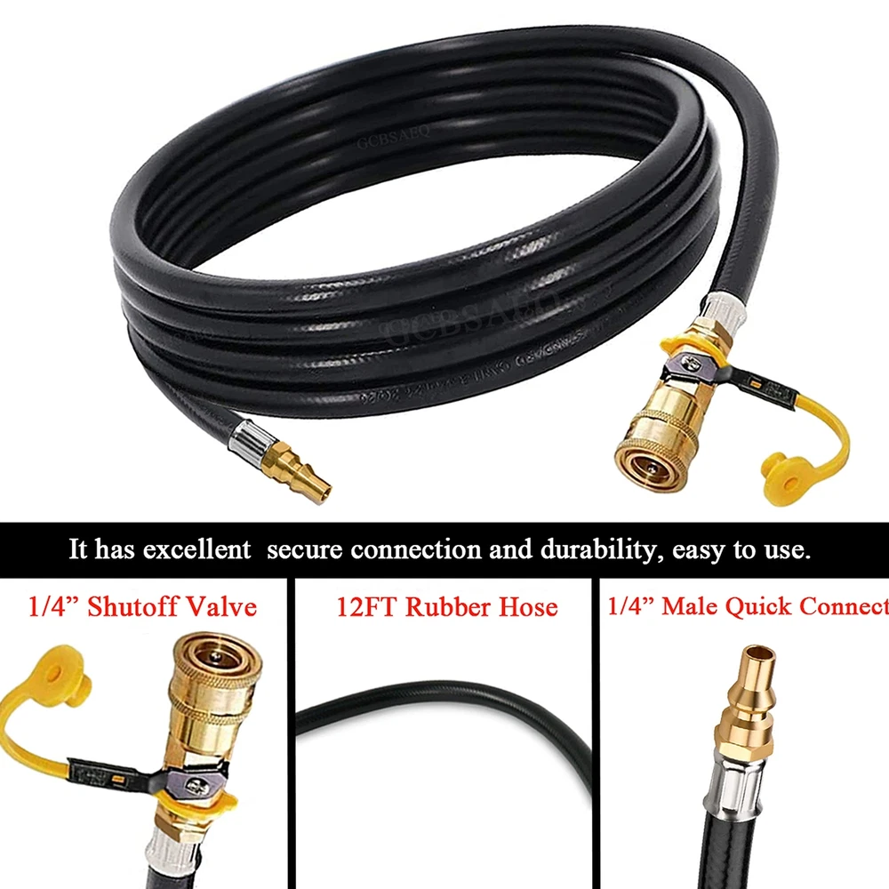 ★【Package Content】The low pressure propane quick-connect hose has heavy-duty solid brass and 12 feet rubber propane hose extension with 1/4” safety shutoff valve & male full flow plug for rvs. ★【How to Use】One side of the rv propane hose is connected to the rv barbecue grill with quick connect propane connector, and the other side is connected to the low pressure system on the rv trailer or camper. ★【Scope of application】The propane hose fit for most other low-pressure grills with a quick connect propane connection, it used with rv's on-board propane supply system . ★【Significance of use】 Now you can connect the hose to the low pressure system on the rv trailer or camper, the hose can help you extend your grill from the rv. The on-off quick connect valve on hose to hook up the eblow adapter on your grill. ★【 Quality Assurance】 Our propane hose with pre-installed fittings have quality assurance,if You Have any questions about it, please feel free to contact us.
