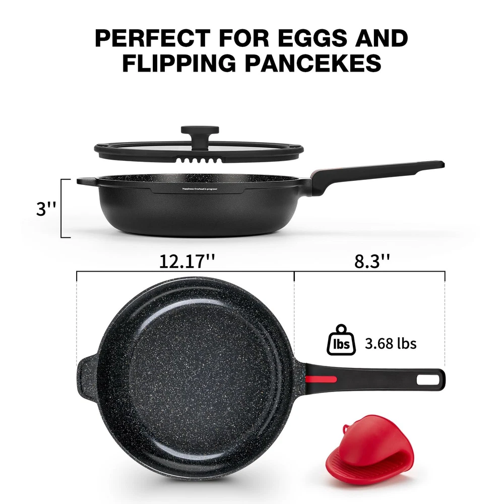 Eco-Friendly Double Non-Stick Ceramic Coating: Experience exceptional 5X nonstick performance with our advanced coating. Enjoy healthier cooking that’s 100% PTFE and PFOA-free, requiring less oil and making cleanup a breeze. All-In-One Versatility: The large frying pan combines lasting durability with a lightweight design, made possible by its die-cast construction. Perfect for a variety of cooking tasks, it excels at sautéing, poaching, braising, and deep frying. Heat-Resistant for Added Safety: The handle features heat-resistant silicone wrapping, an auxiliary grip, and includes a silicone oven mitt for excellent heat insulation and secure handling. Glass Lid with Built-In Strainer: The silicone-rimmed glass lid includes a built-in strainer for easy soup pouring and lets you monitor cooking progress without lifting the lid. Compatible with All Stovetops: Designed for gas, induction, electric, halogen, and ceramic stovetops, it heats quickly and evenly for versatile cooking.