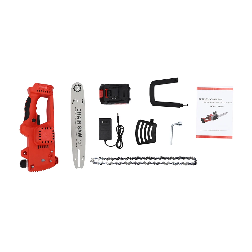 Specifications Style: Modern Model: 18D04 Color: Red, Black Battery Voltage: 21V Battery Capacity: 3000mAh Plug Standard: US Standard Power Source: Battery Powered Motor Type: Brushless Motor Assembly Required: Yes Guide Bar Length: 30.48cm/12 in Adapter Model: SRJ210100 Adapter Input: AC 100-240V, 50/60HZ, 0.8A Adapter Output: 21V 1.0A Gross Weight: 3.5kg/7.72 lbs Package Included 1* Chainsaw Mainframe 1* Guide Bar 1* Chain 1* Battery 1* Charger 1* Protective Baffle 1* Handel 1* Wrench 1* English Manual 12 Inch Electric Chainsaw Portable Handheld Cordless Chainsaw w/ Battery&Charger Welcome~ Description Using traditional axes to cut wood is inefficient and very tiring, so you can choose our mini cordless chainsaw for improving efficiency in pruning, wood cutting, and gardening. It boasts a high quality and provides a great cutting effect, all while featuring a lightweight and compact design. With a battery-powered power source, it can be conveniently used for outdoor operations, emergencies, and in locations without access to sockets. Having it will make your work easier and simpler! Key Features Sturdy and Durable: The product is made of high-quality materials, using exquisite craftsmanship, with high strength, wear resistance , and long service life. High Efficiency: Thanks to its premium motor, strong power, sharp chain, long guide plate (12 in), and fast chain speed, this item can achieve a large cutting diameter with less power consumption, allowing you to prune, saw, and log with less time and effort. Environment-friendly: Adopting rechargeable lithium batteries as the power source without plugging in wires, this chainsaw is more environmentally friendly compared to other gasoline-powered chain saws because it does not generate gas and emissions. Long-lasting Battery : The large-capacity (3000mAh) lithium battery can make the product work for long hours, so do not have to worry about frequent charging and power emergencies affecting the work. The equipped charger ensures timely charging for the battery. Thoughtful Design: The oil level window allows you to monitor changes in the oil level in real-time to facilitate timely refilling. Good Heat Dissipation Performance: The heat-sink holes on the machine ensure a good heat dissipation effect, which can effectively avoid excessive body temperature, thereby extending the service life of the machine. High Safety: The safety lock and on/off trigger provide a double safeguard against accidental activation and protect your use. Easy to Use: Easy to Use : With the lightweight (gross weight: 7.72 lbs ), compact design( 25.59 in total length), and a detailed English manual, you can easily operate the cordless chainsaw. Even the elderly and women can easily operate and control it, making cutting and trimming a pleasure. Customer Service: We aim to provide high-quality products and services. If you have any questions, please feel free to contact us. We will reply as soon as possible and solve the problem for you. Details Protective Baffle: It reduces workpiece debris splashing and protects you from injury during cutting. Ergonomic Handles: The ergonomic handle has textured skin, gives you a comfortable grip without slipping, absorbs shock, and reduces hand fatigue even in long-term use. The auxiliary handle is easy to control to achieve a good balance and high-cutting performance. Application It is widely used in gardens, parks, farms, ranches, pastures, orchards, greenhouses, forests, camping, etc., and can be used for forest harvesting, wood cutting, small branch pruning, bush pruning, gardening, home woodworking, bamboo sawing, logging, DIY crafts, and so on. Specifications Style: Modern Model: 18D04 Color: Red, Black Battery Voltage: 21V Battery Capacity: 3000mAh Plug Standard: US Standard Power Source: Battery Powered Motor Type: Brushless Motor Assembly Required: Yes Guide Bar Length: 30.48 cm/12 in Adapter Model: SRJ210100 Adapter Input: AC 100-240V, 50/60HZ, 0.8A Adapter Output: 21V 1.0A Gross Weight: 3.5kg/7.72 lbs Total Height(Battery Included): 65cm/25.59in Battery Size(L*H): 20*14cm/7.87*5.51in Package Size: 16*20.5*36cm/6.3*8.07*14.17 in Package Included 1* Chainsaw Mainframe 1* Guide Bar 1* Chain 1* Battery 1* Charger 1* Protective Baffle 1* Handel 1* Wrench 1* English Manual Notes Please note that gloves (not included) should be worn if necessary. Please keep the product out of reach of children to avoid injury. Please use this product to cut wood within the applicable size range. Please note that this product does not come with lubrication oil. Please read the English manual completely before use, and pay particular attention to the safety instructions included. Please fully charge it before your first use. Please confirm the direction and tightness of the chain before use. If it is not used for a long time, please remember to fully charge the battery first for a better experience the next time you use it. Please allow the slight color difference caused by the shooting light and 1-3cm error due to manual measurement, and make sure you do not mind before you order. tu1 Payment Delivery details Terms of sales About us Contact us Payment We accept ebay payment 。 Fees such as import duties, taxes are not included in the item price or shipping costs. These charges are the buyer's responsibility. Delivery details Shipping: 2-9 working days to: USA Terms of sales We maintain high standards of excellence and strive for hundred percent customer satisfaction. Feedback is very important to us. We hope that you contact us immediately before you give neutral or negative feedback, so that we can address your concerns. It is impossible to address issues if we do not know about them! About us Your satis faction is our ultimate goal. We work hard to earn your trust and future business. Our certified technicians have tested each item before shipping. The unit comes with 1 year limited warranty on all manufacturing defects. a) If you receive a d